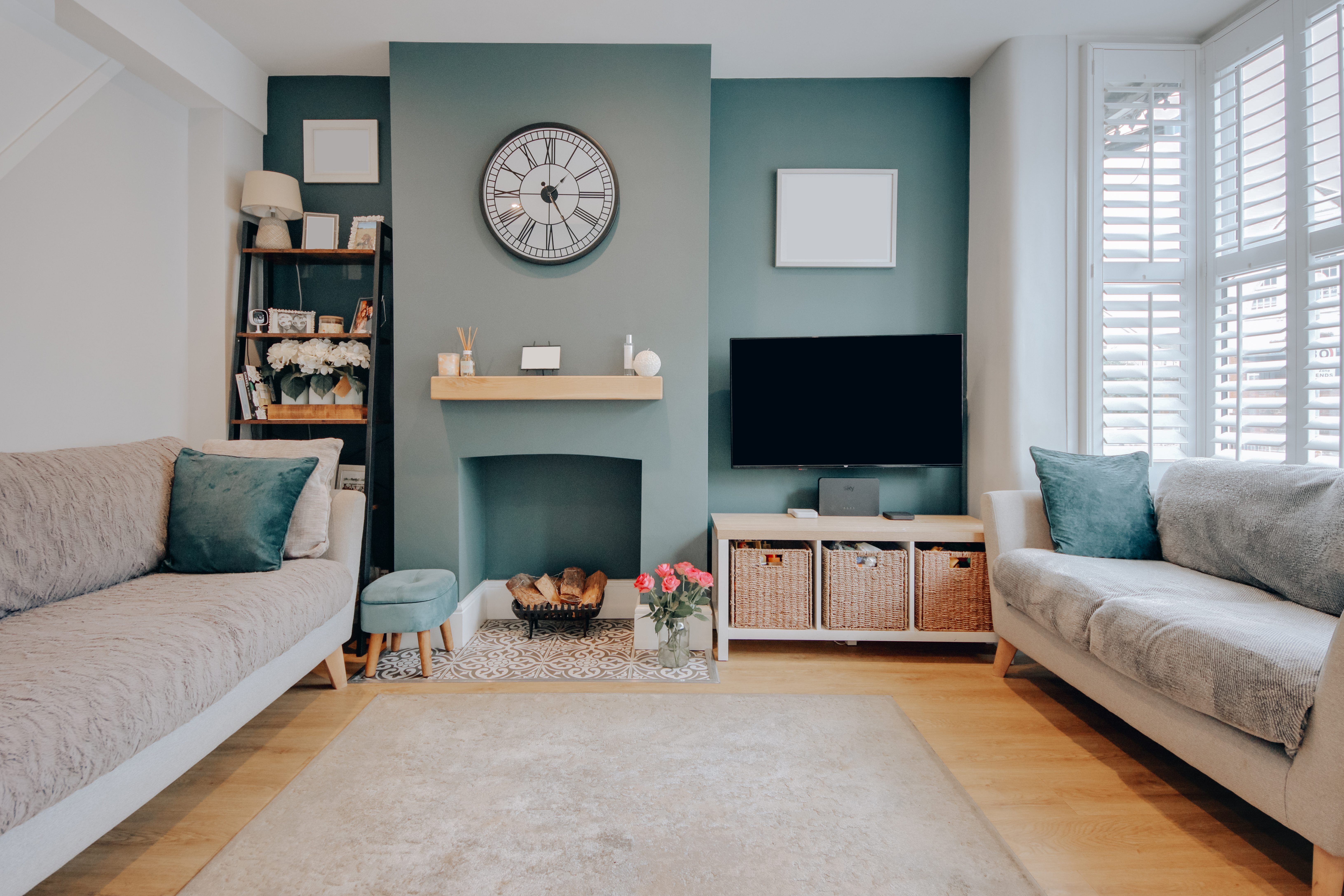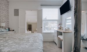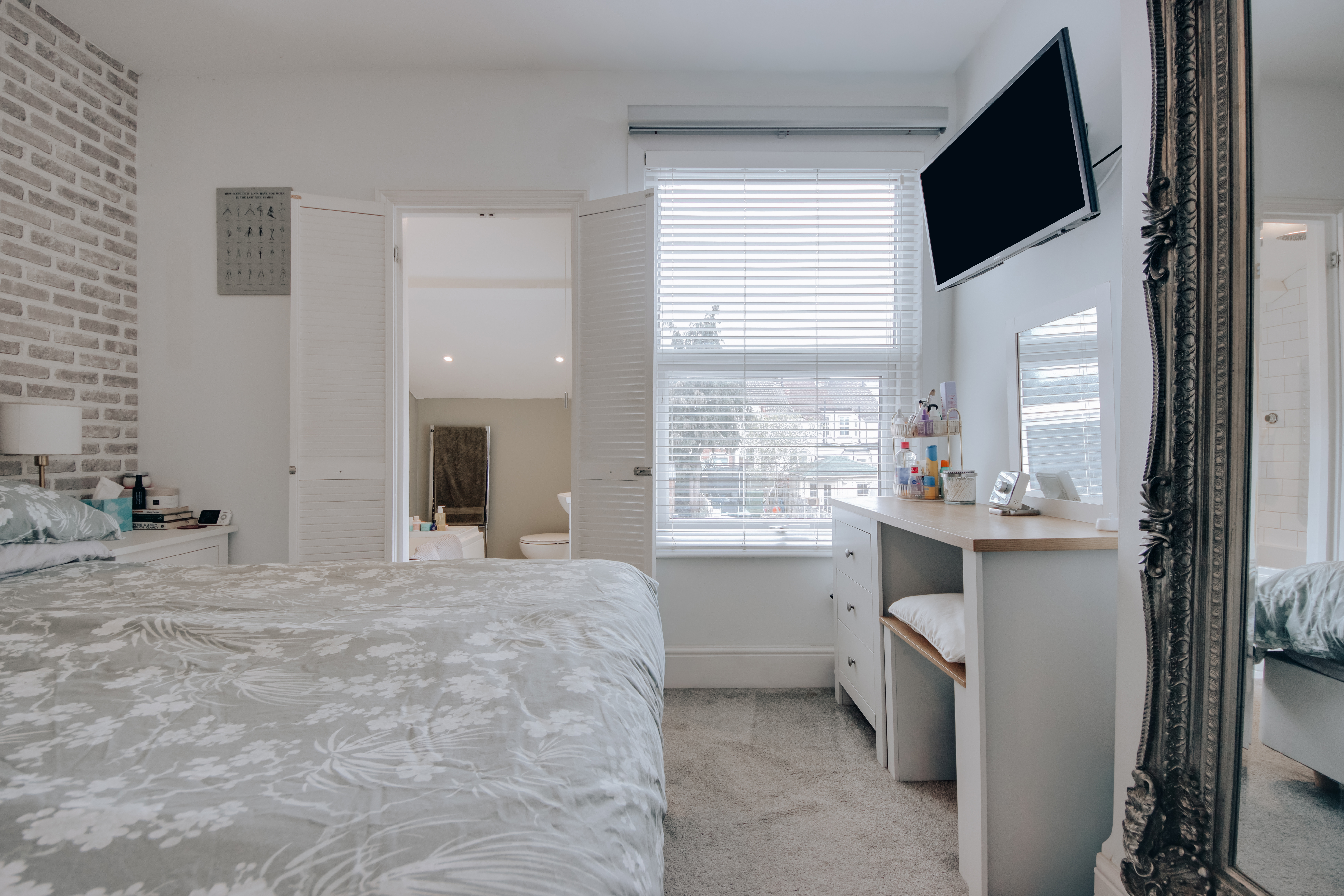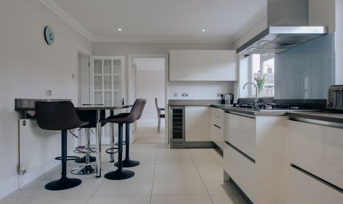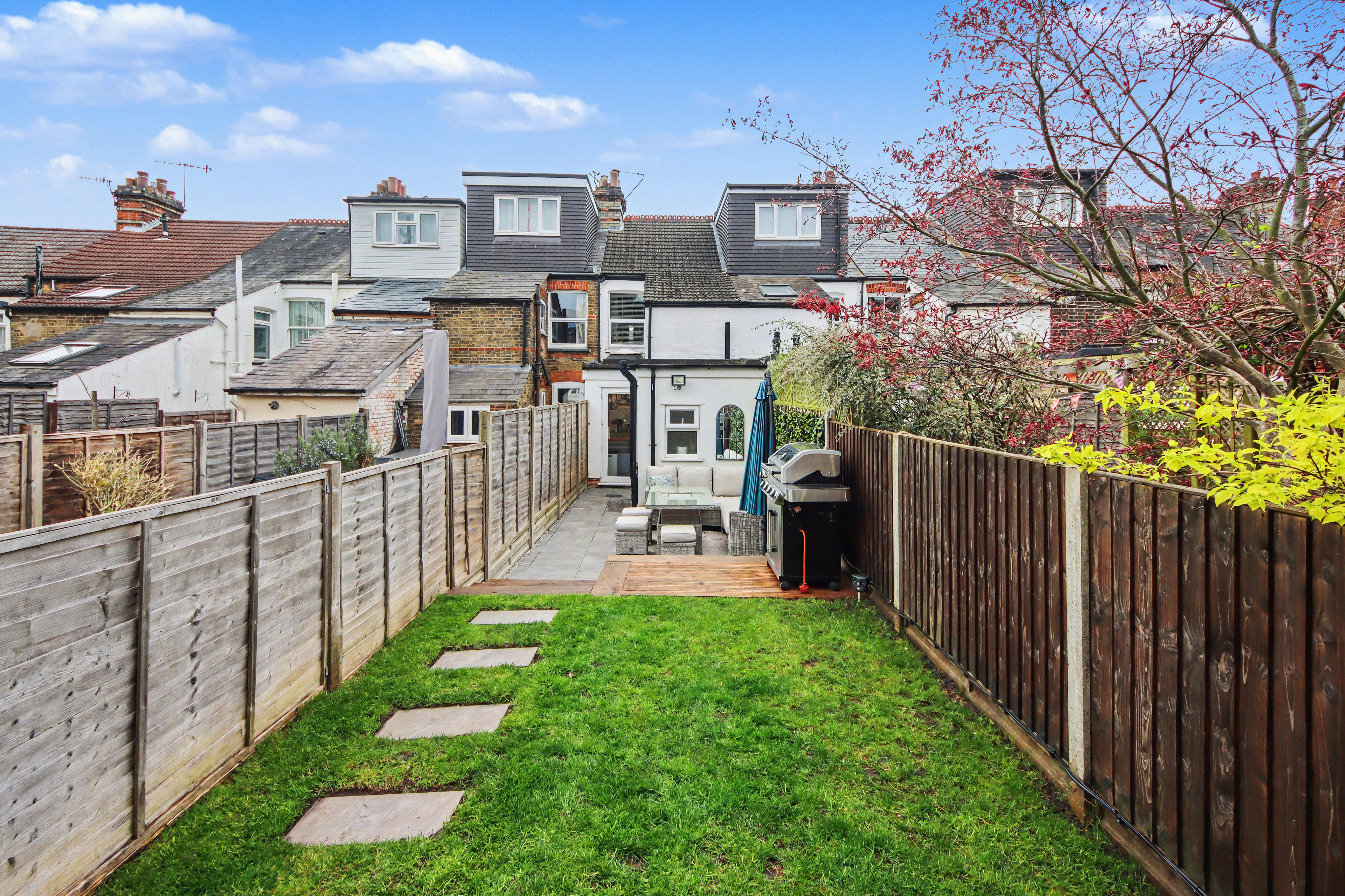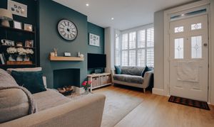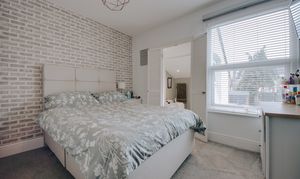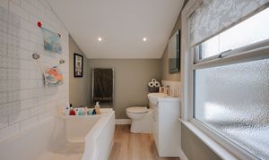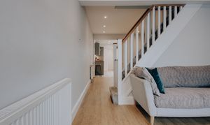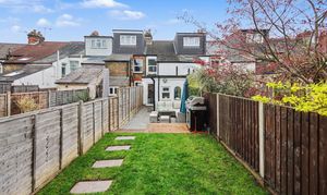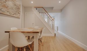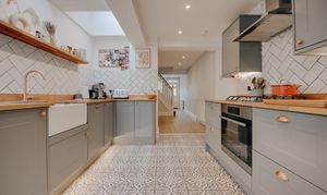 Inside, the living room is a near-perfect square at 10'4" x 10'8", with a box-bay window drawing in generous natural light. Built-in alcove storage and a neutral palette make it equally suited to entertaining and everyday living. The staircase acts as a natural partition within the open-plan layout, with a designated dining zone beyond. Bespoke under-stair cabinetry and an alcove beside the chimney breast, ideal as a study corner, make excellent use of the space. The kitchen is the result of a considered rear extension and is the clear centrepiece of the home. Skylights draw in soft northern light and warm westerly sun throughout the day. Classical cabinetry, integrated appliances including a built-in microwave and oven-grill, and generous counter space are complemented by a separate utility area. A ground floor bathroom with statement floor tiles and contemporary fittings completes the level. Upstairs, two well-proportioned double bedrooms. The principal room has a large window, ample space for freestanding cabinetry along the nearside wall, and its own en-suite. The second is equally spacious, versatile enough for guests, a home office, or a nursery.