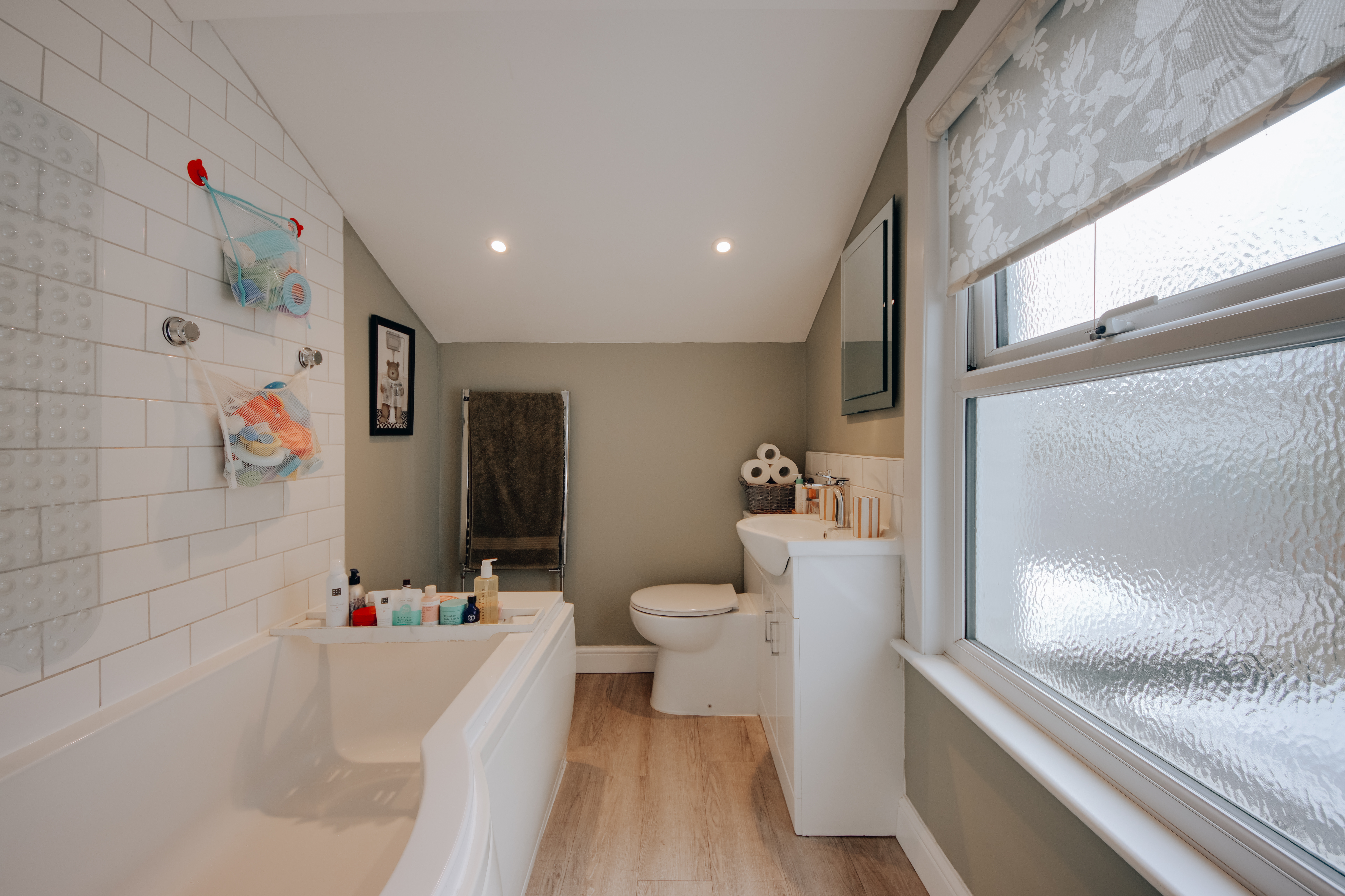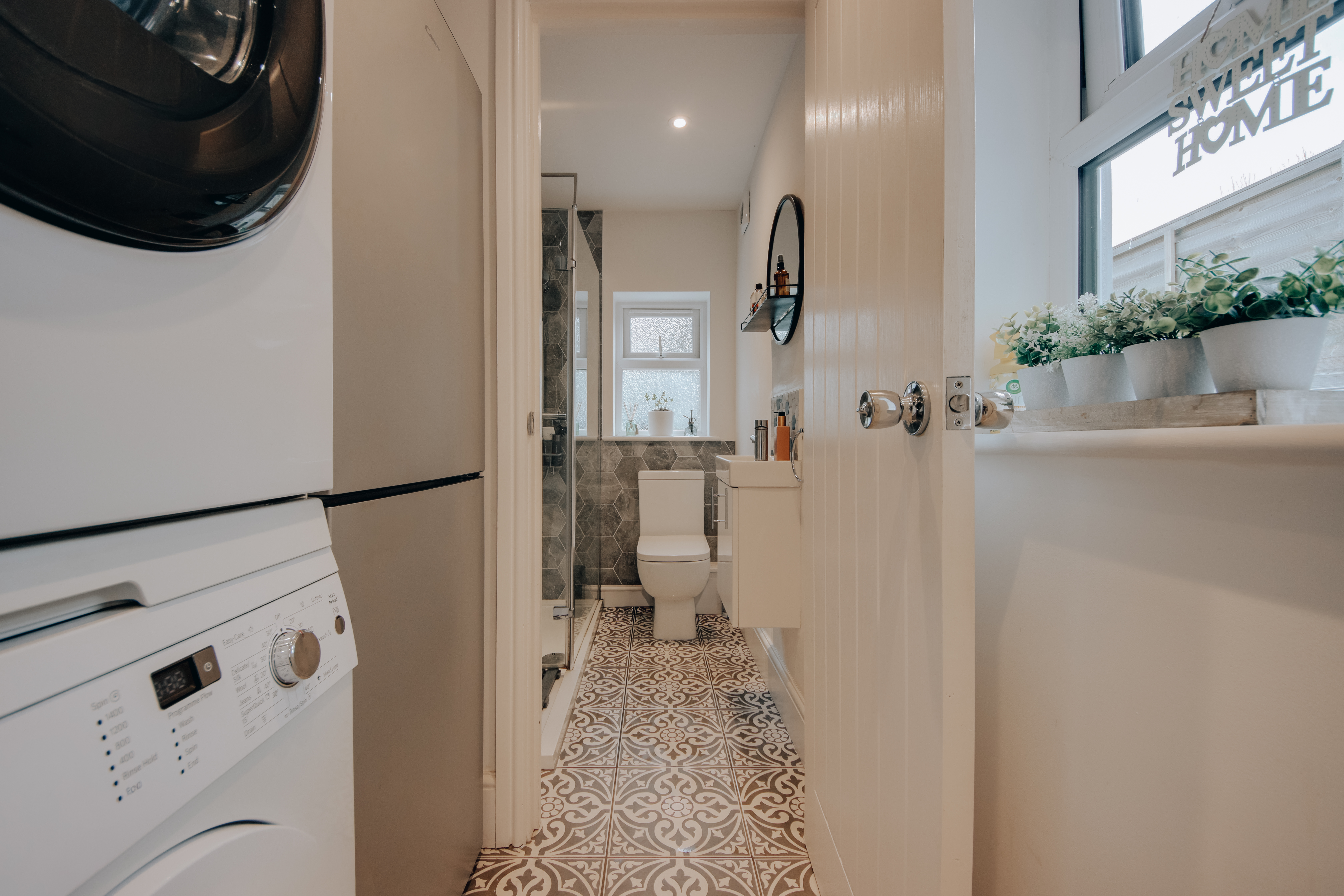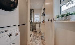 - Ground floor bathroom with statement floor tiles and contemporary fittings.