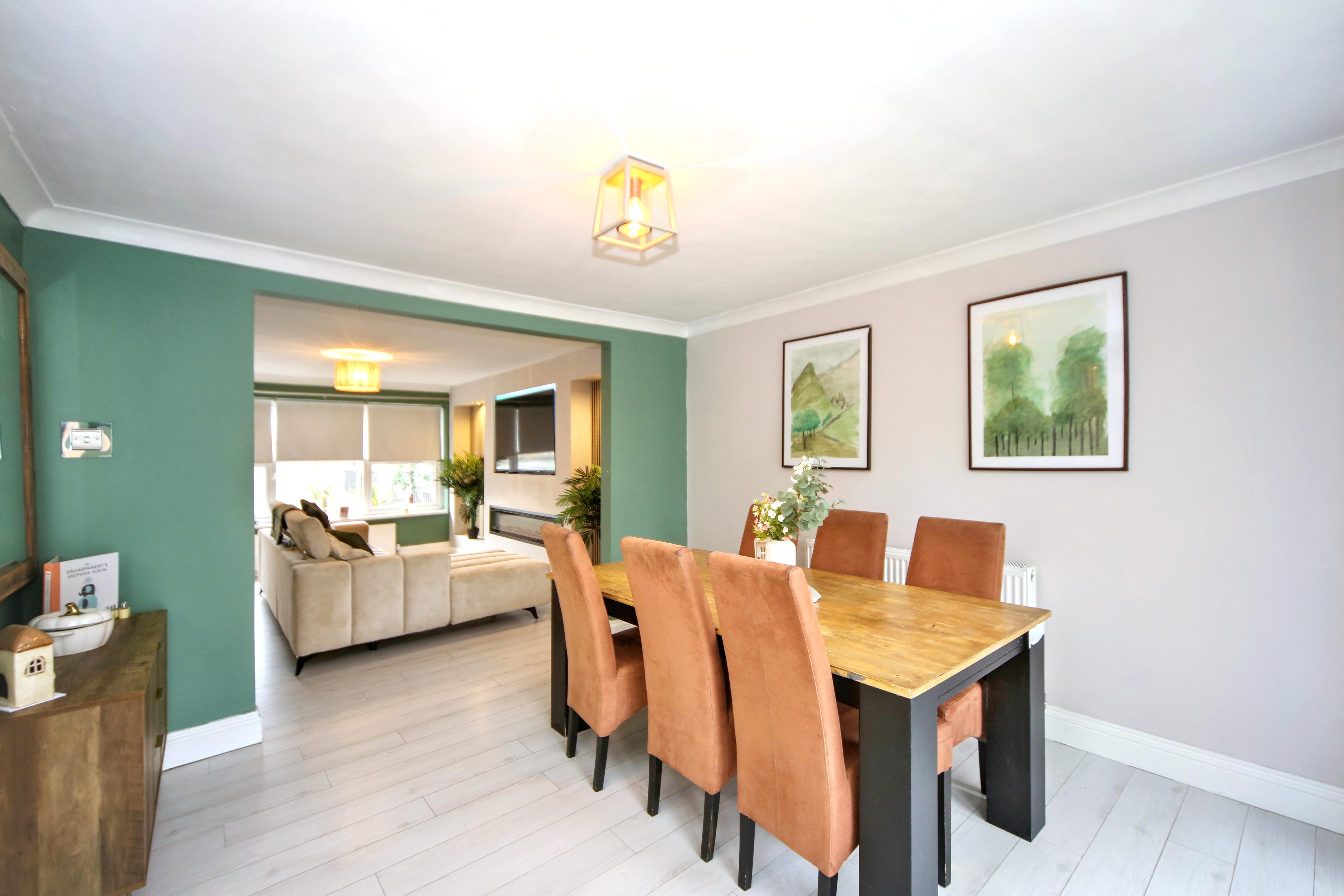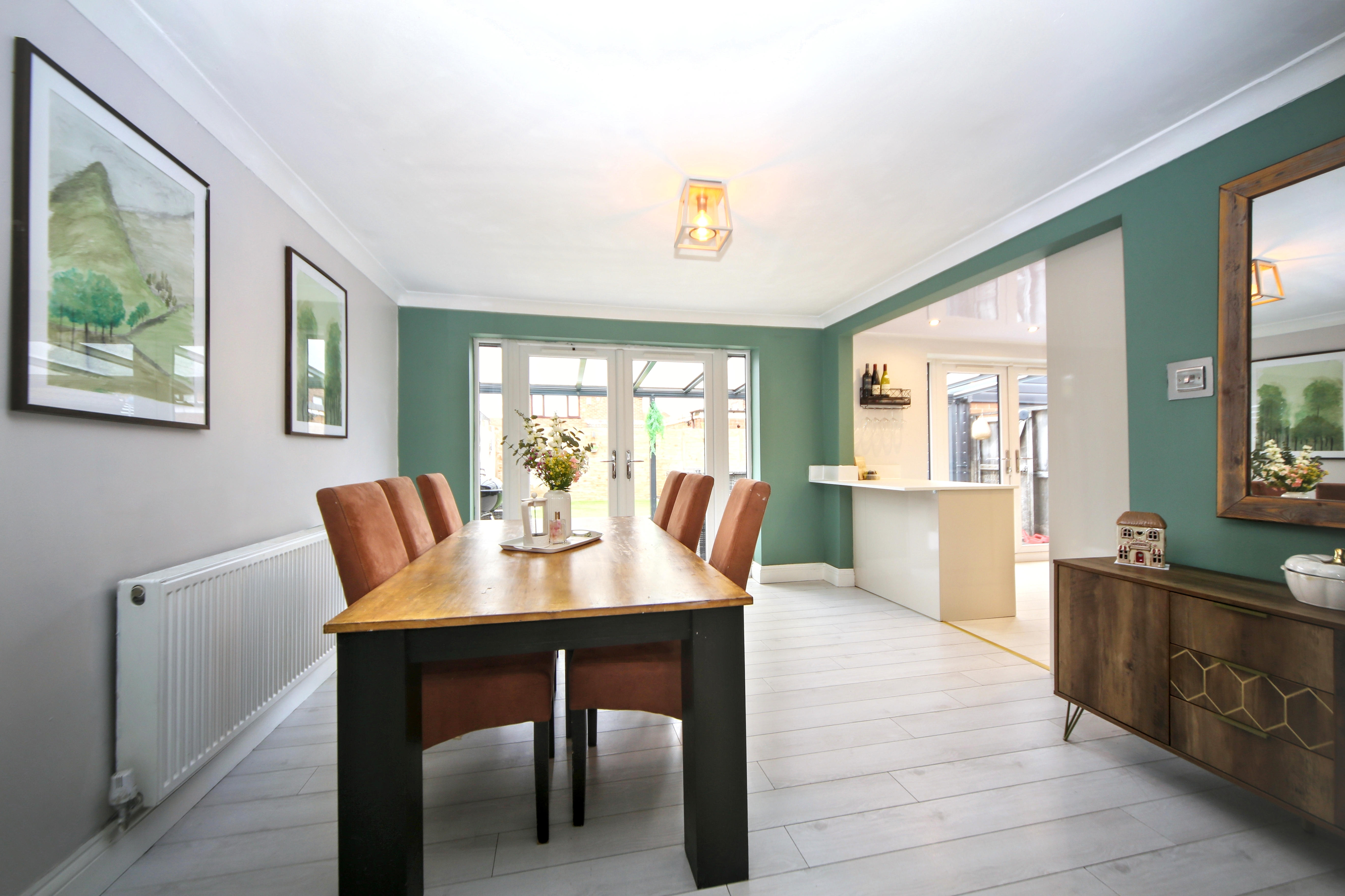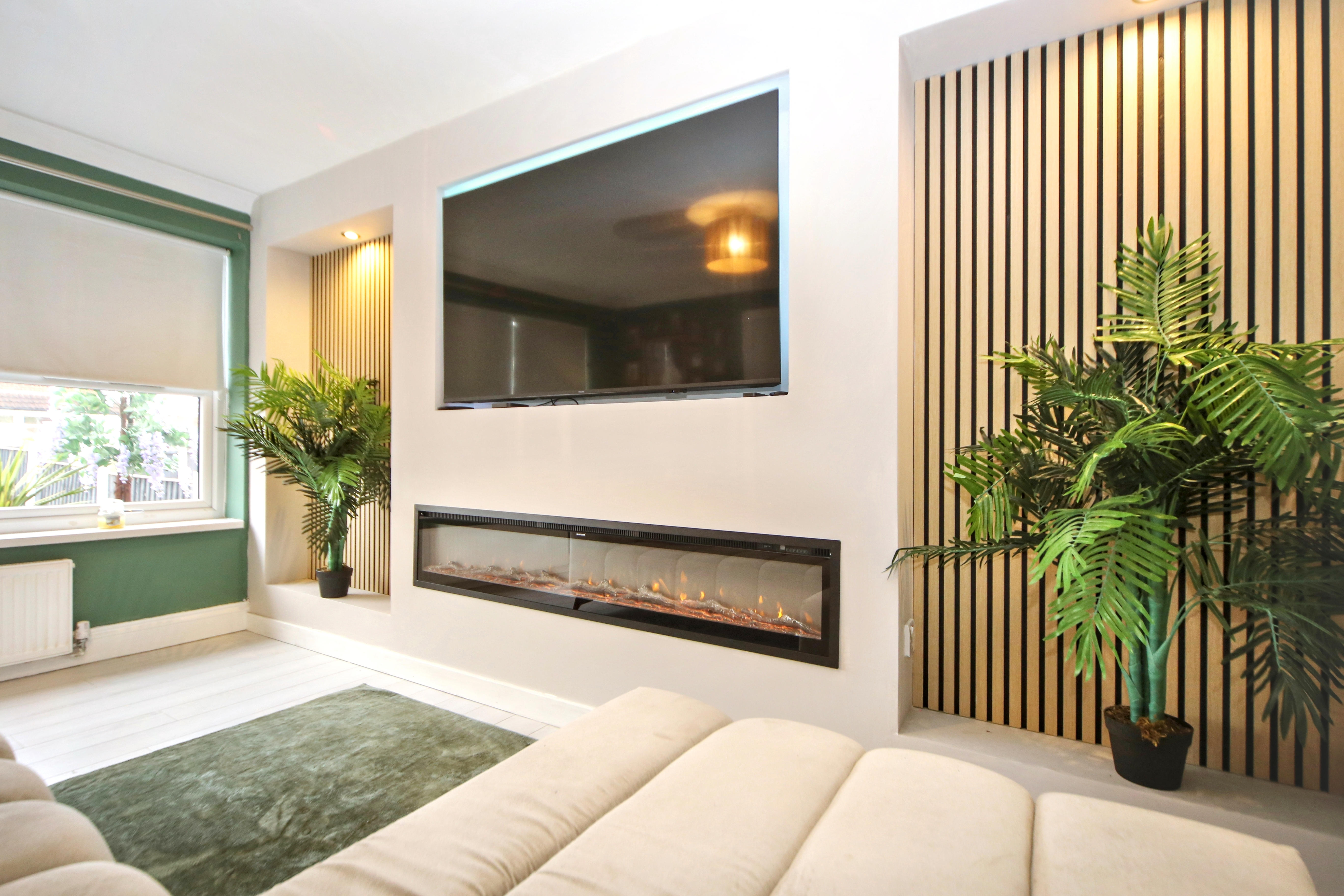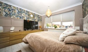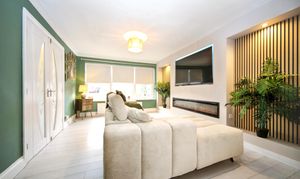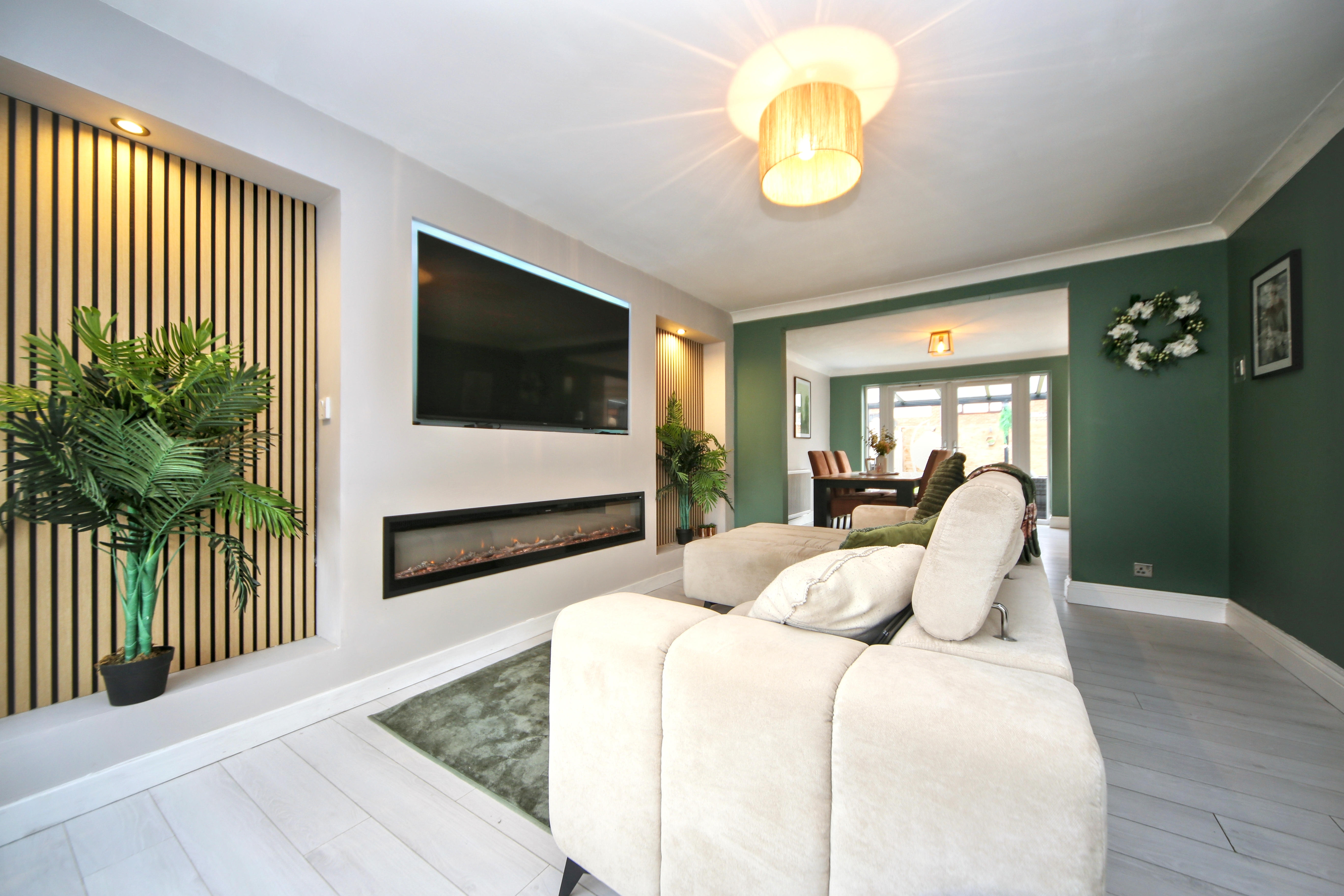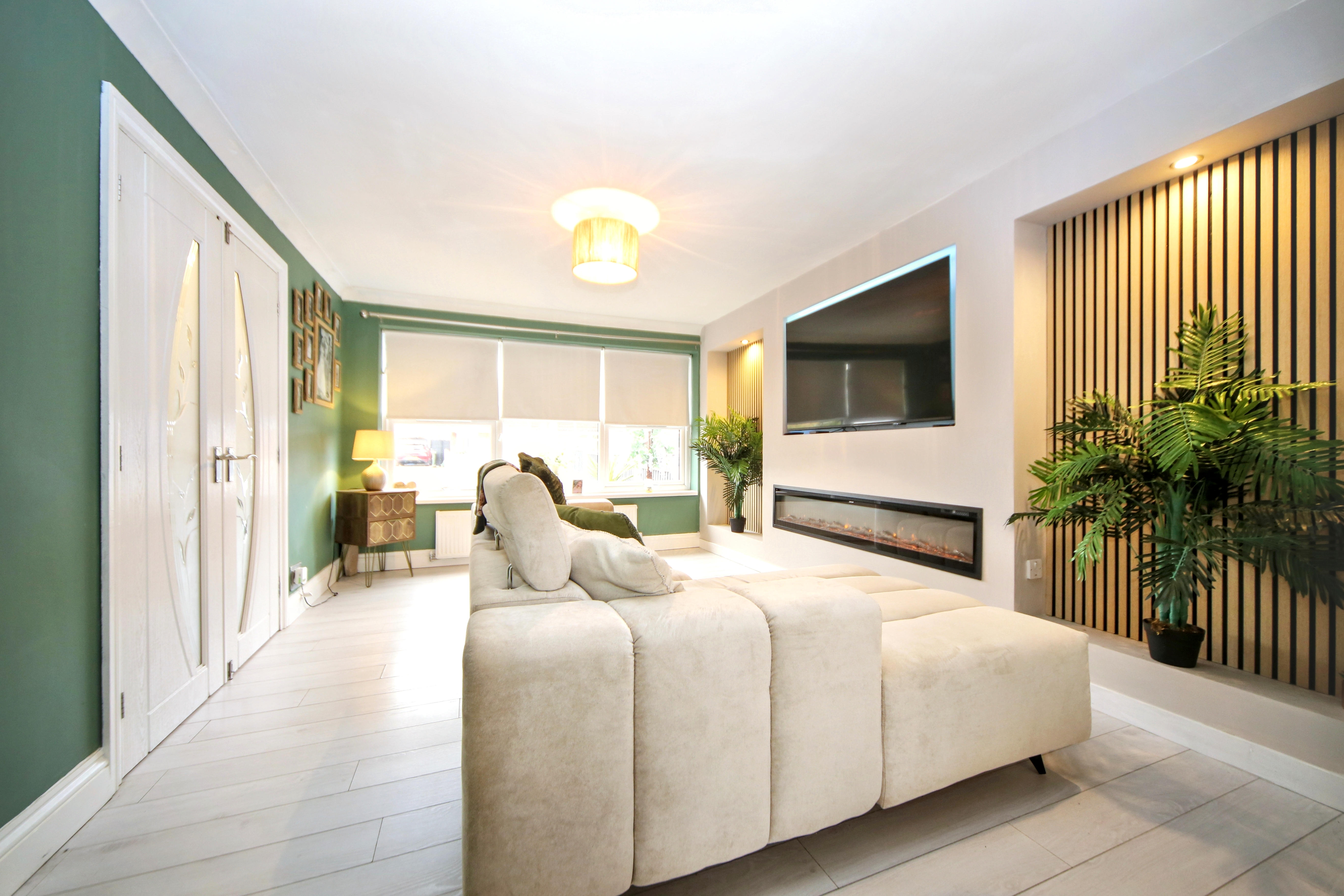 Upon entering, you are welcomed by a spacious entrance hall that leads to a well-proportioned ground floor bedroom and a stunning lounge. The lounge is a standout feature of the home, complete with a modern media wall, creating a perfect space for relaxation and entertainment. From here, the layout flows seamlessly into a dining area and onwards into a contemporary, generously sized kitchen. The kitchen is finished to a high standard and provides direct access to the rear garden through double doors.