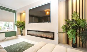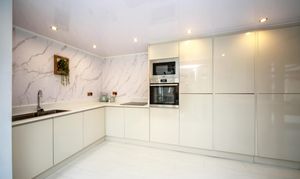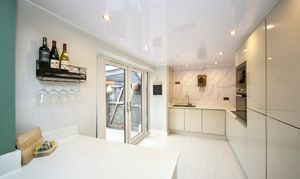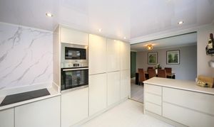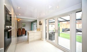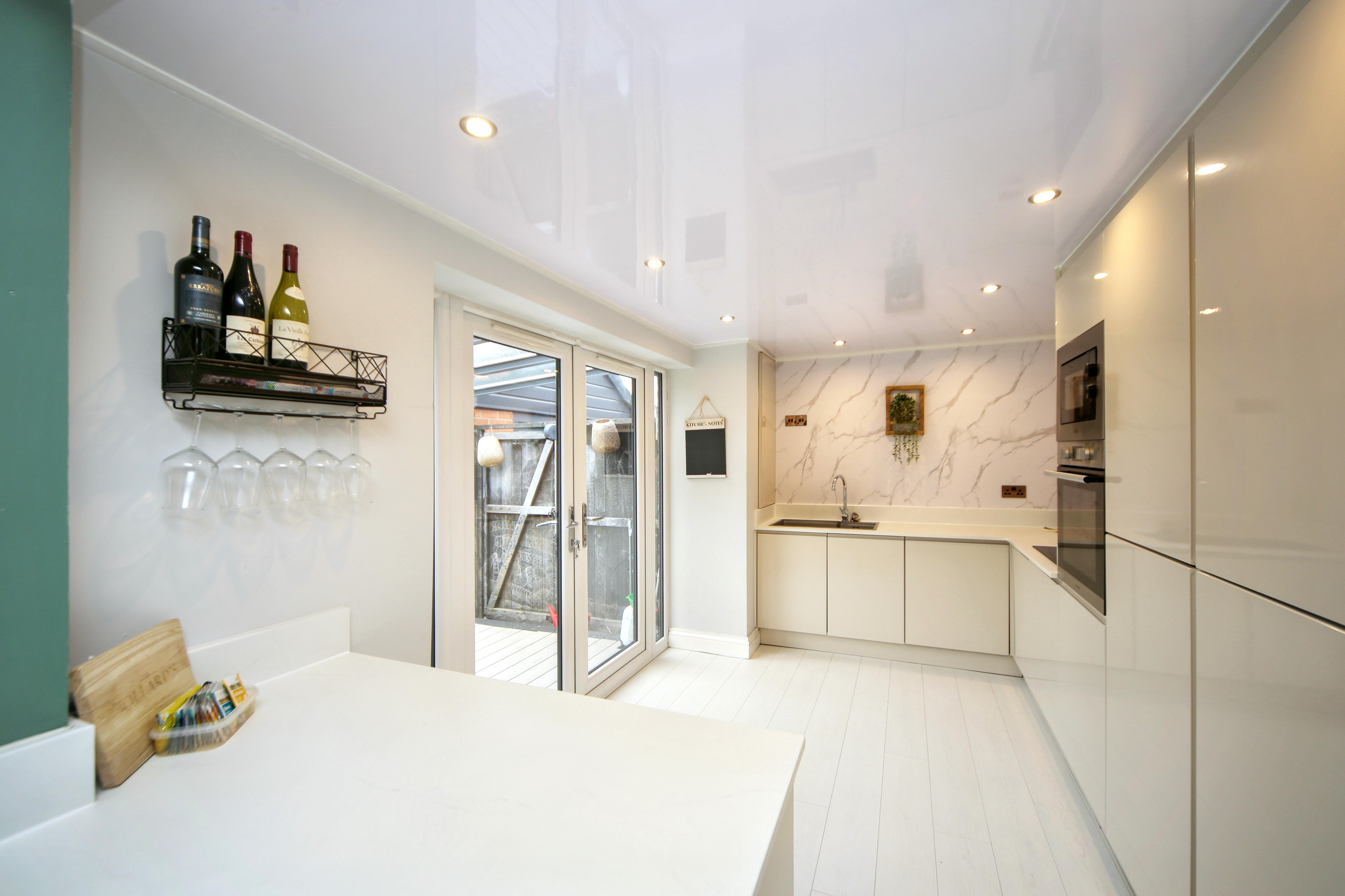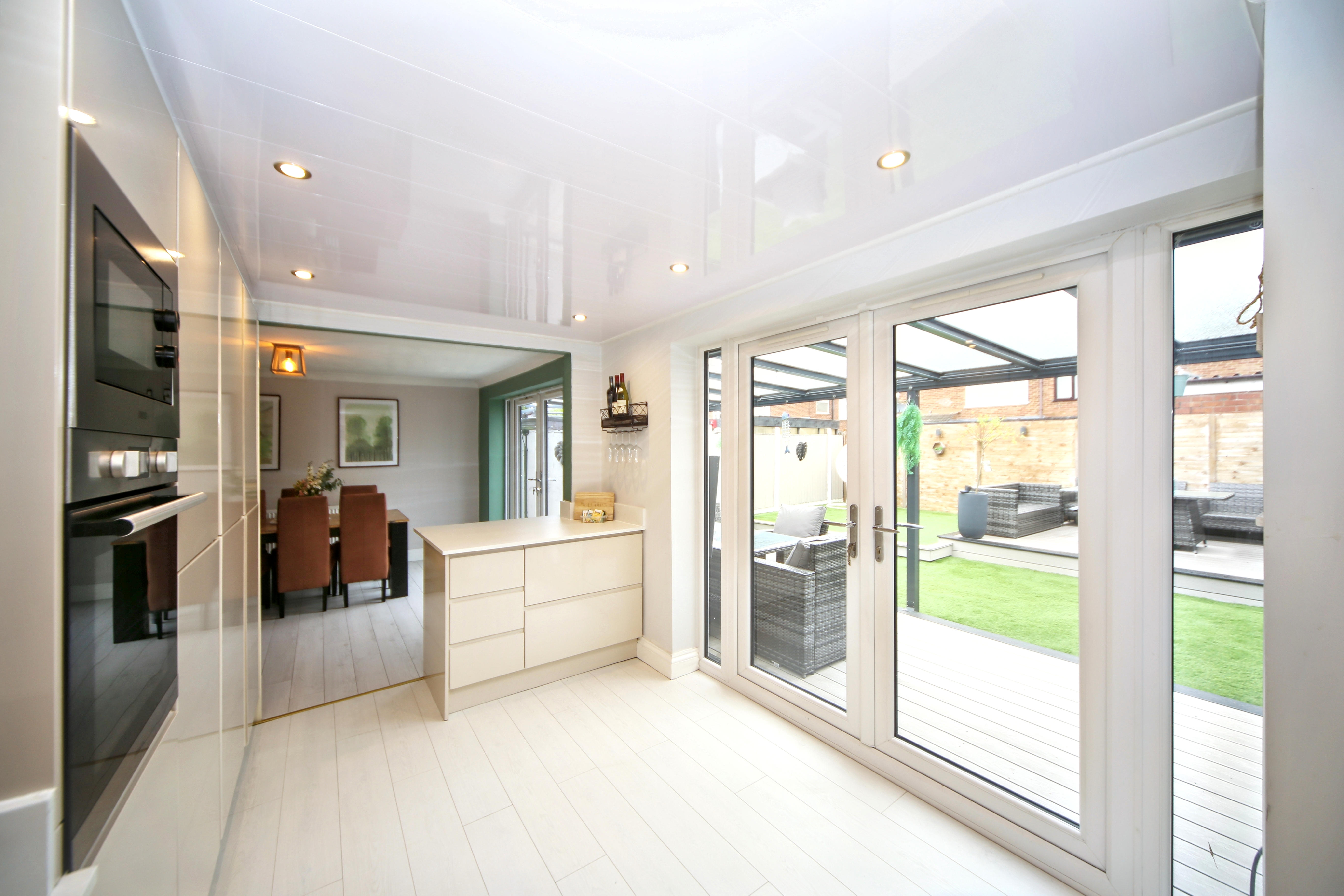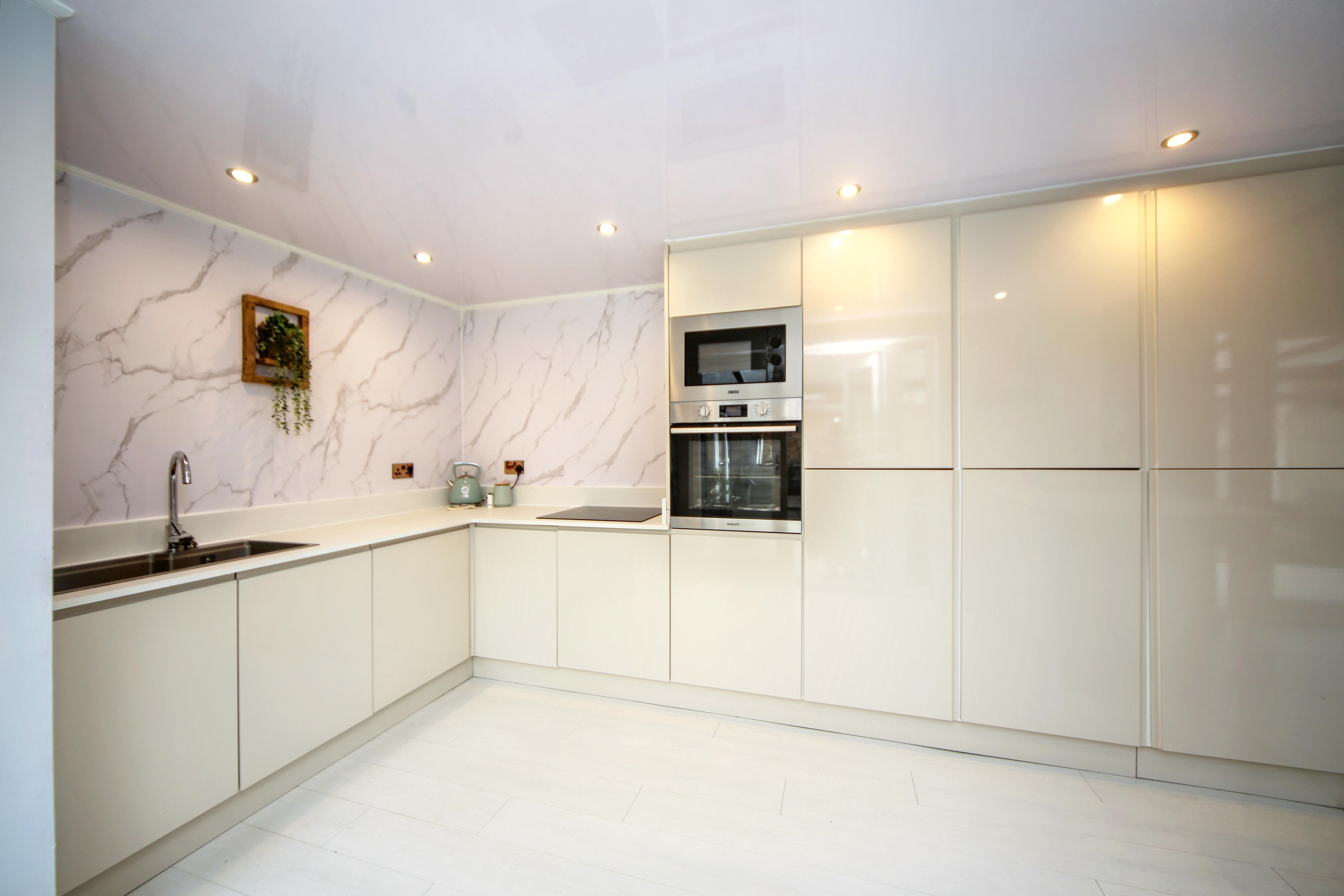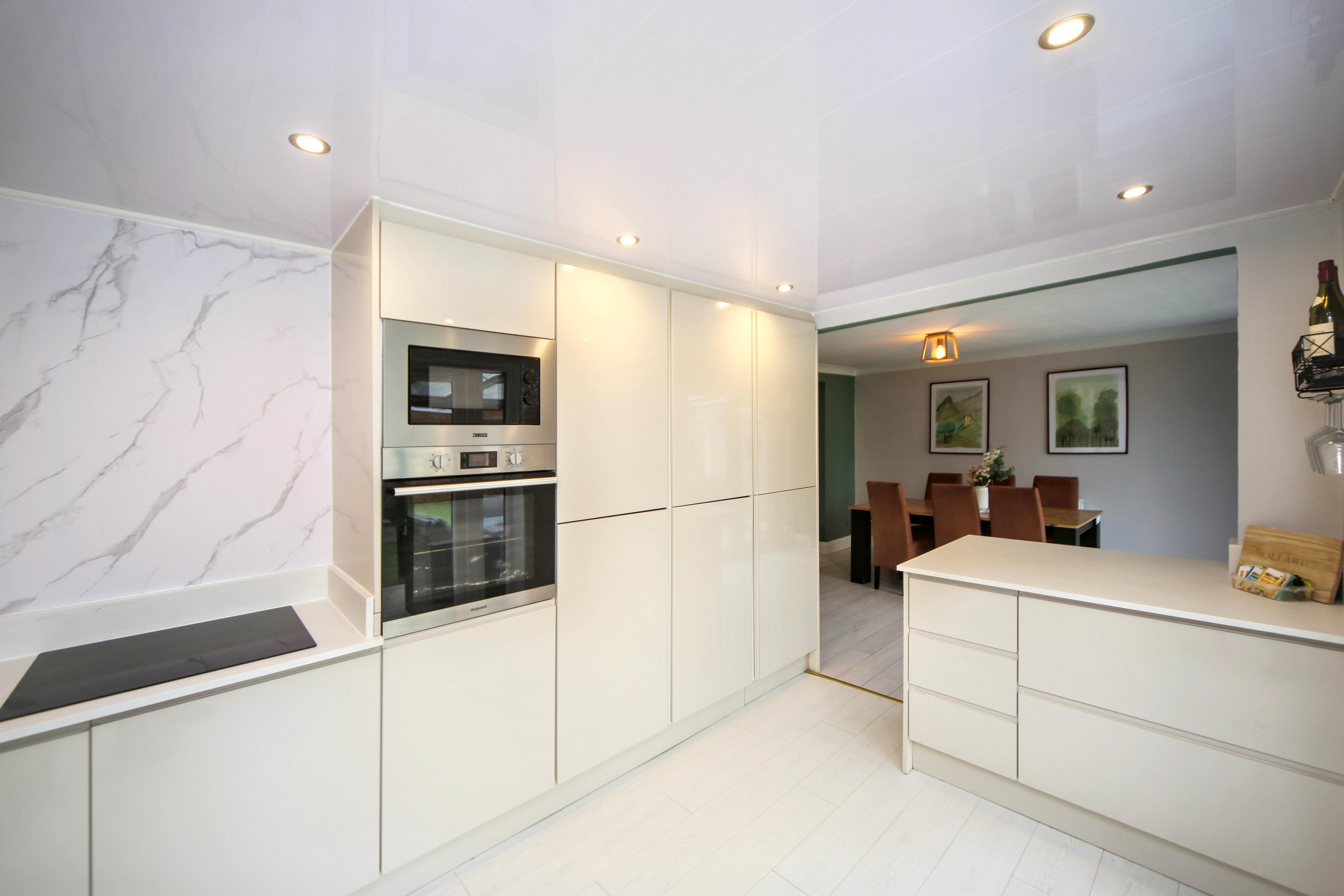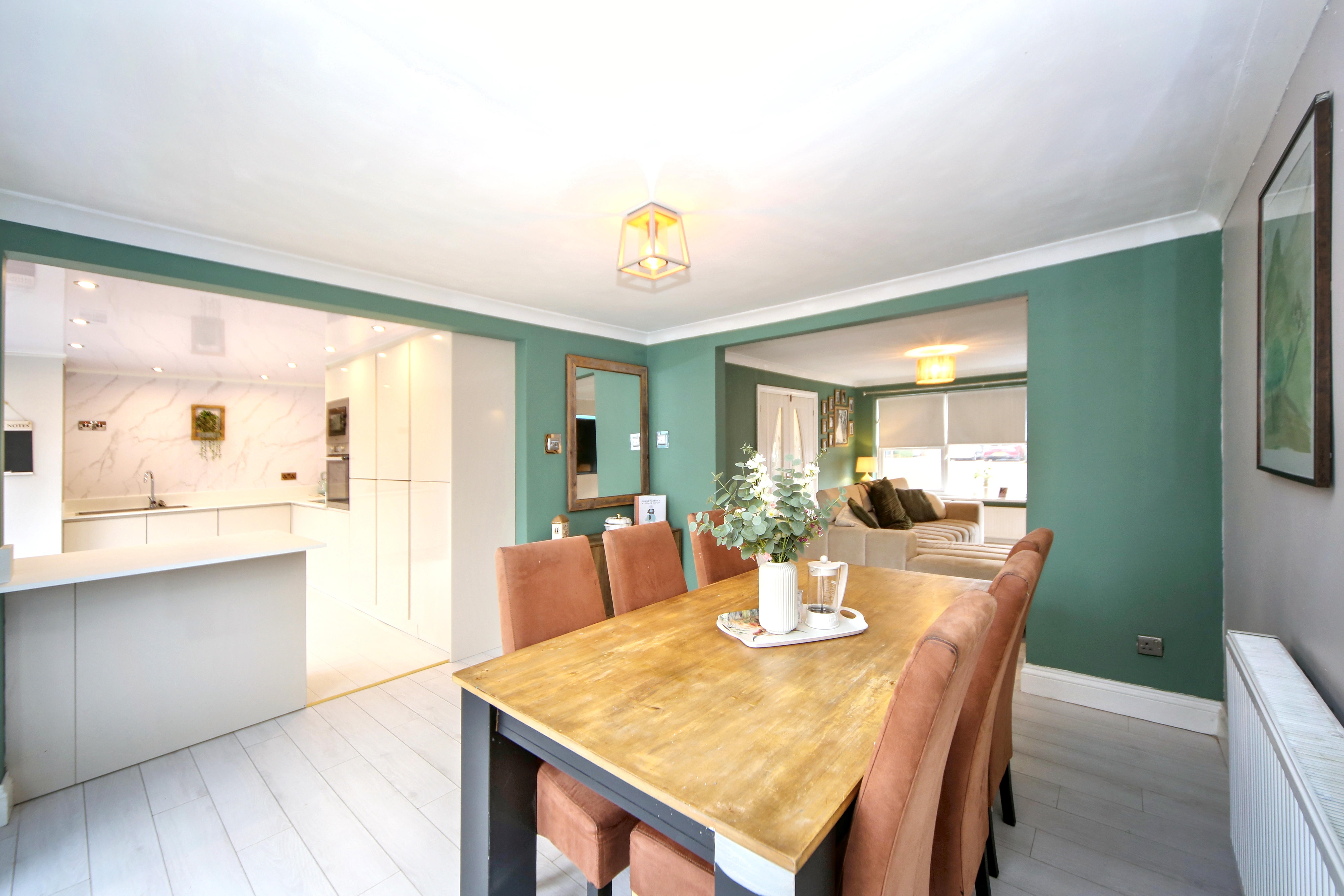 Upon entering, you are welcomed by a spacious entrance hall that leads to a well-proportioned ground floor bedroom and a stunning lounge. The lounge is a standout feature of the home, complete with a modern media wall, creating a perfect space for relaxation and entertainment. From here, the layout flows seamlessly into a dining area and onwards into a contemporary, generously sized kitchen. The kitchen is finished to a high standard and provides direct access to the rear garden through double doors.