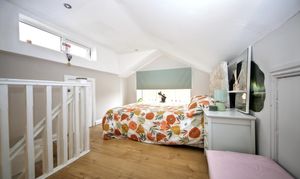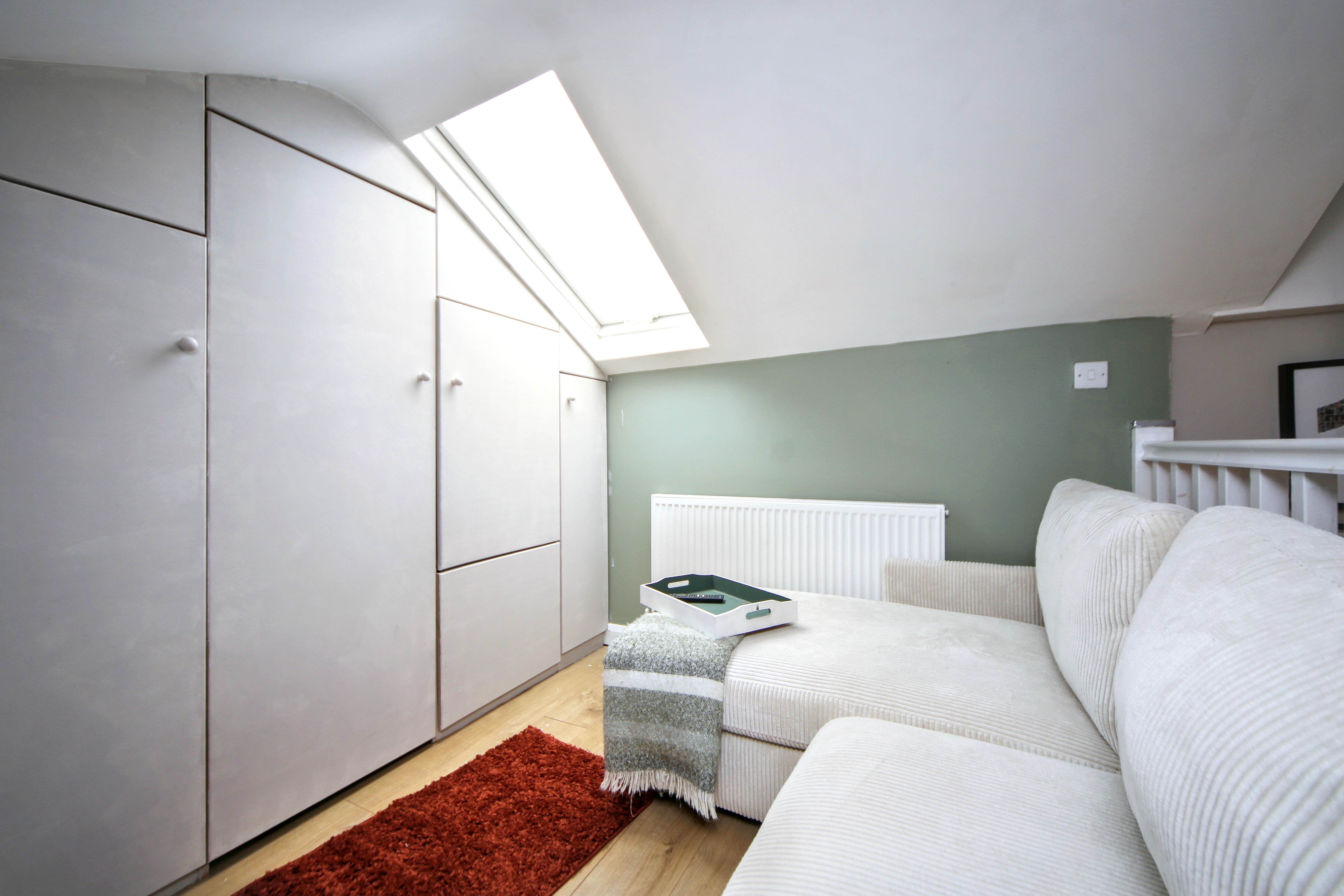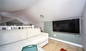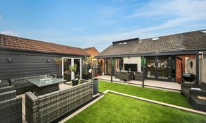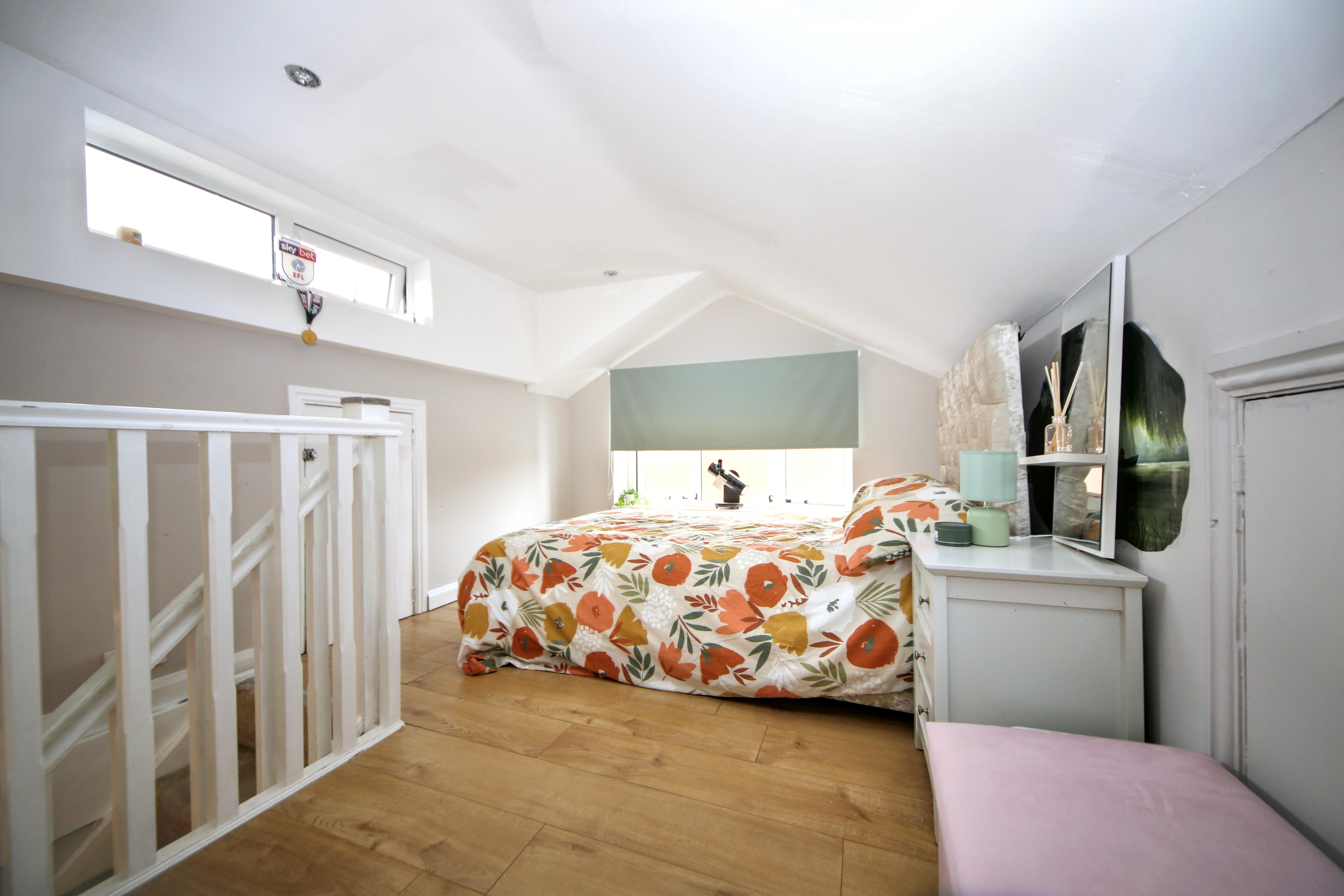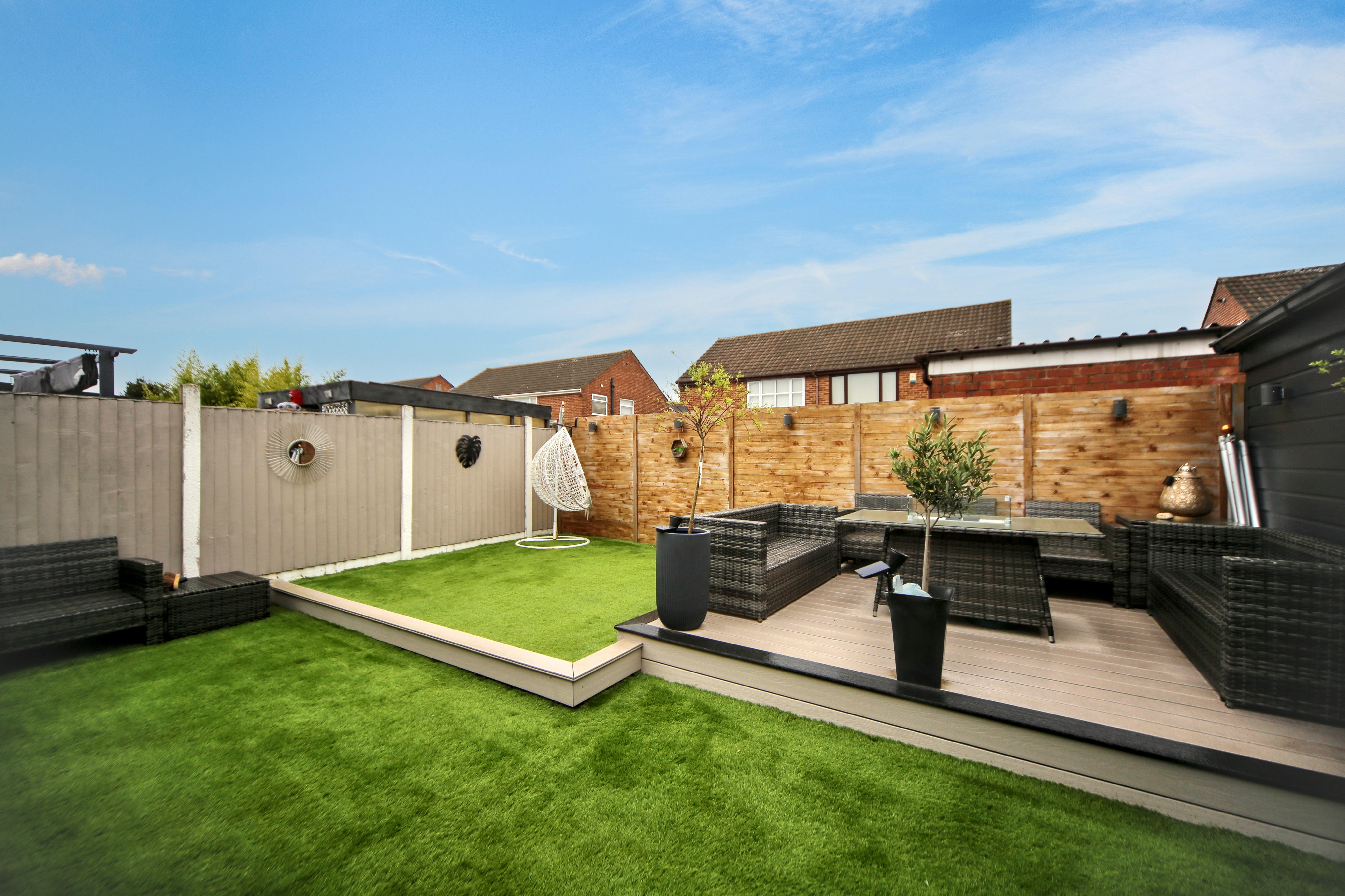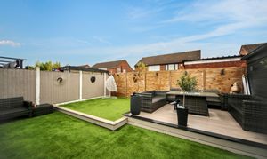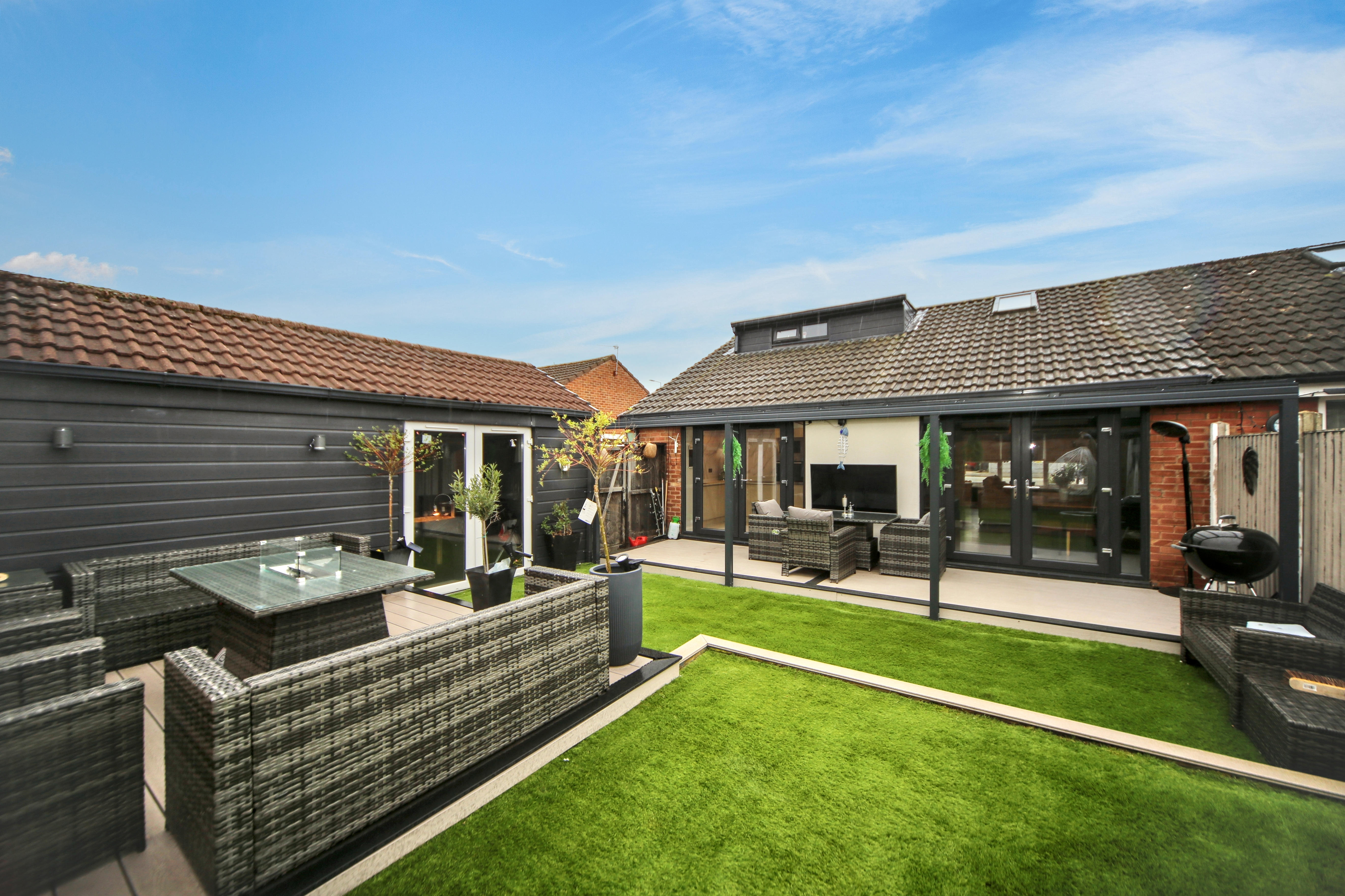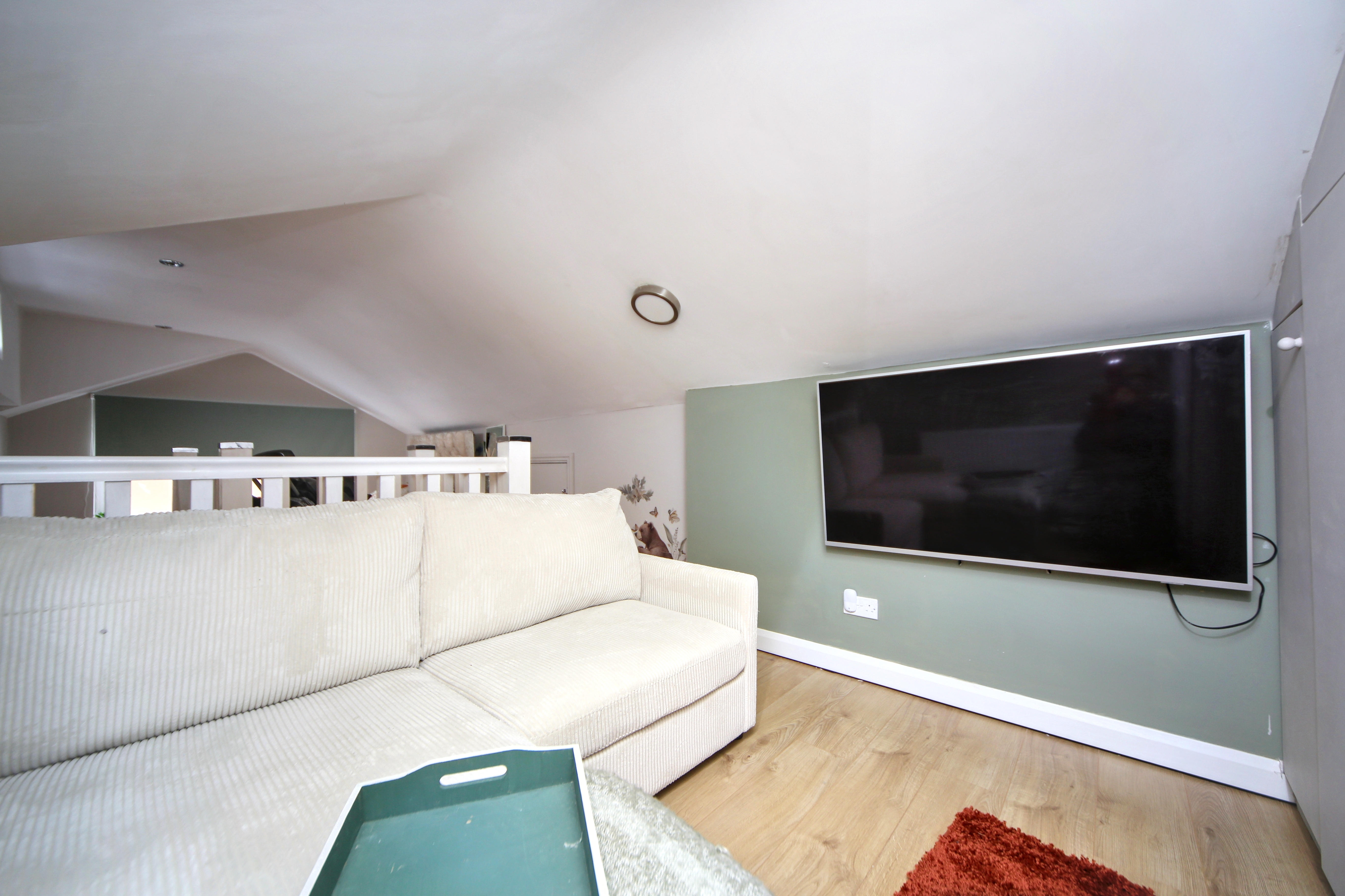 Externally, the property continues to impress with a glass-roof veranda—ideal for year-round use—and a low-maintenance artificial lawn, creating a perfect space for outdoor dining and entertaining. A staircase leads to the upper level, where you will find a versatile additional bedroom or TV snug, offering flexible living accommodation to suit your needs. This property combines modern design with practical living space.