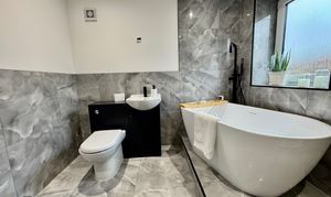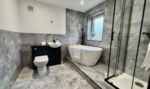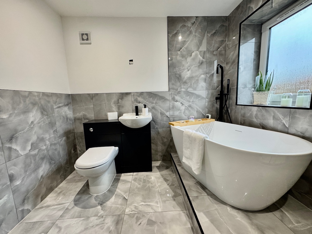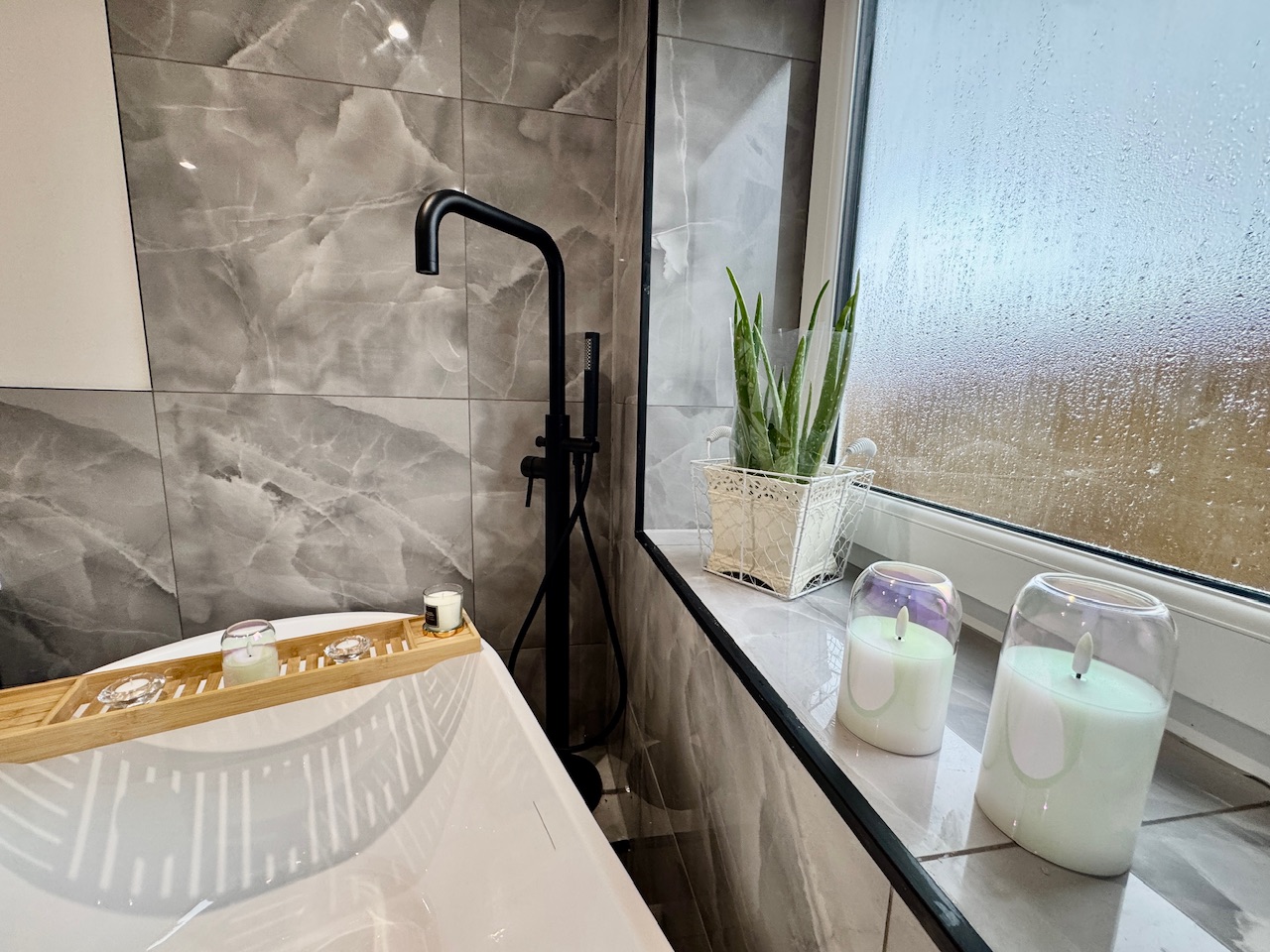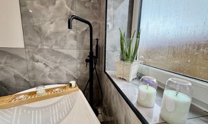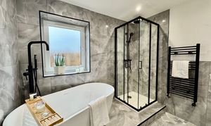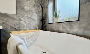 The fully renovated bathroom is a luxurious retreat, featuring a freestanding bath and a separate shower for your convenience. The property offers stunning views to the front, adding a touch of serenity to your daily routine. With a large driveway and a landscaped garden, this home provides ample space for outdoor activities and relaxation.
