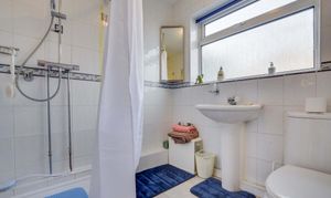 With double glazed window to the side elevation, tiled walls, tile effect floor, wash hand basin, low-level WC, shower area, radiator.