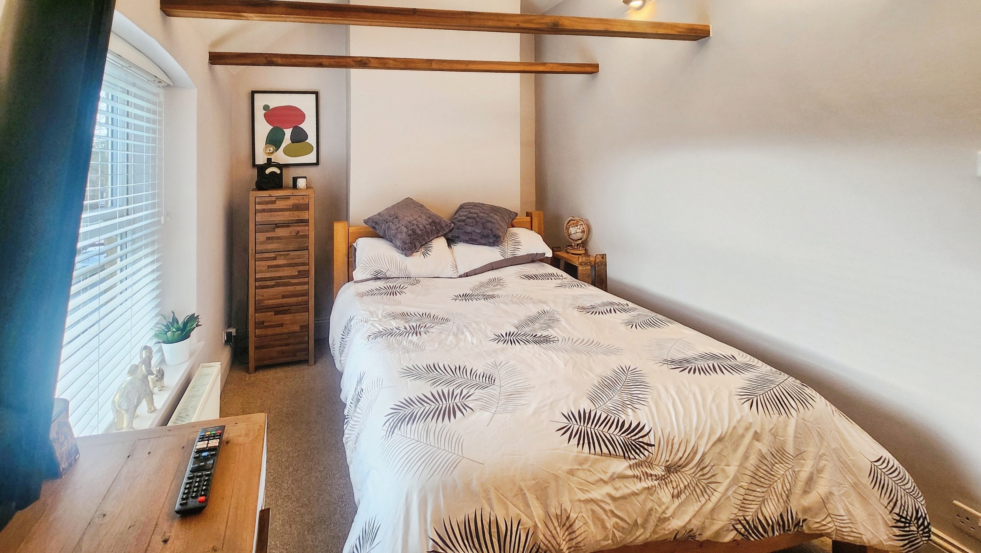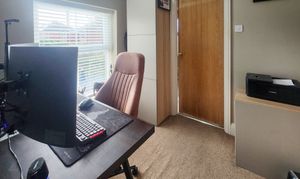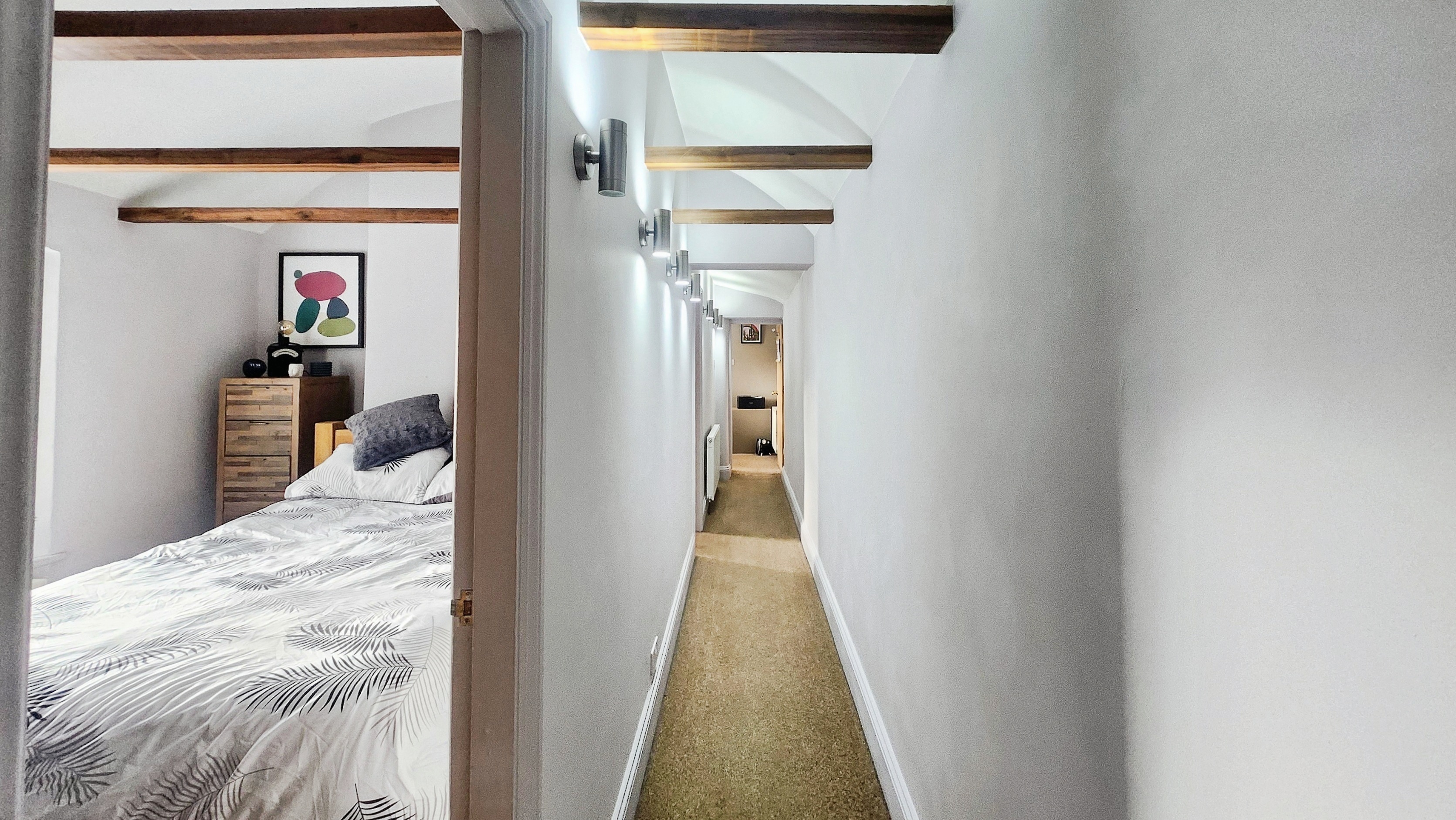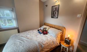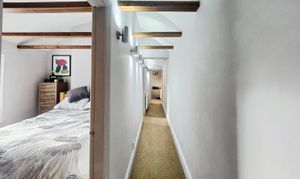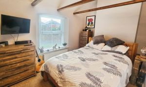 Upstairs, the character continues. The landing showcases exposed timbers, uplighting, and a sense of light and height rarely found in cottages of this age. The principal bedroom is generously proportioned, with clever storage above the stairs and ample space for a king size bed and furniture. The second bedroom comfortably accommodates a double bed and wardrobes, while the third bedroom, currently used as a home office, offers flexibility as a nursery, study, or occasional guest room.