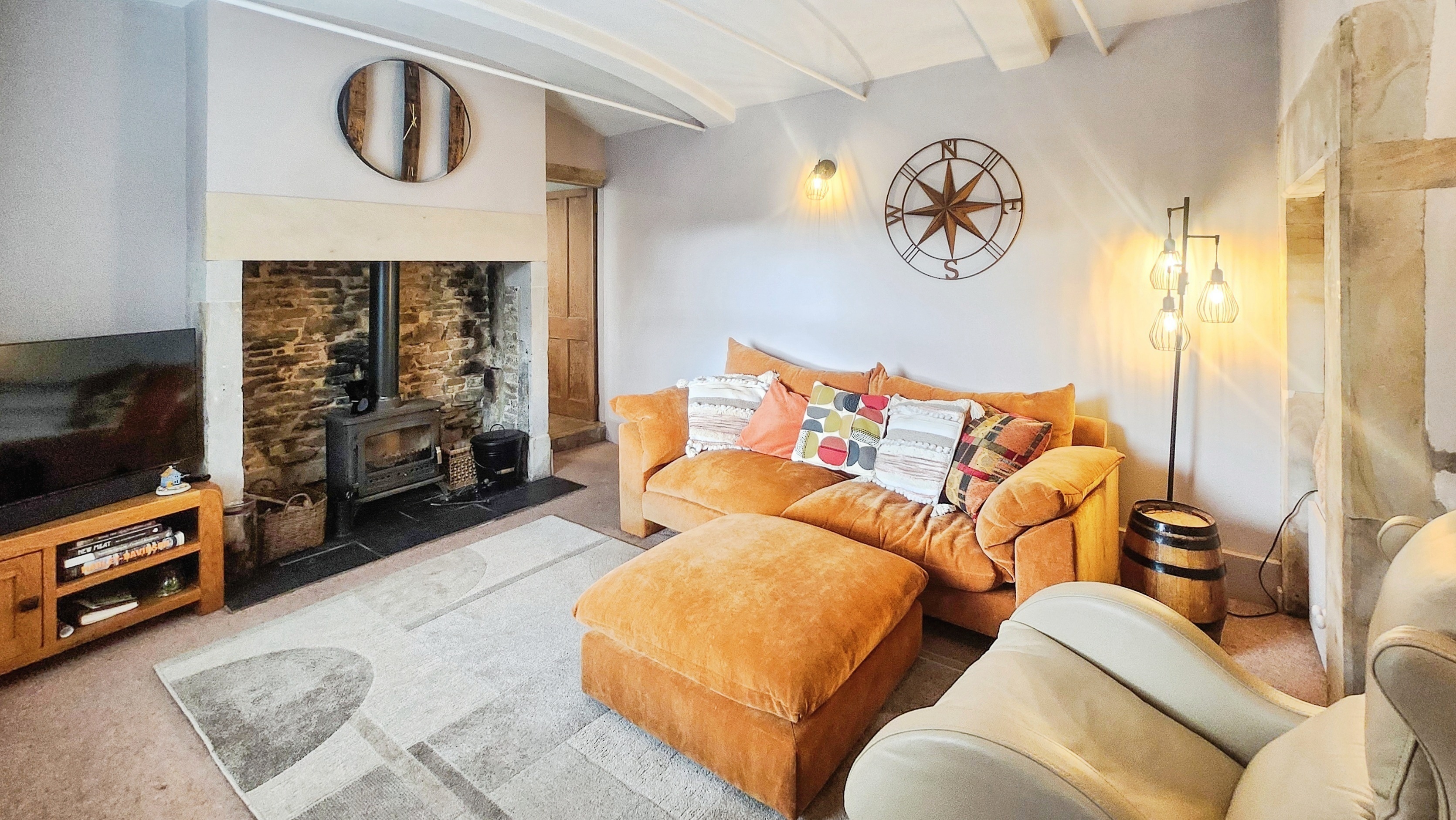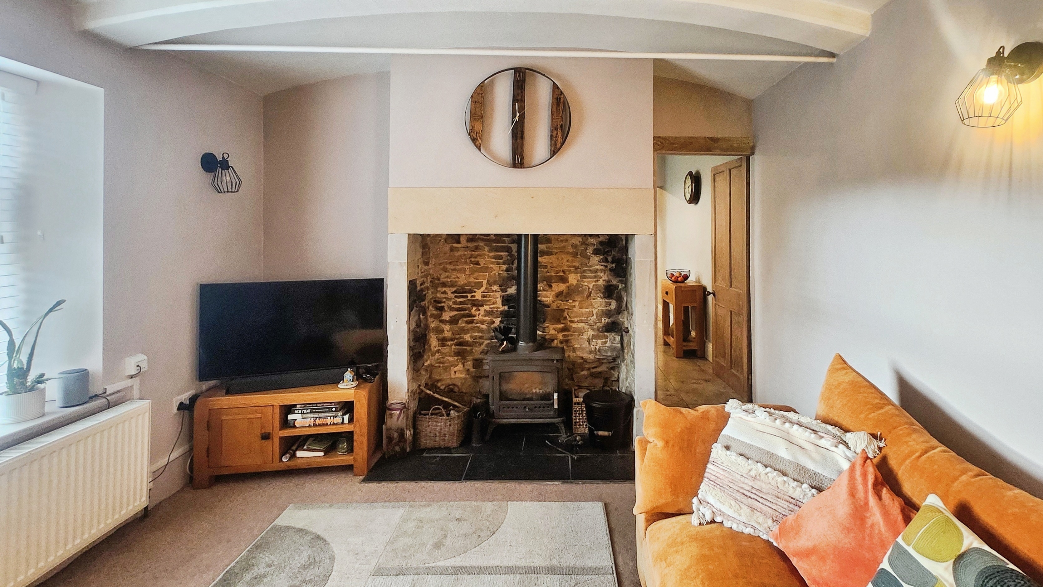 Flowing seamlessly from the kitchen is the dining room, rich with history and atmosphere. A magnificent inglenook fireplace, bespoke joinery, and stone effect tiled flooring create a warm and characterful setting for family meals and gatherings. Oak doors lead through to the main living room, where a gentle step down reveals one of the cottage’s most captivating spaces. Here, an aged stone inglenook with wood burning stove takes centre stage, framed by a beautiful stone mantel. Painted barrel timber joists, iron support bars, integrated wall lighting, and a bespoke reading nook combine to create a room that feels both intimate and uplifting, full of texture, warmth, and charm.