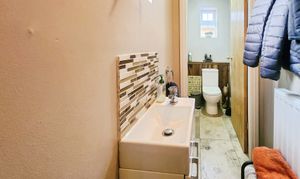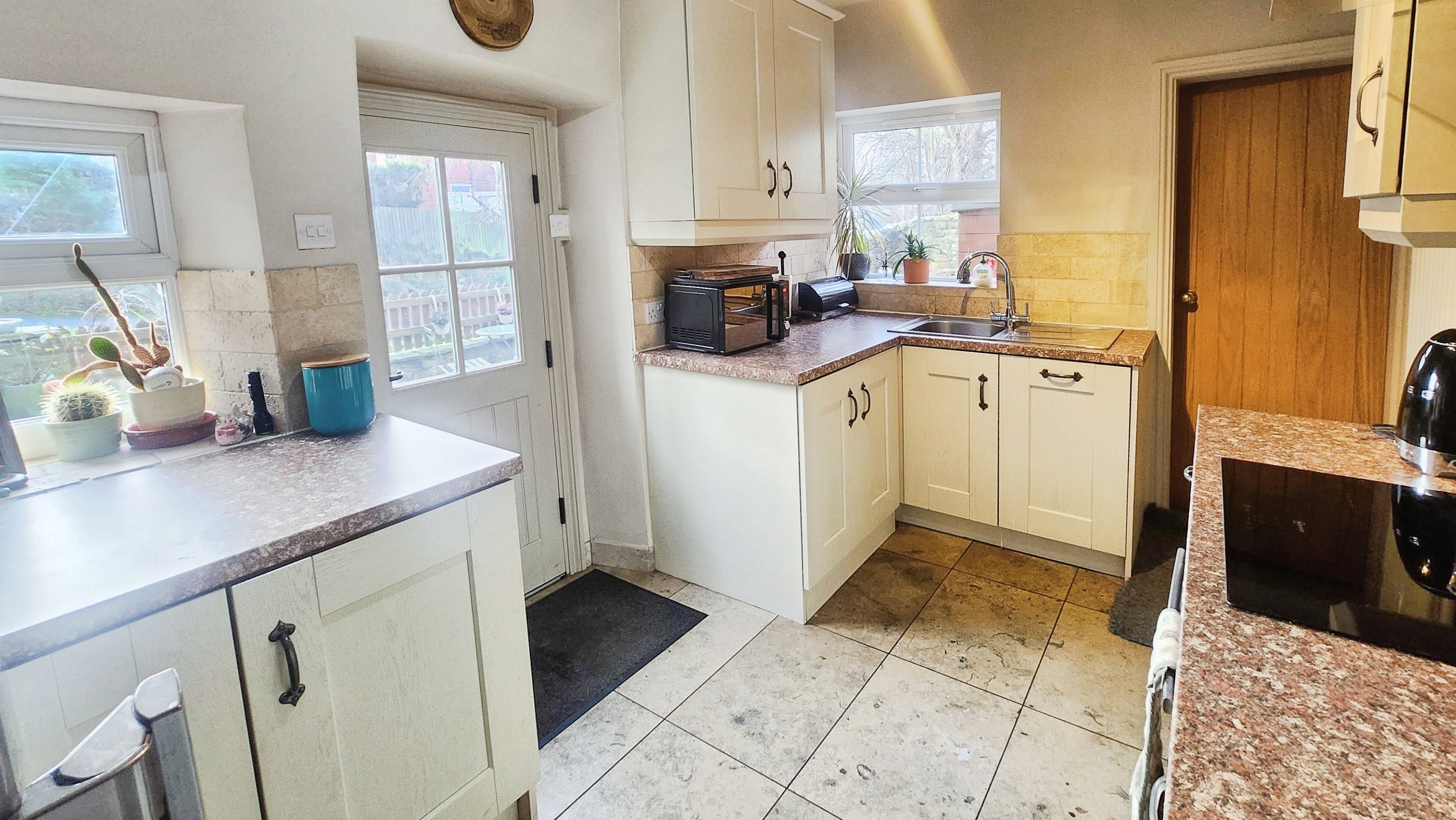 Step inside and the story truly unfolds. The kitchen welcomes you with a classic cream Shaker style design, granite effect laminate worktops, brick style tiling, and integrated appliances including an induction hob and oven. Thoughtfully laid out with three distinct work areas, the space is both practical and beautifully presented. A cloakroom with wc sits just off the kitchen, cleverly incorporating storage for everyday essentials.