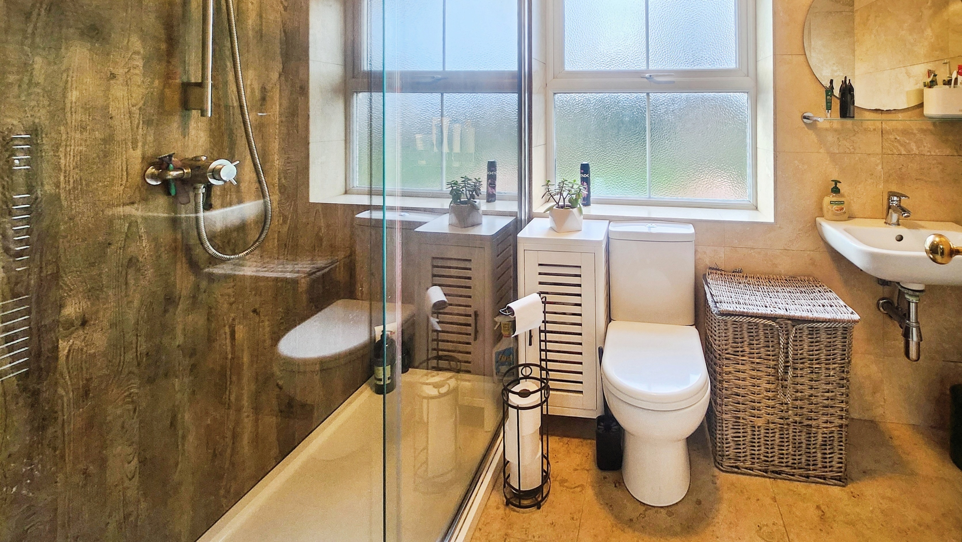 The family shower room is finished in a soft, neutral palette, featuring a walk in shower with wood effect tiling, chrome fittings, wc, basin, heated towel rail, and additional storage.