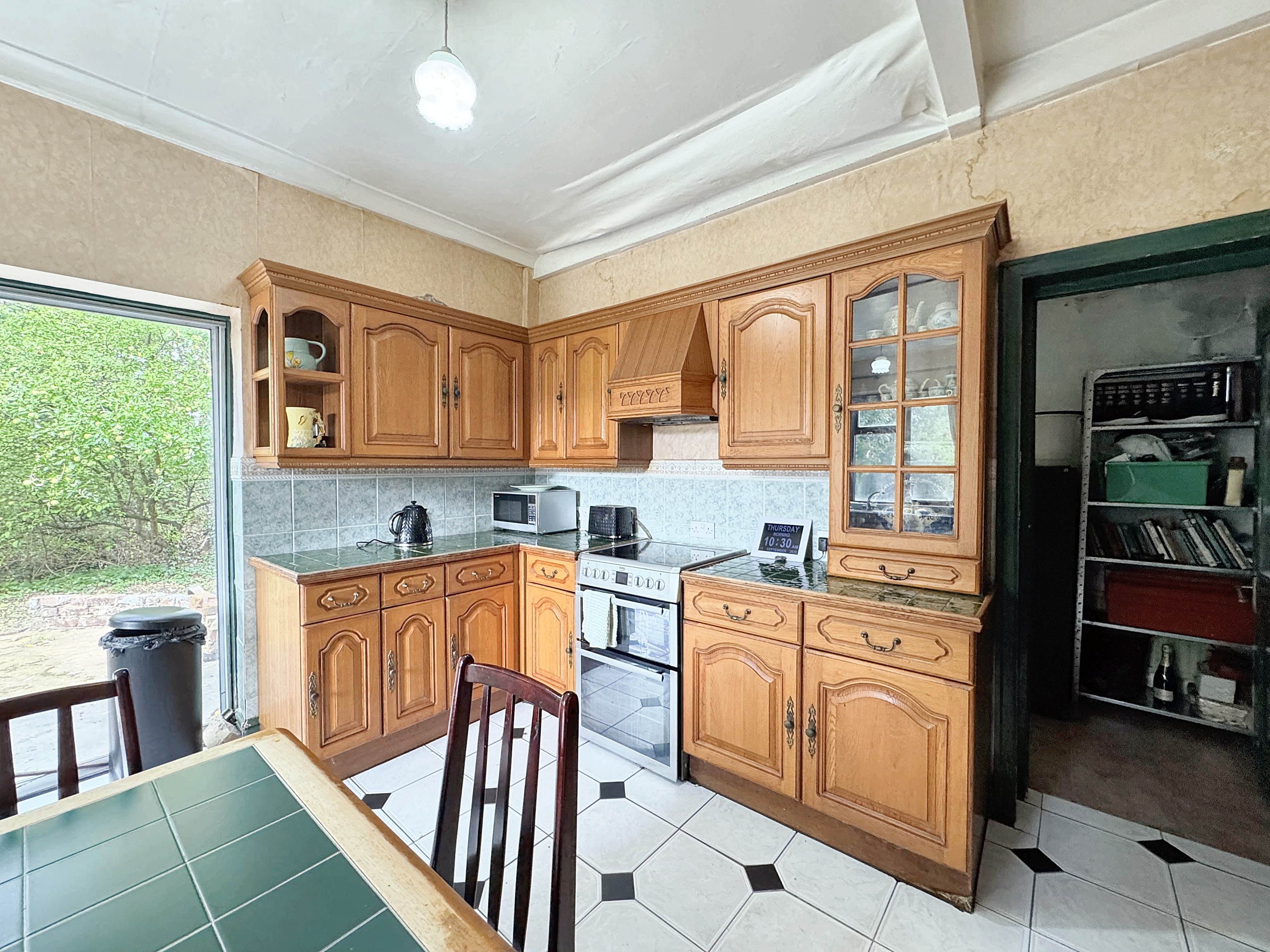 Window to the front elevation. Sliding doors to the side elevation. The kitchen comprises of a range of wall and base units with space for freestanding appliances.