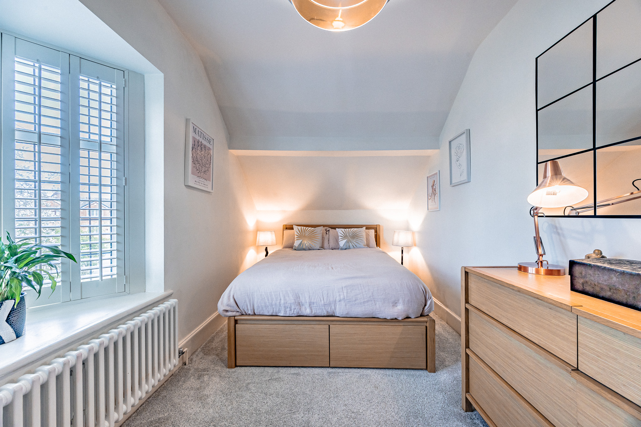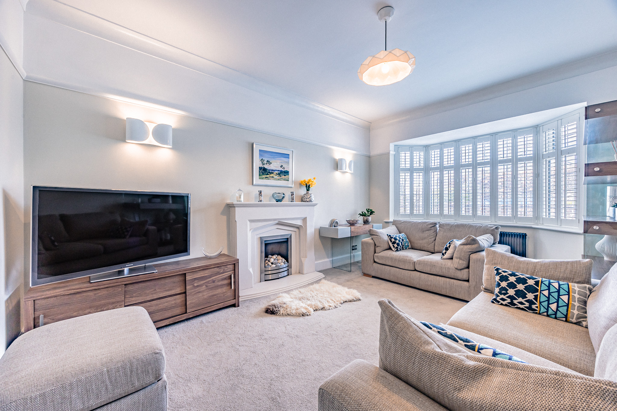 The lounge offers a warm yet contemporary feel, with a gas fire and Plantation shutters are fitted to the lounge and two front-facing bedrooms, adding both style and privacy.
