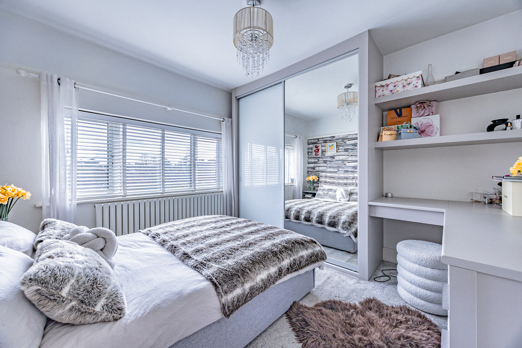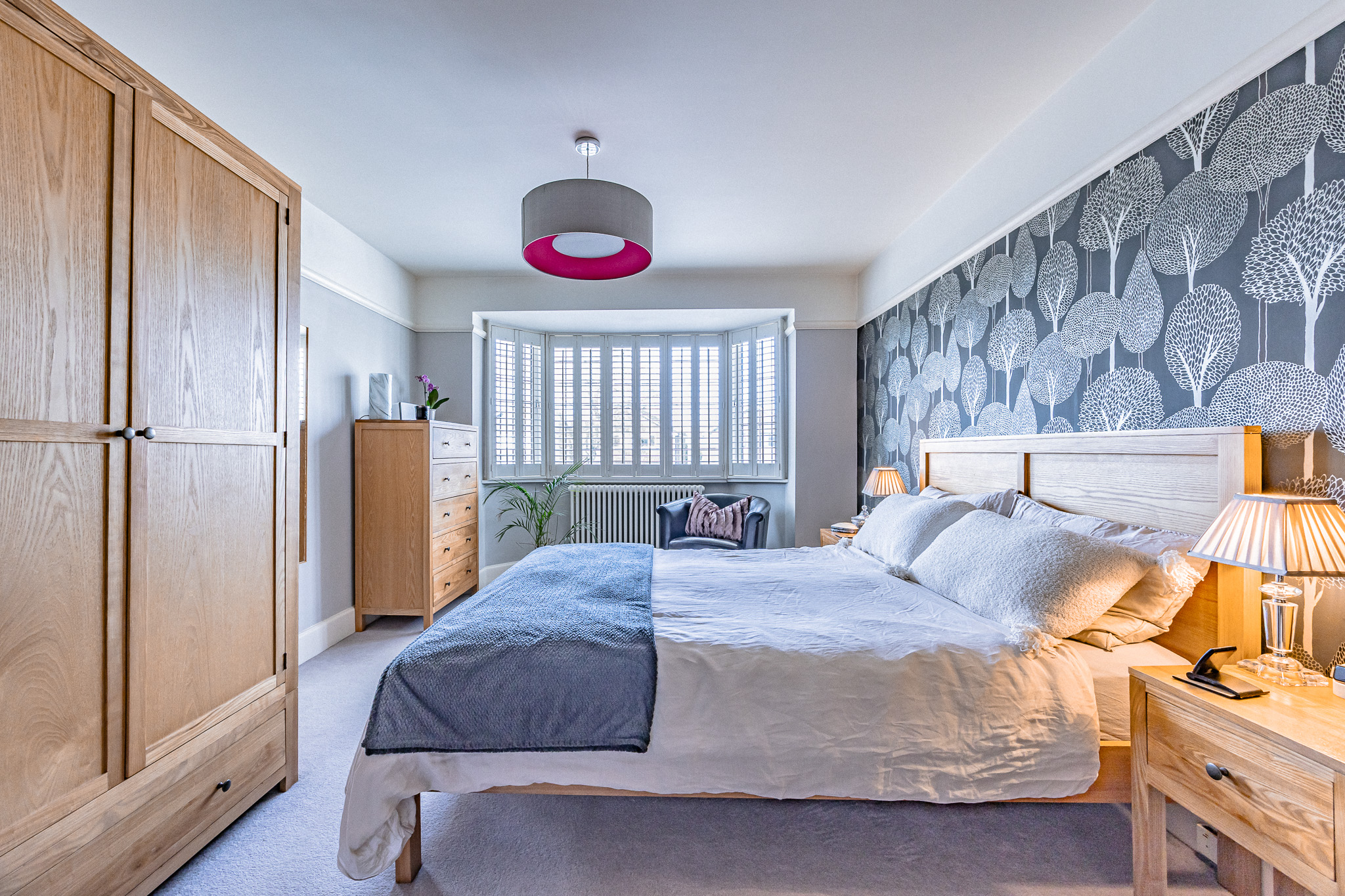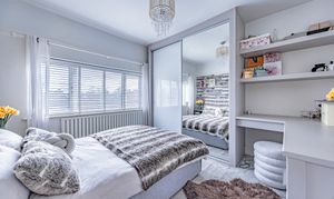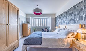 Upstairs, the property offers four well-proportioned bedrooms, comprising three generous doubles and a versatile single bedroom currently used as a home office. The principal bedroom benefits from a bay window and plantation shutters, while another bedroom features bespoke fitted sliding wardrobes, a built-in desk/dressing table and Venetian blinds. A further double bedroom also enjoys a bay window.
