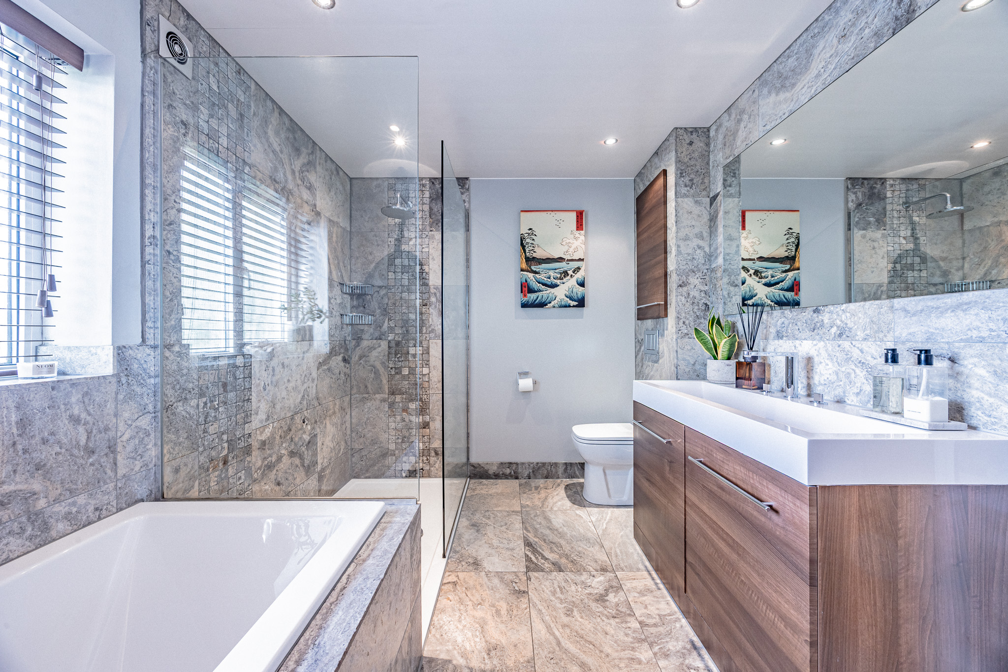 The family bathroom is beautifully appointed with silver travertine tiling, underfloor electric heating, a walk-in shower and separate bath.