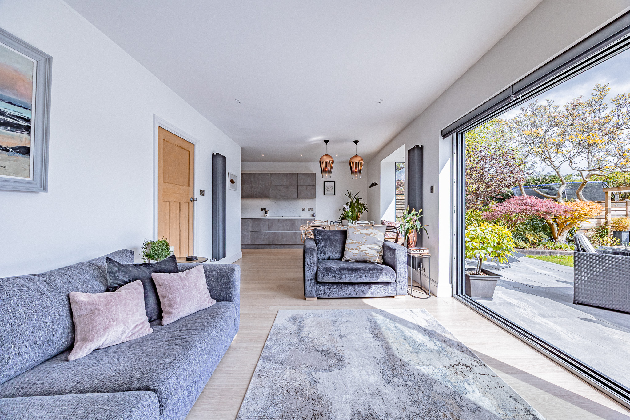 The ground floor has been beautifully reconfigured to create an impressive open-plan kitchen, lounge and dining area. This expansive, light-filled space forms the heart of the home, with large sliding doors opening directly onto the garden, perfect for entertaining and seamless indoor-outdoor living.