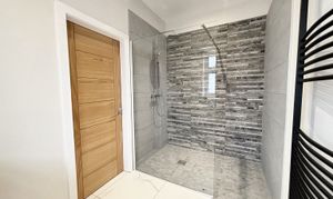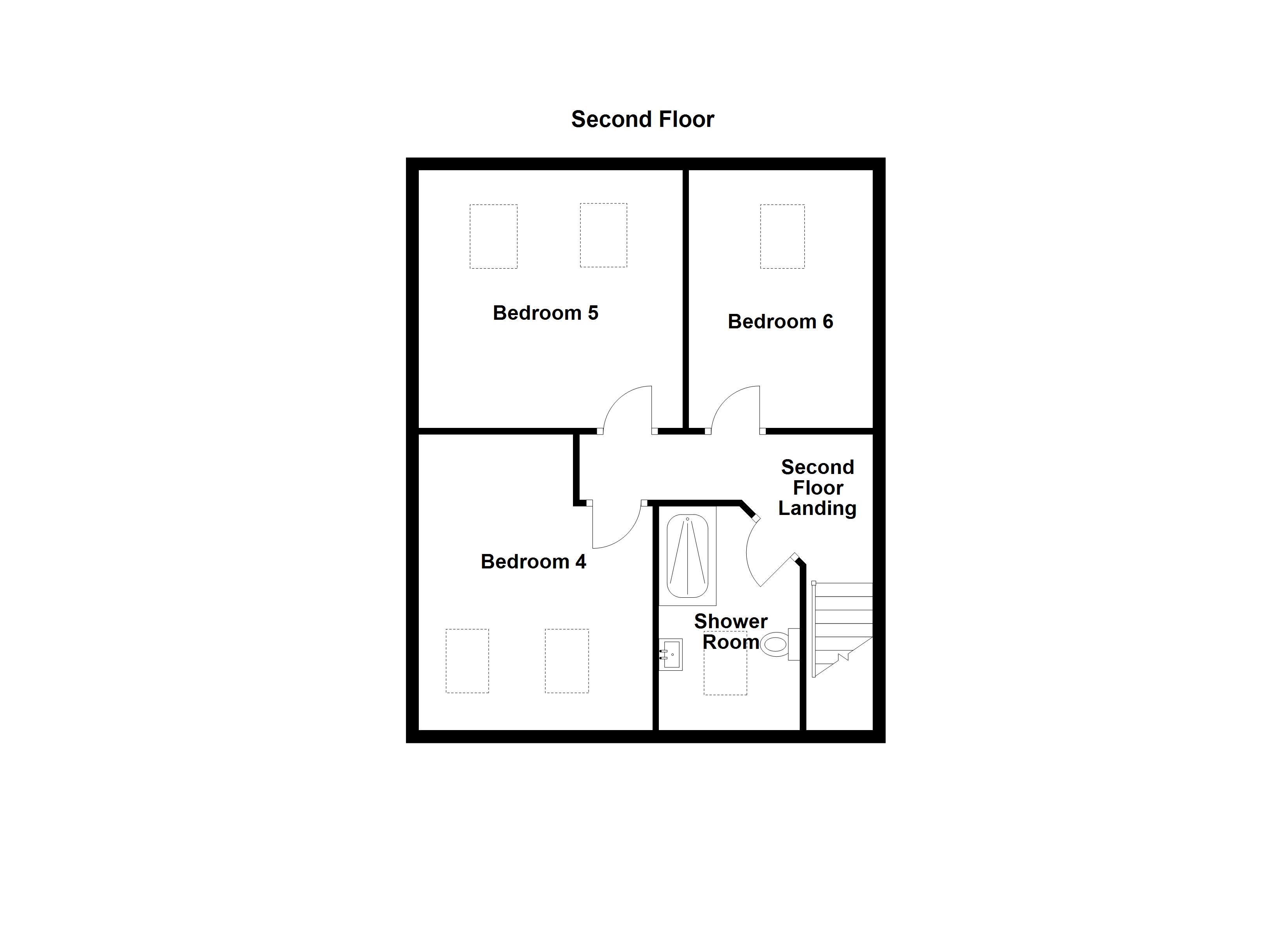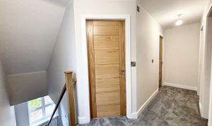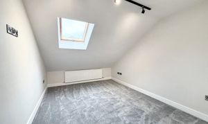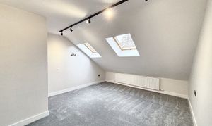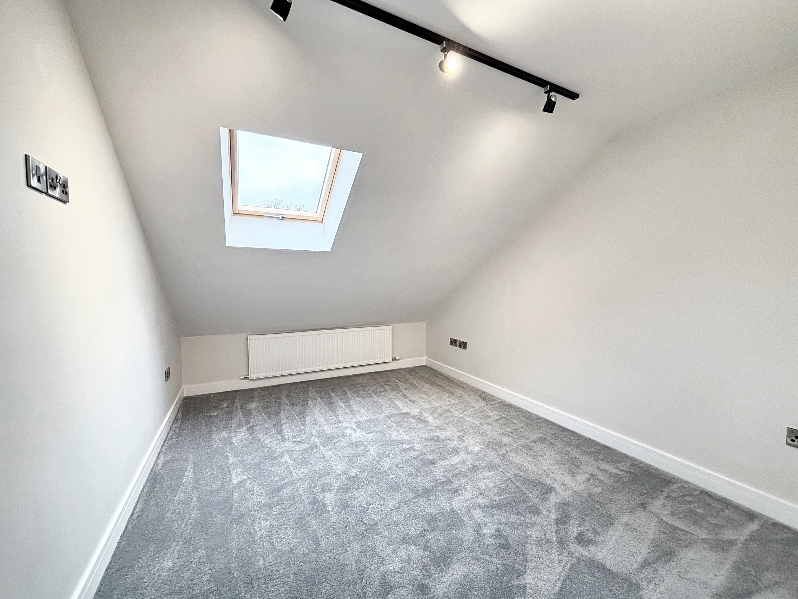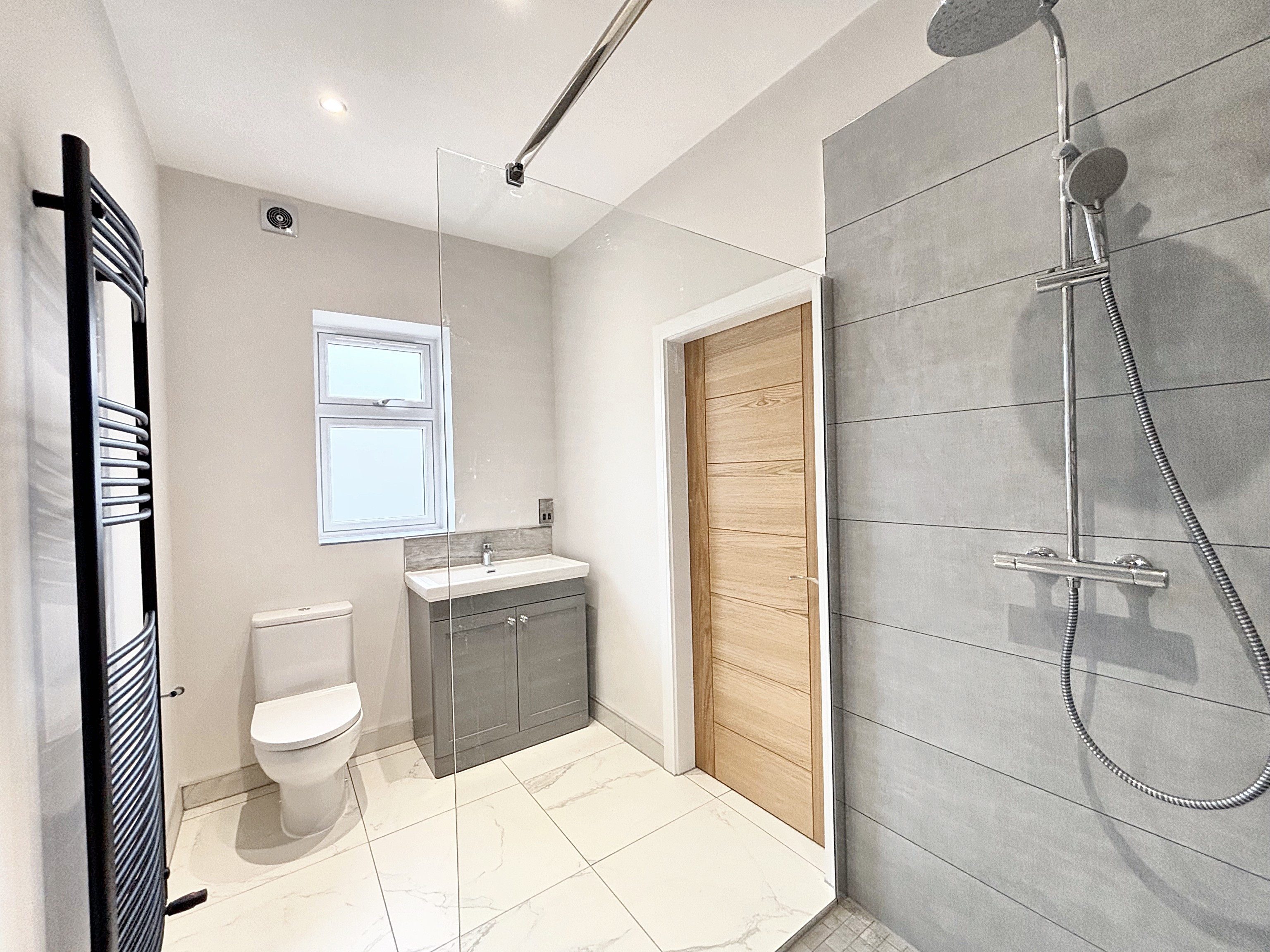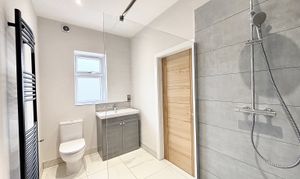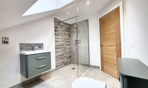 Velux window to the front elevation. Fitted with a walk in shower, vanity hand wash basin and a low level W.C. Part tiled walls and floor. Inset spotlights.