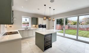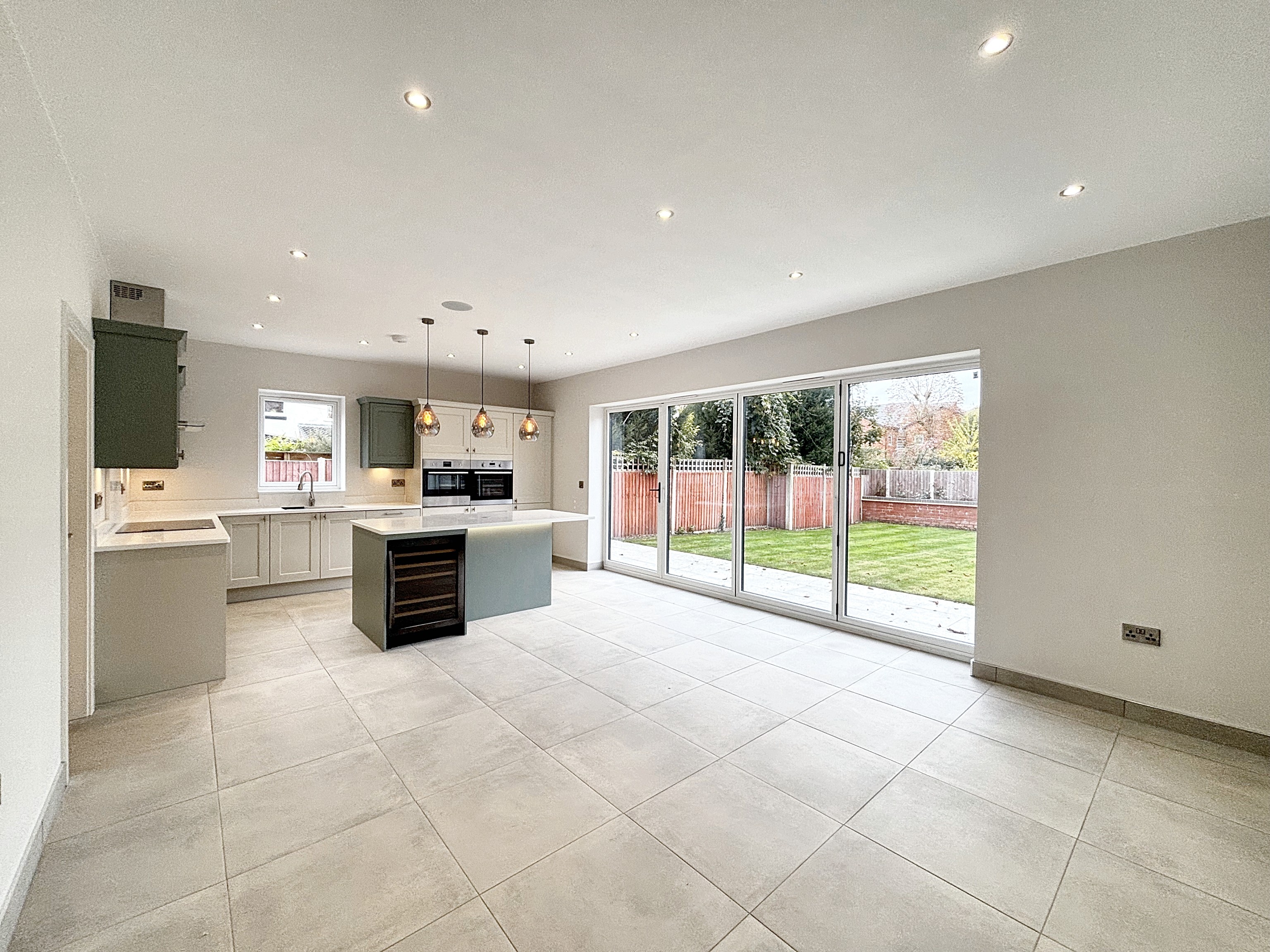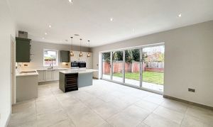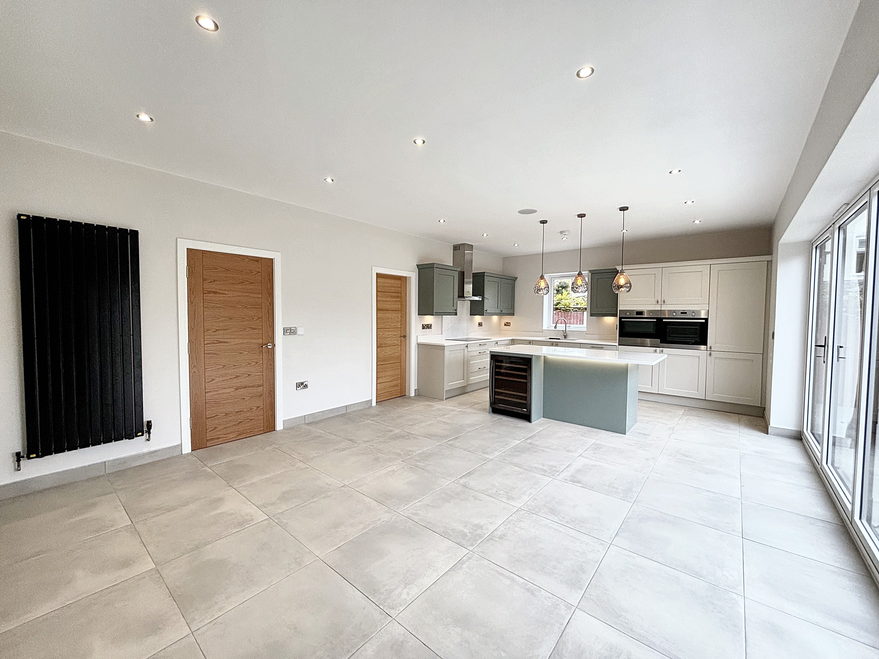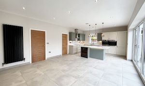 Bi-folding doors to the rear elevation. Window to the side elevation. Tiled floor with under floor heating. Fitted with a range of wall and base units complete with quartz work surfaces and island. Integrated appliances include: Two Ovens, Fridge, Freezer, Dishwasher and Wine Fridge. Inset spotlights. T.V point. Internal door leads through to: