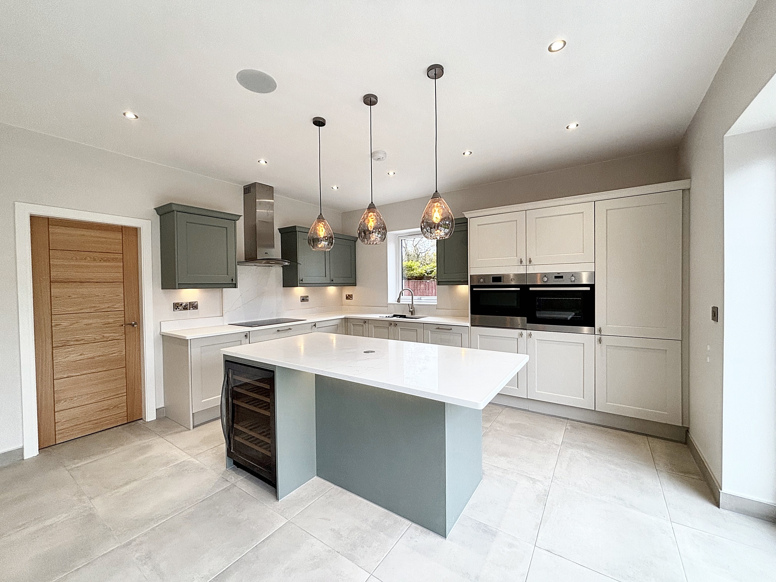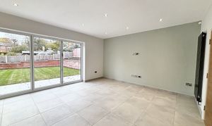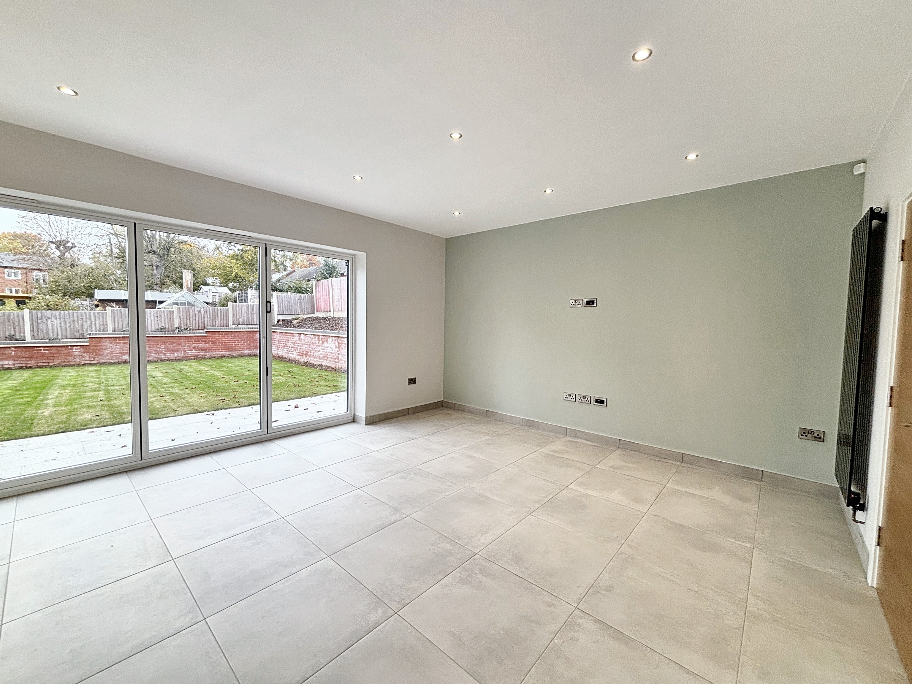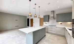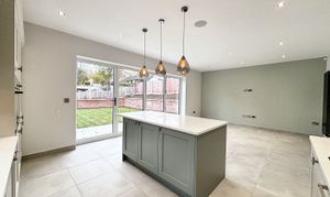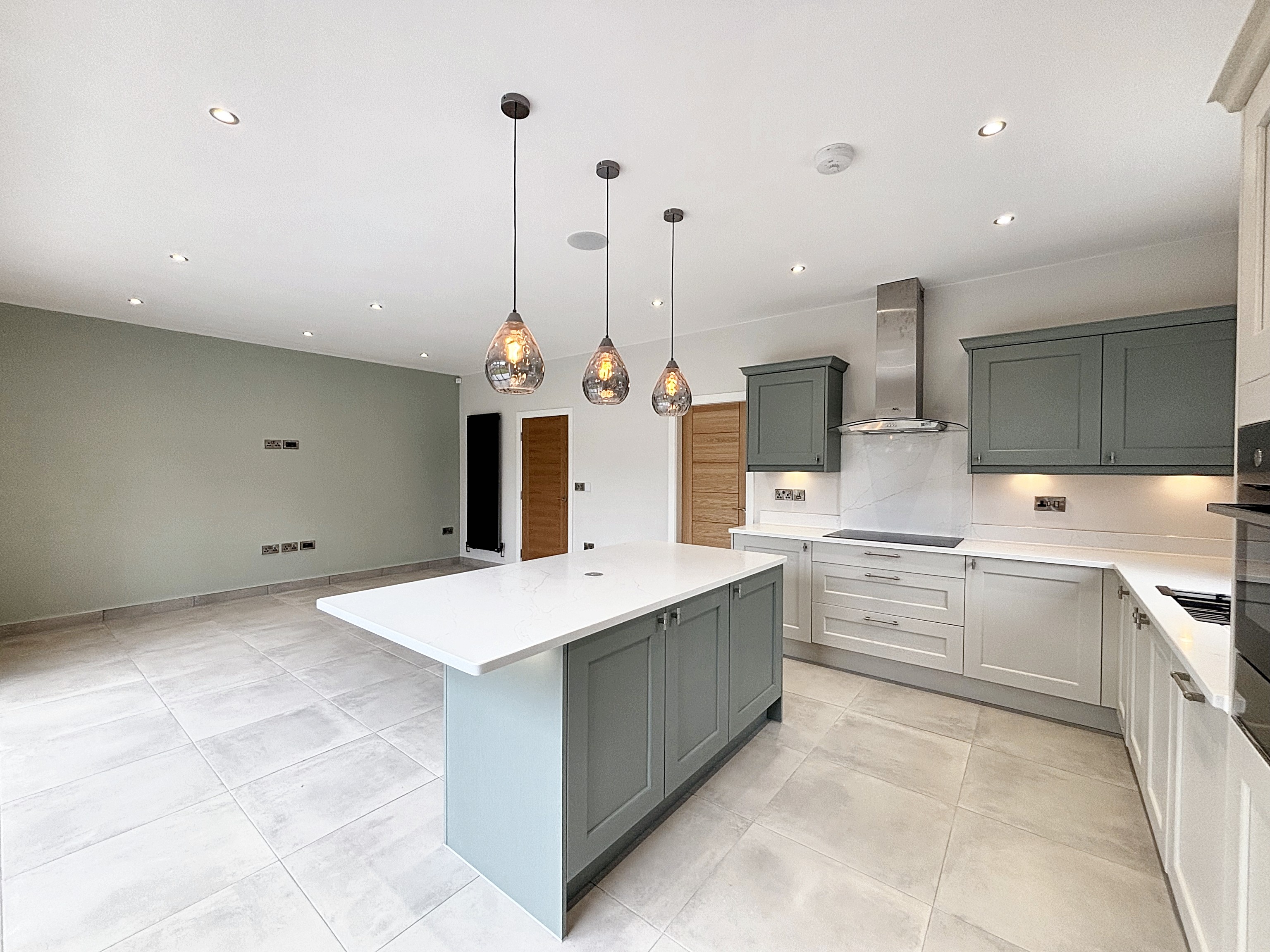 Bi-folding doors to the rear elevation. Window to the side elevation. Tiled floor with under floor heating. Fitted with a range of wall and base units complete with quartz work surfaces and island. Integrated appliances include: Two Ovens, Fridge, Freezer, Dishwasher and Wine Fridge. Inset spotlights. T.V point. Internal door leads through to: