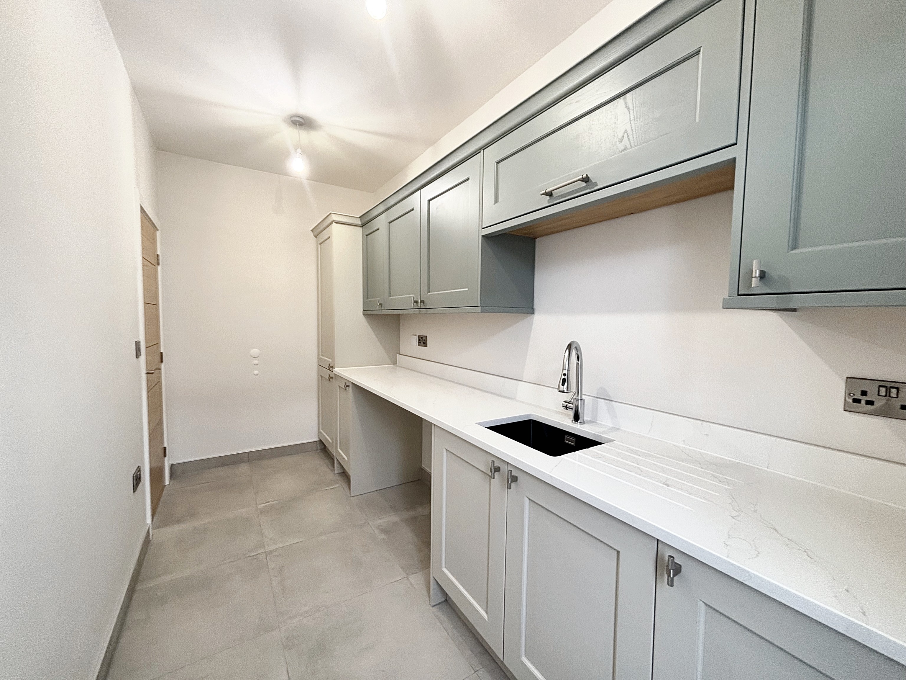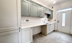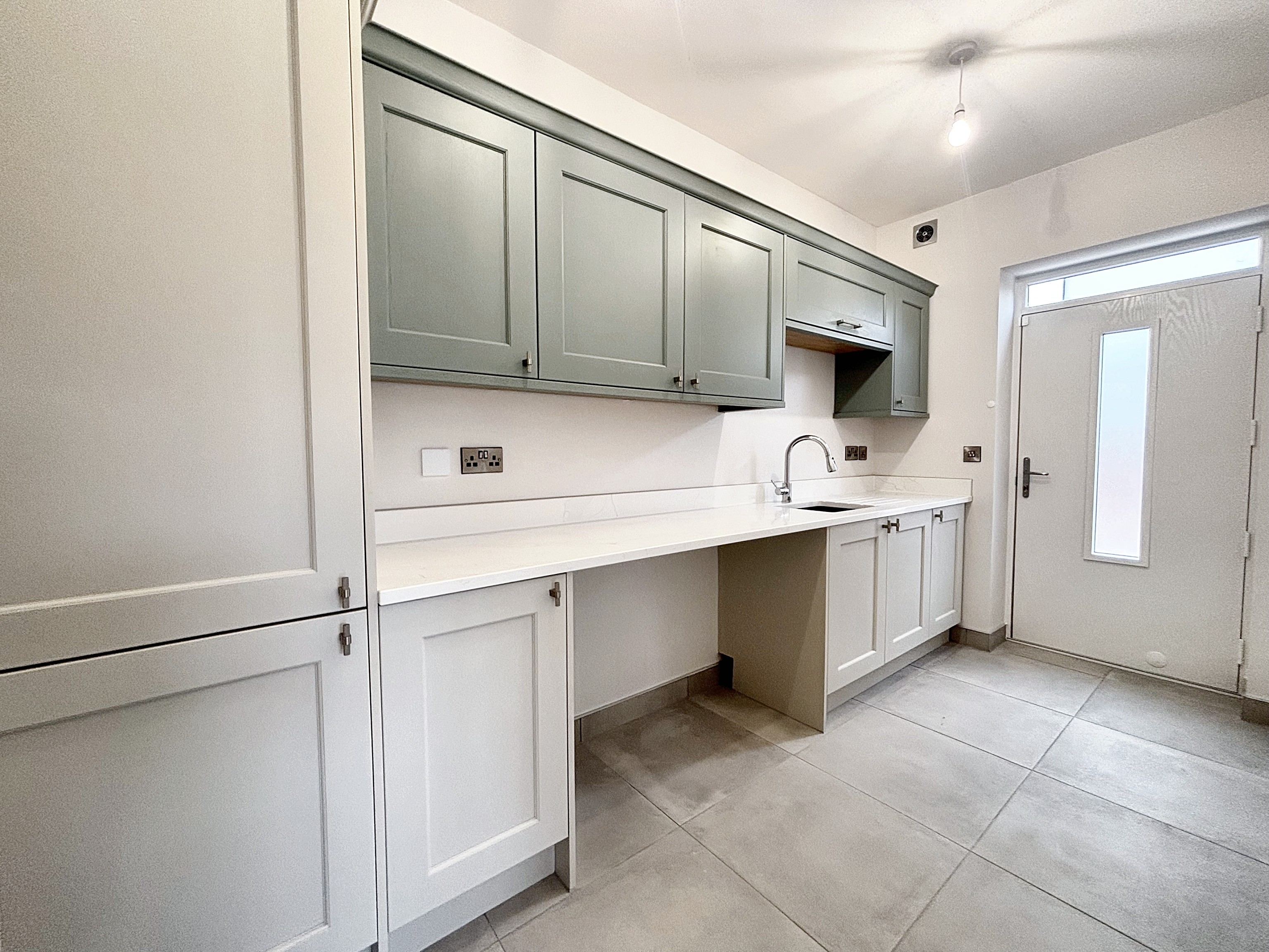 External door to the side elevation with a window above. Tiled floor. Fitted with range of wall and base units complete with quartz work surface and plumbing facilities for a washing machine and tumble dryer.