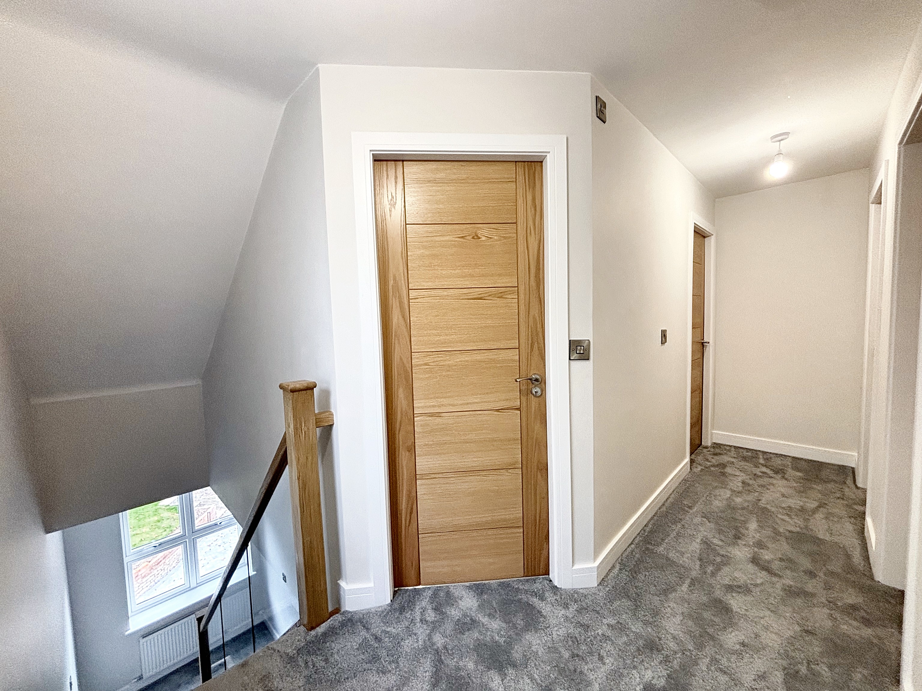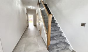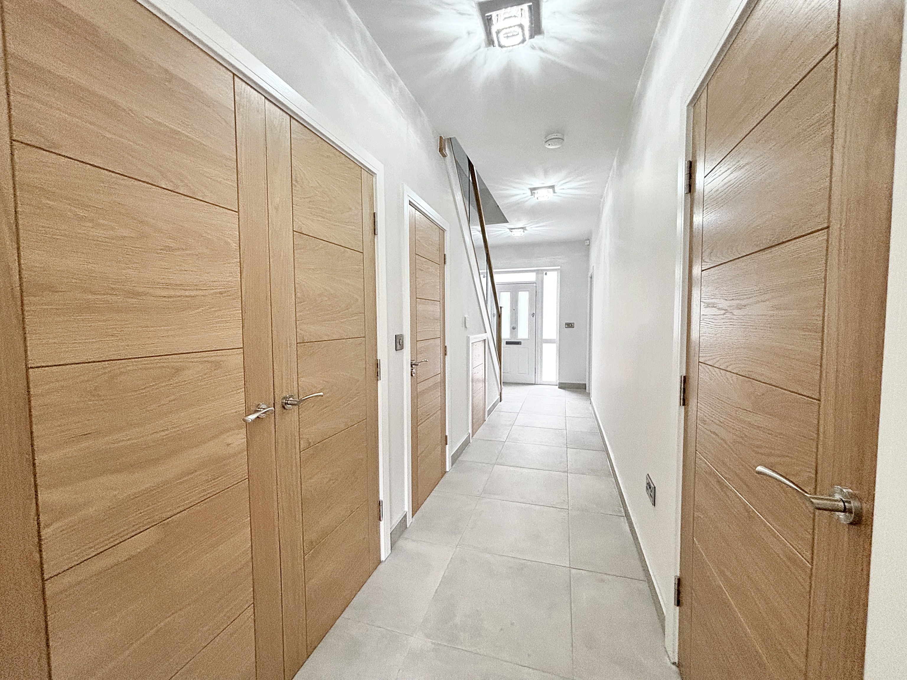 External door to the front elevation with a window to the side and above. Tiled floor with underfloor heating. Bespoke glass balustrade staircase leads to the first floor landing. Access to three store cupboards. Internal doors lead through to: