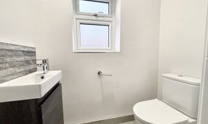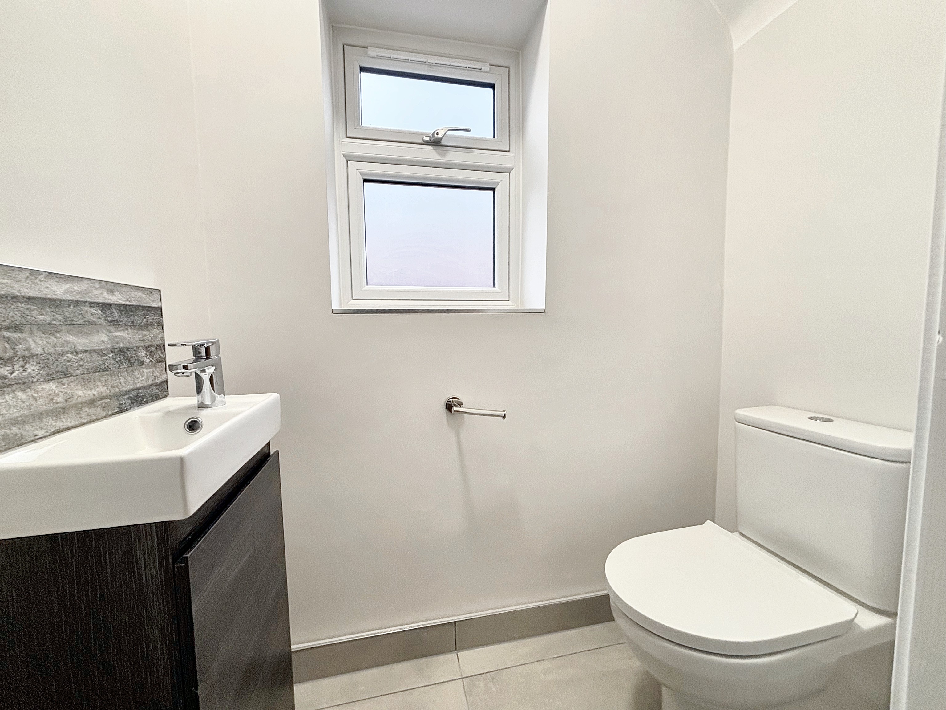 Window to the side elevation. Fitted with a low level W.C and a vanity hand wash basin. Tiled floor.