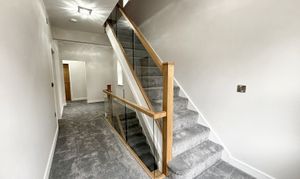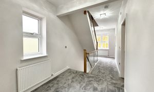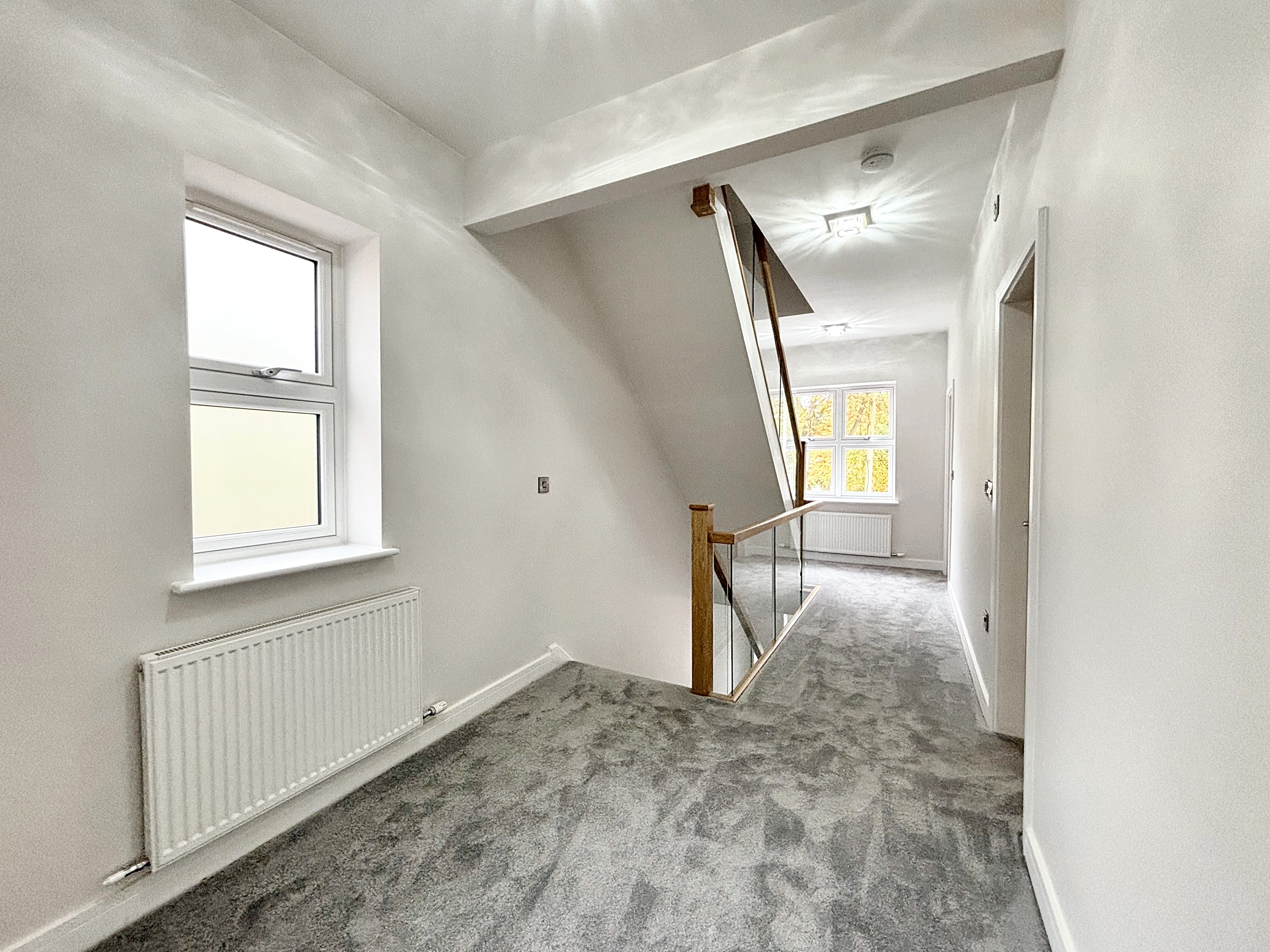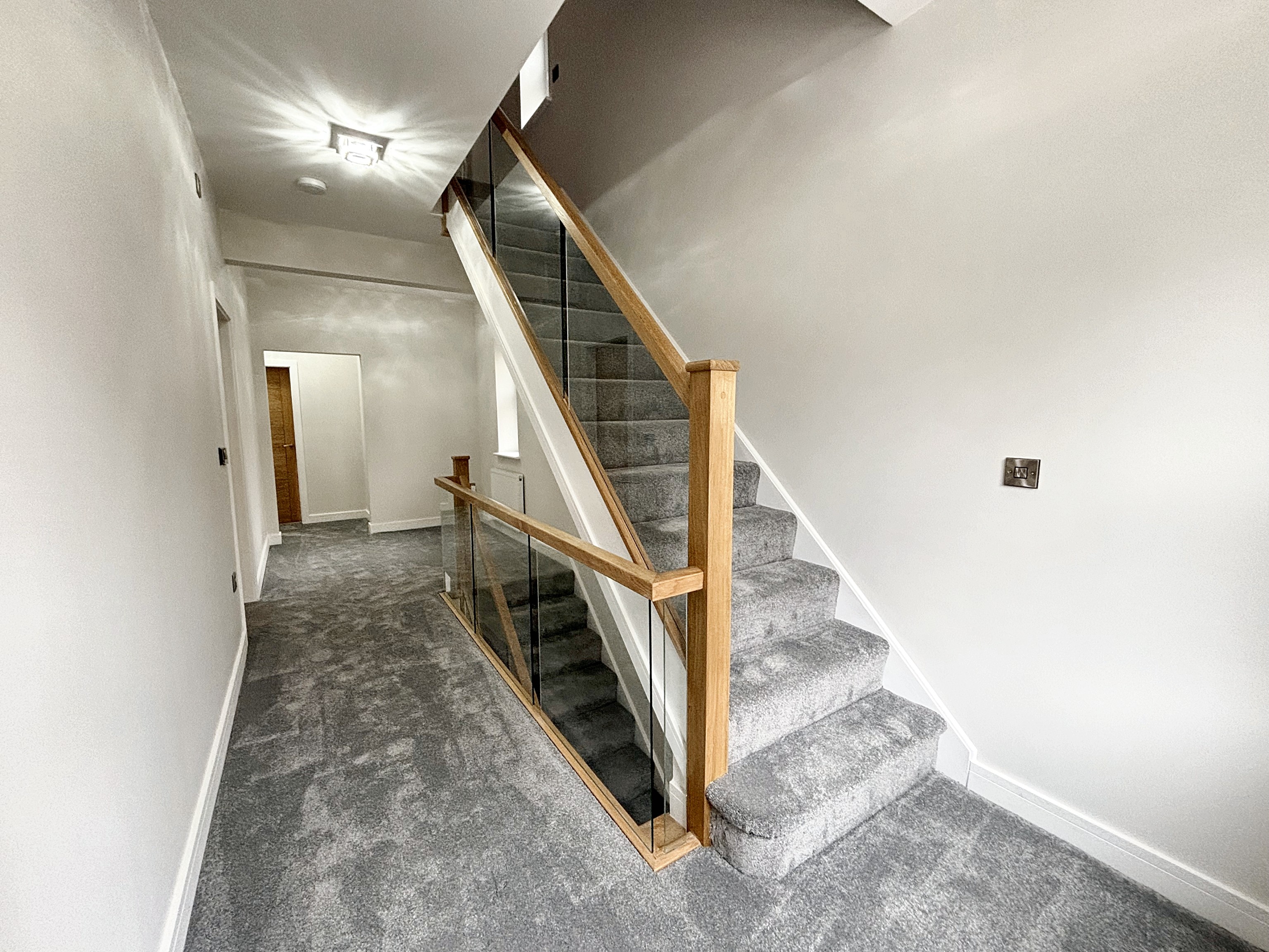Window to the side elevation. Bespoke glass balustrade and staircase leading to the second flooring. Internal doors lead through to: