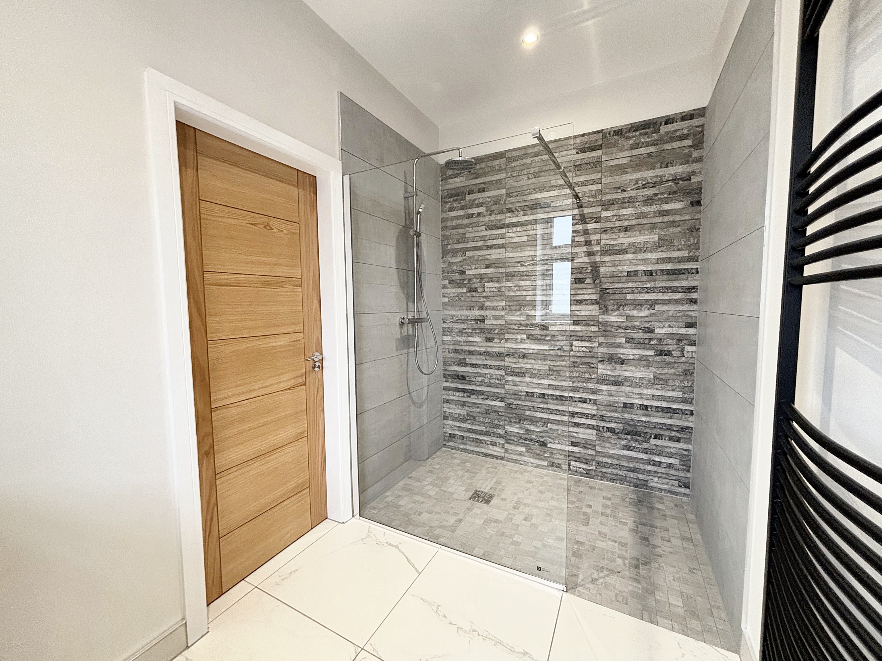 Window to the side elevation. Tiled floor with under floor heating. Part tiled walls. Fitted with a walk-in shower vanity hand wash basin and a low level W.C. Inset spotlights.