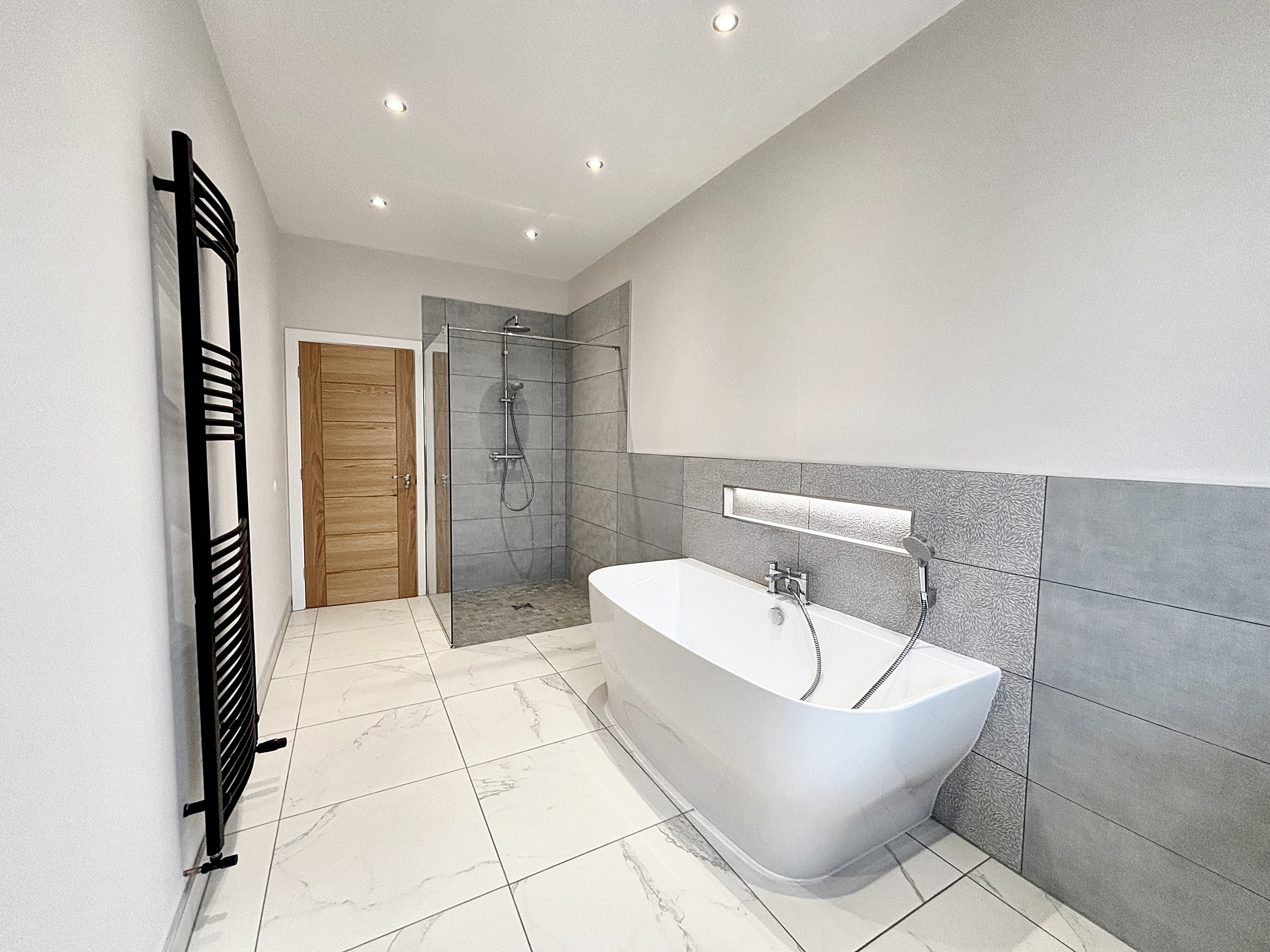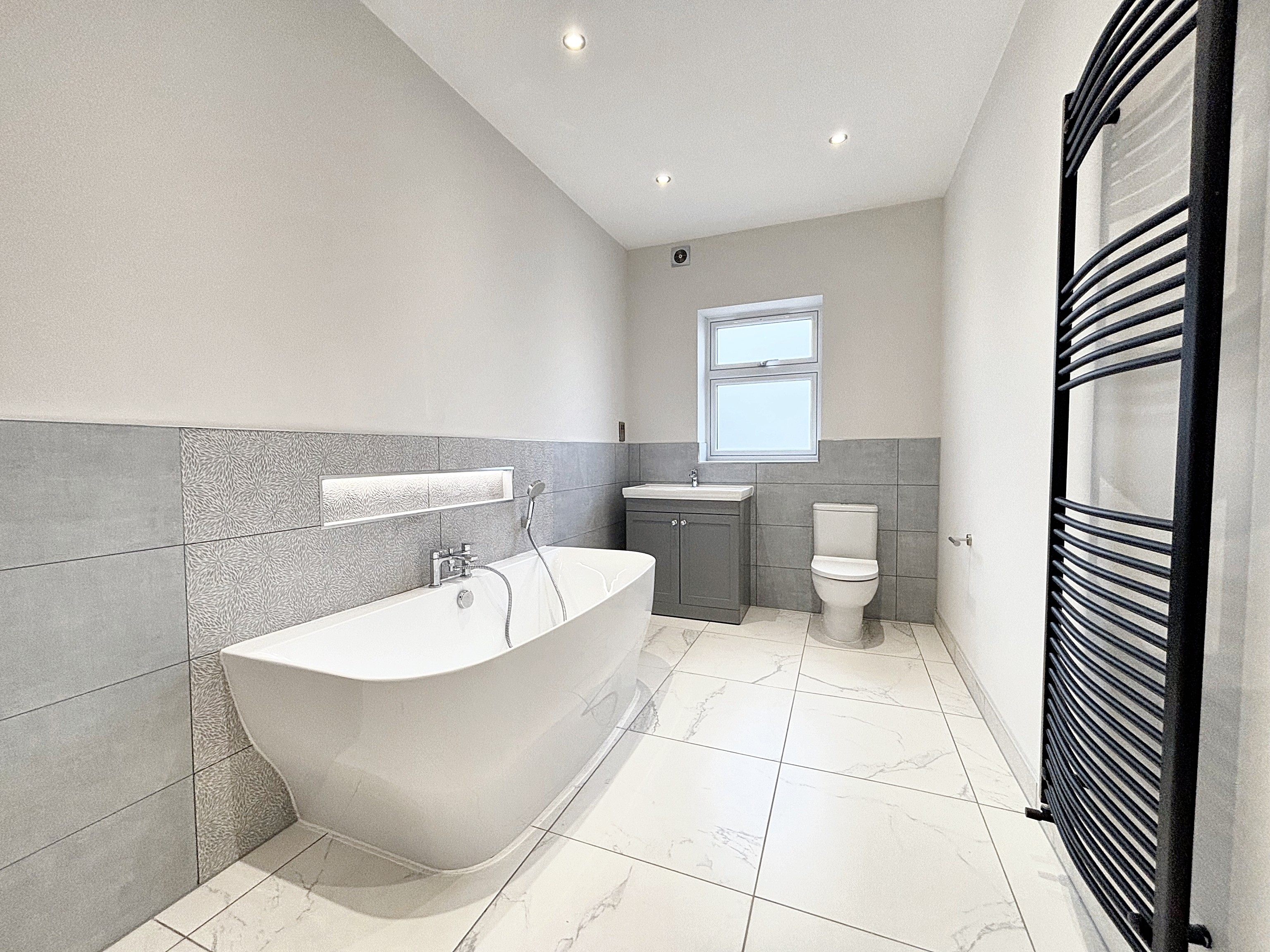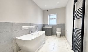 Window to the side elevation. Part tiled floor. Tiled floor with under floor heating. Inset spotlights. Fitted with a bath, walk-in shower, vanity hand wash basin and a low level W.C.