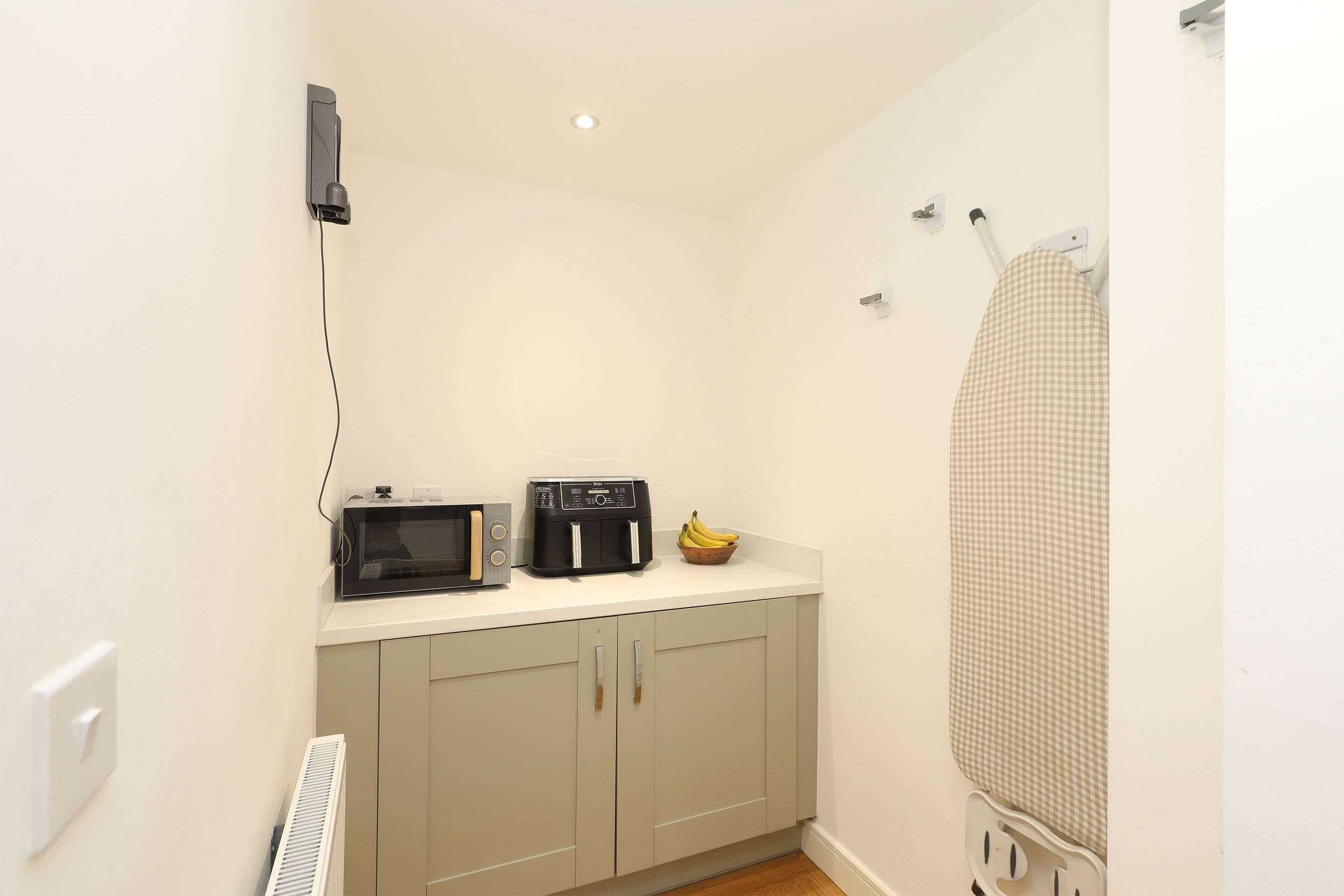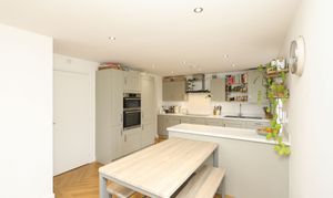 The ground floor is further complemented by a generously proportioned living room, a versatile and inviting space ideal for relaxed evenings or entertaining. Doors open directly onto the landscaped rear garden, creating a seamless connection between indoor and outdoor living.