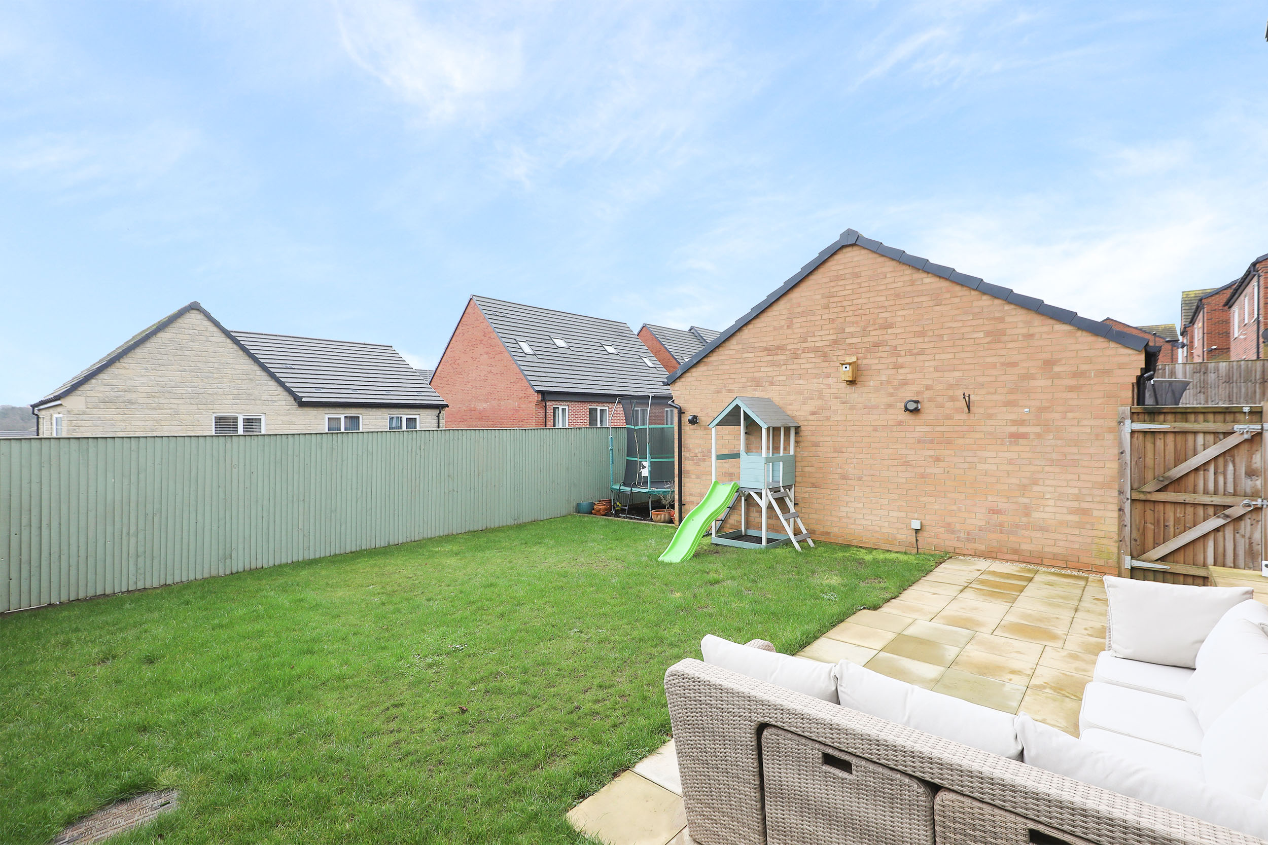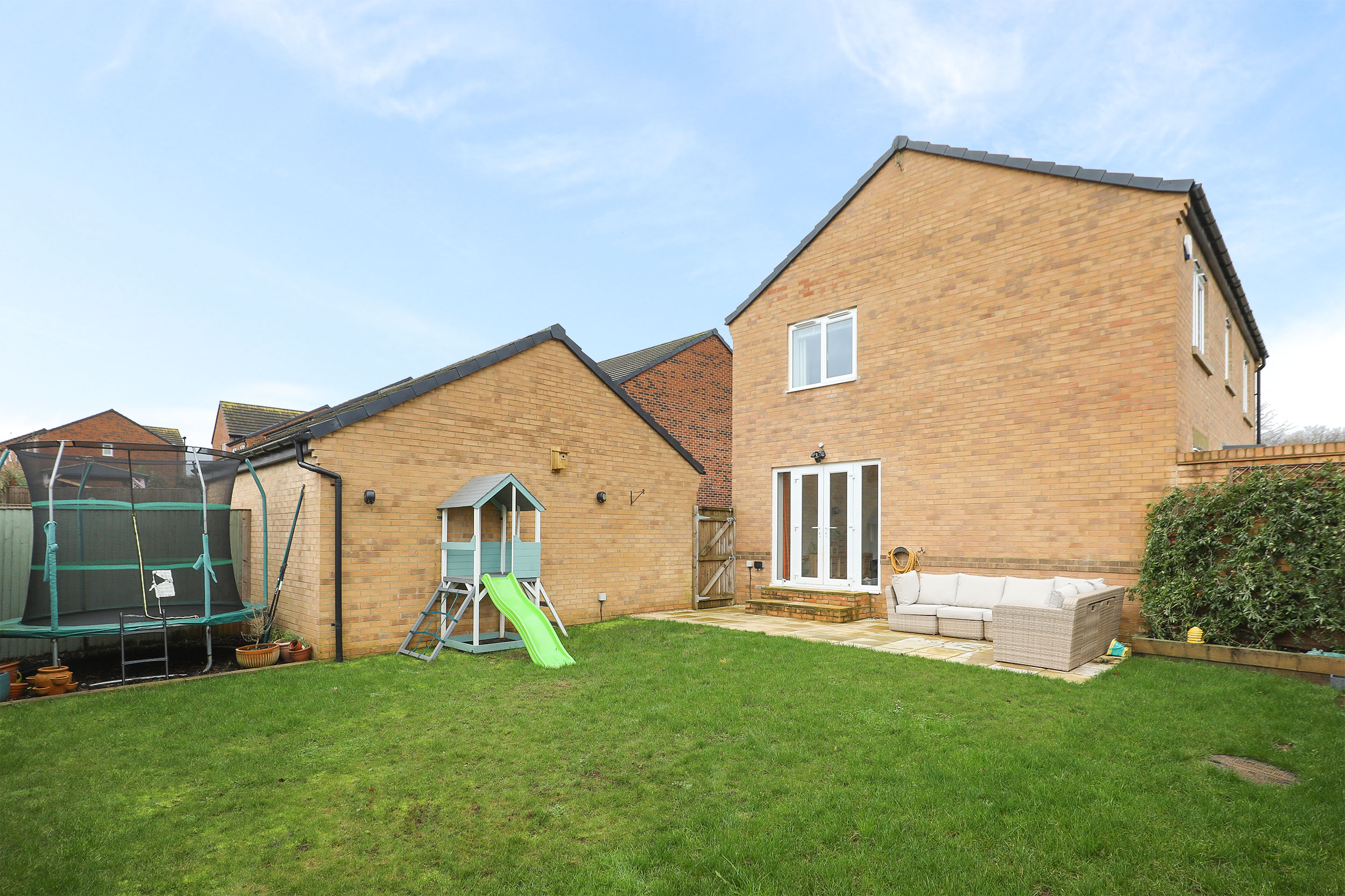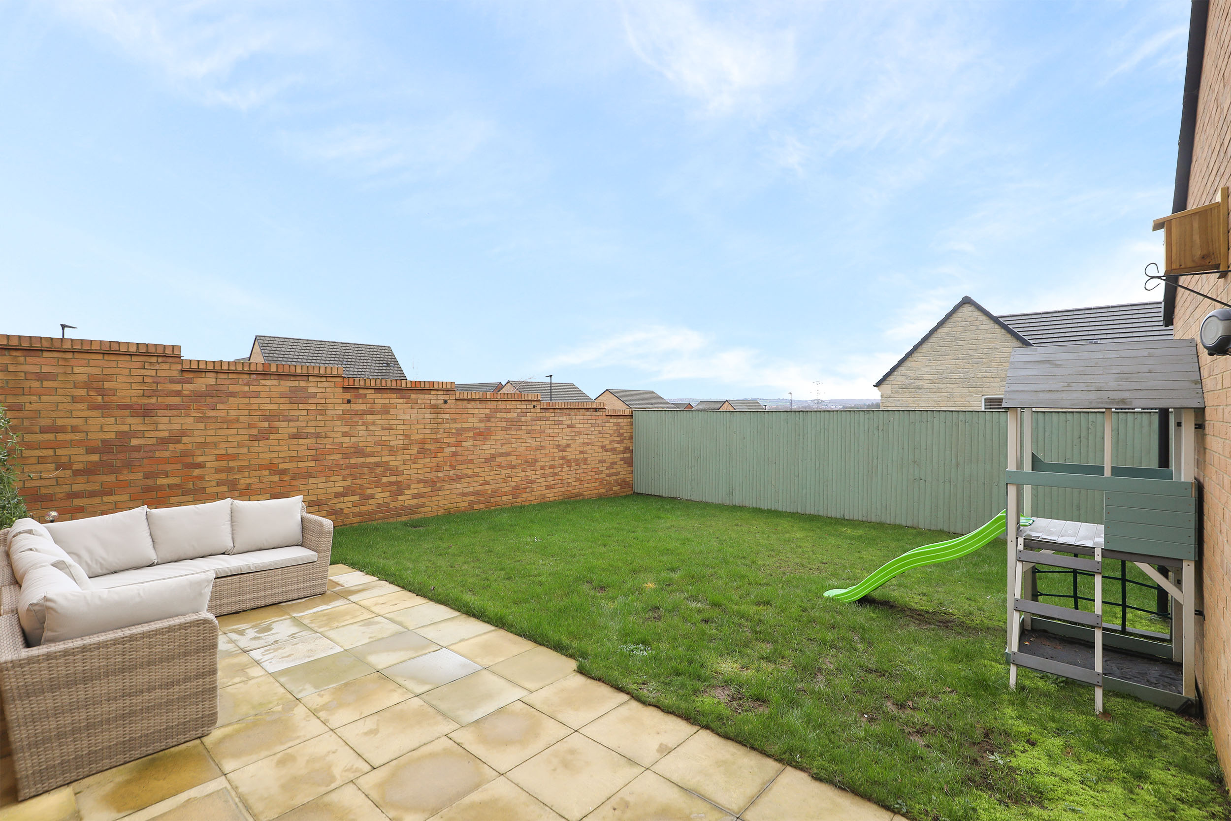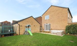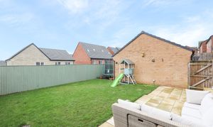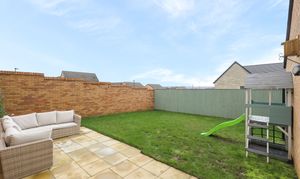 Externally, the property continues to impress. The private rear garden has been carefully designed with both families and entertaining in mind. A patio area, accessed directly from the living room, provides an ideal setting for summer gatherings, while the lawn offers generous space for children to play. A dedicated wood-chipped area is perfectly suited for a trampoline or playhouse.