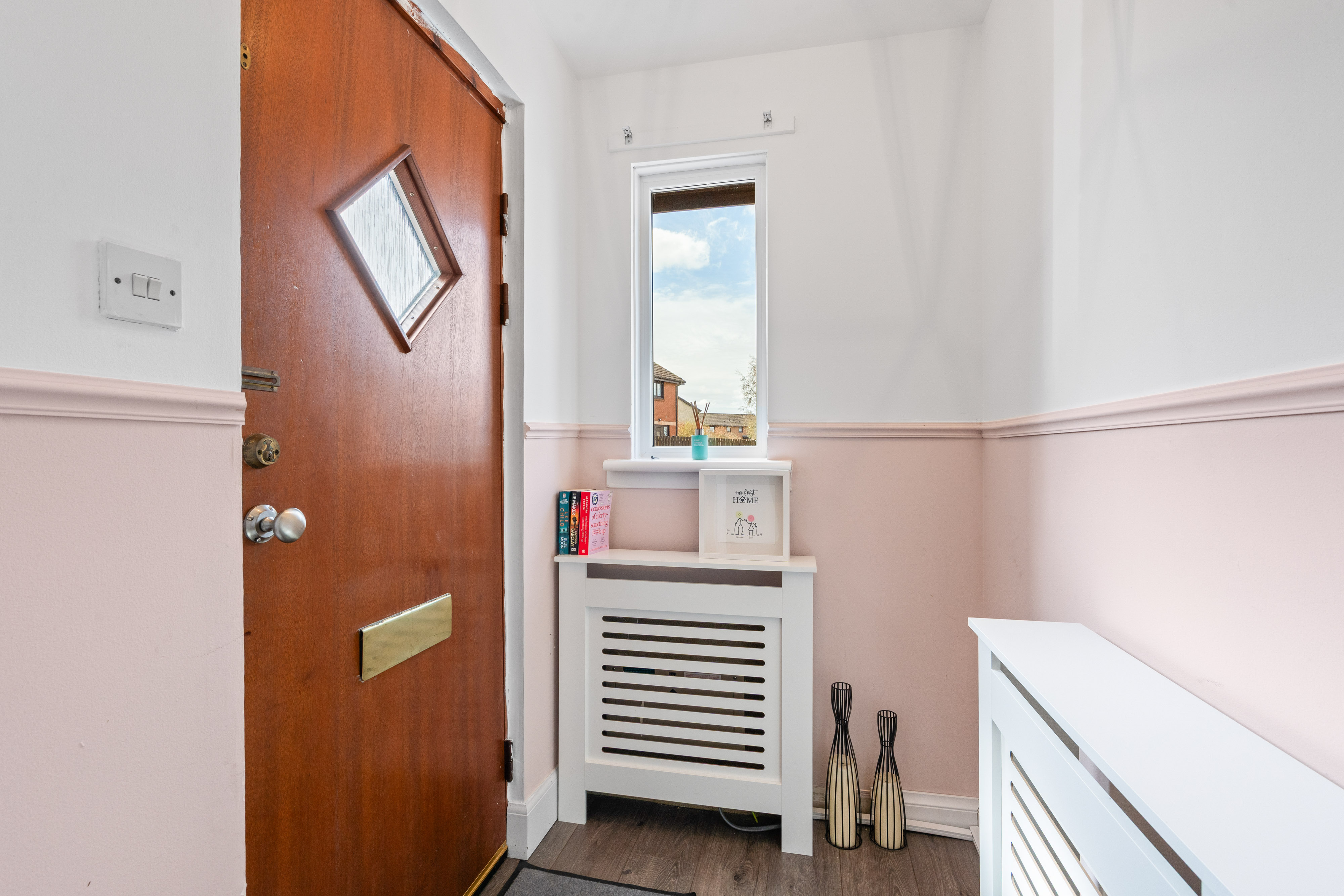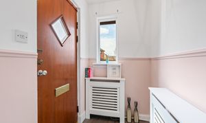 A bright and welcoming hallway finished in soft blush tones with classic dado rail detailing. Natural light filters through a slim window, complementing the wood-effect flooring to complete a neat, characterful first impression.