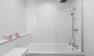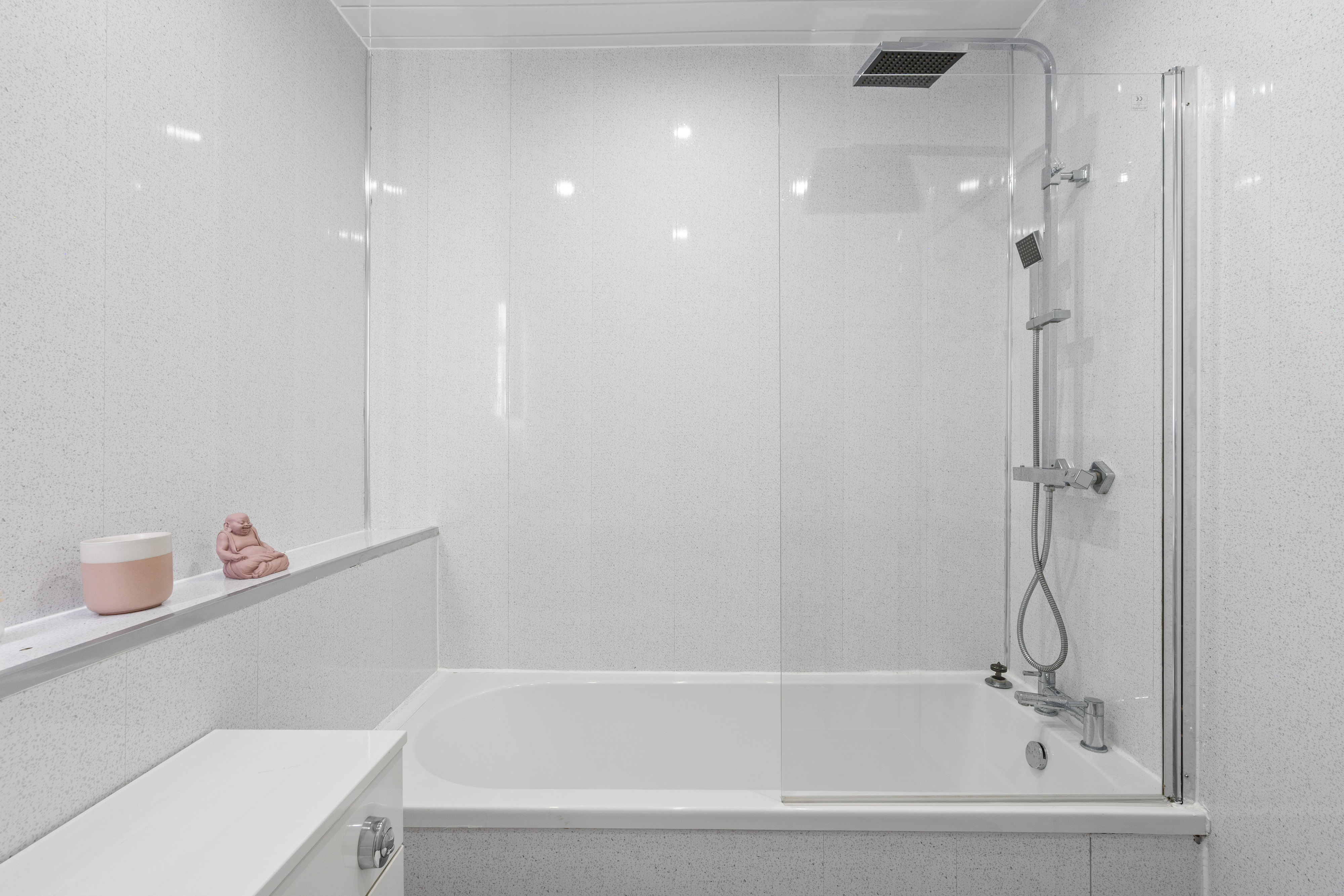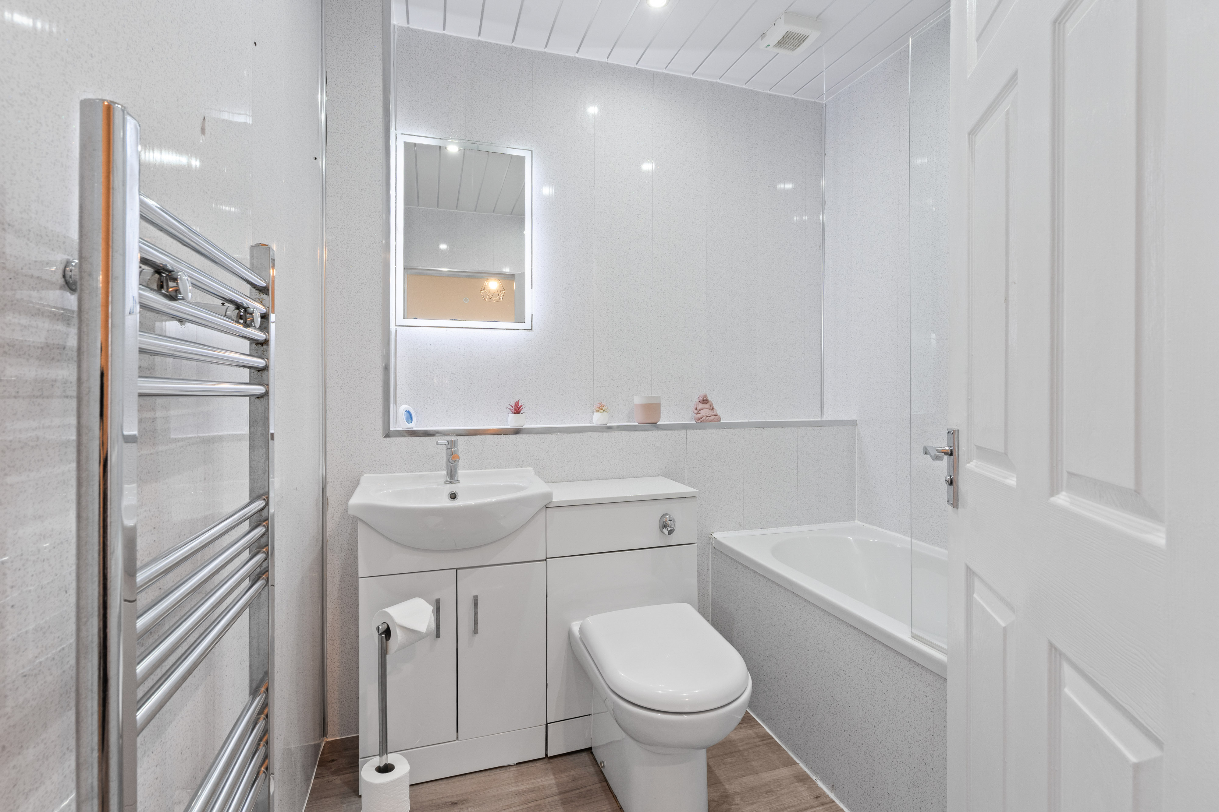 A modern and immaculately presented three-piece bathroom suite finished in crisp white throughout. Full-height gloss wall panels create a clean, low-maintenance finish, complemented by a vanity unit with integrated wash hand basin and WC. The bath features a fitted glass shower screen with overhead rainfall shower, while a chrome heated towel rail and wood-effect flooring complete the contemporary look.