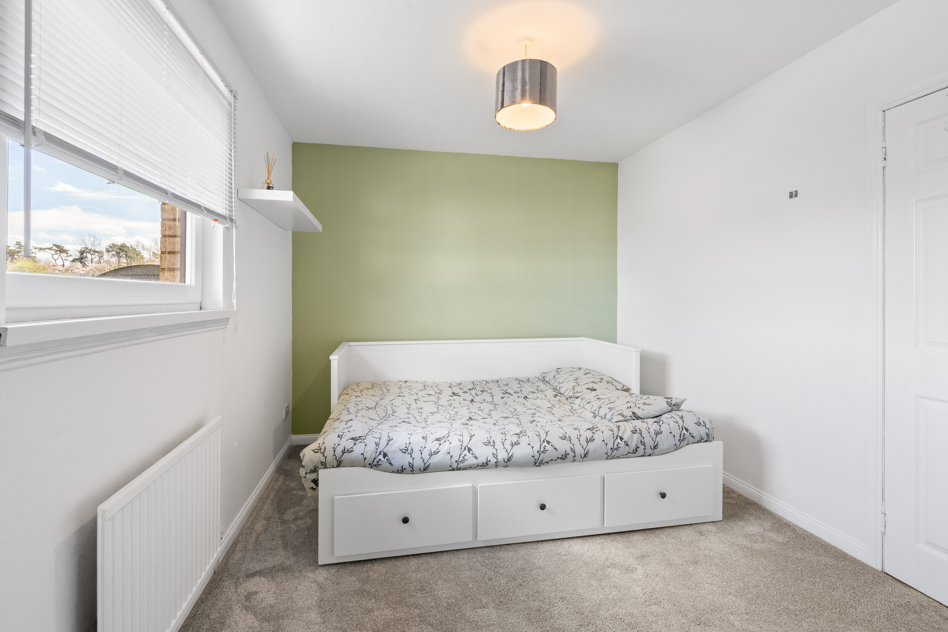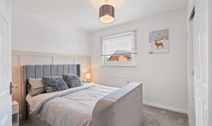 A good-sized rear-facing double bedroom, bright and airy thanks to a generous window with open outlook. A sage green feature wall adds a fresh, contemporary touch against crisp white décor, with soft neutral carpet completing the relaxed feel. Large recessed wardrobe for storage making this a practical and appealing secondary bedroom.