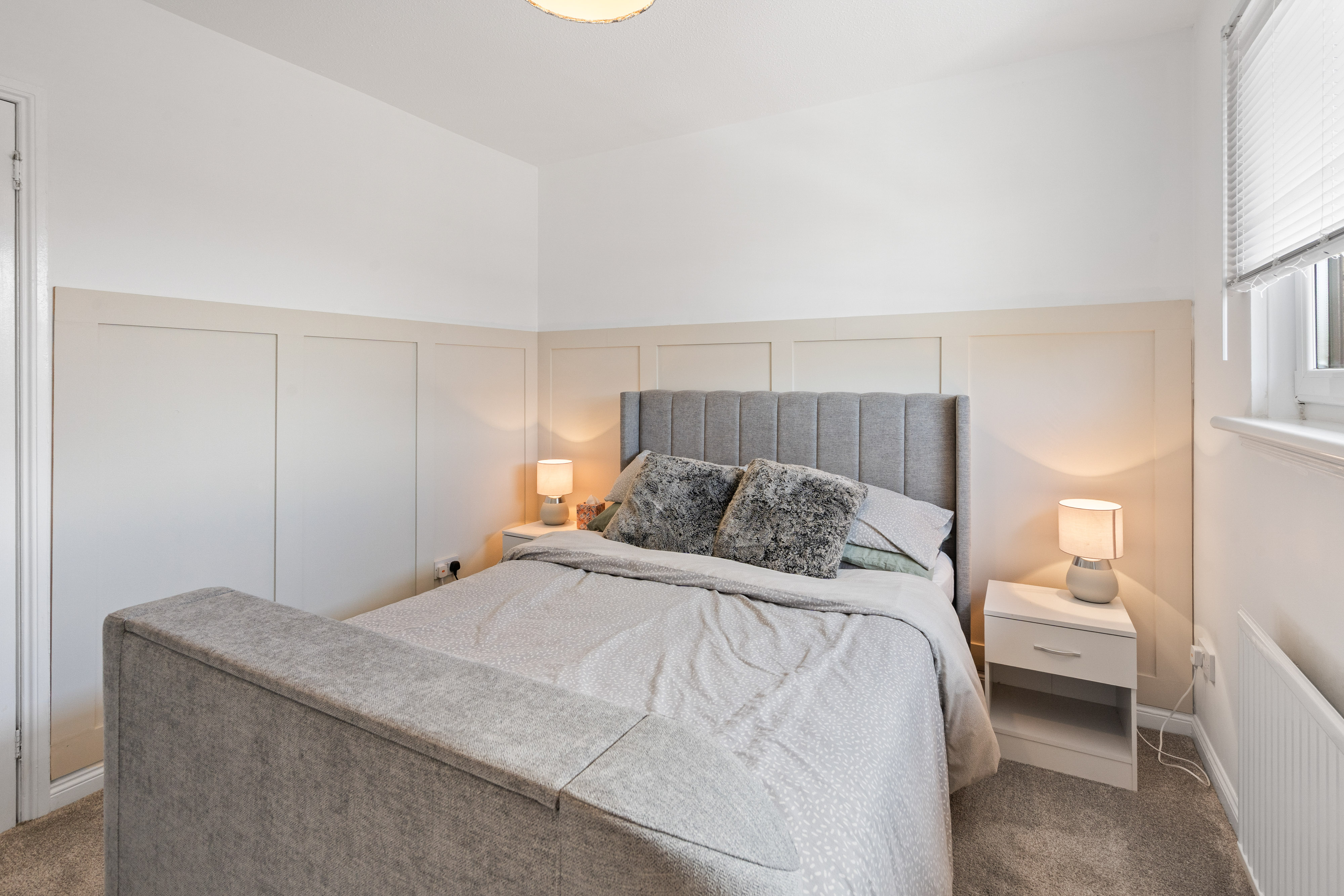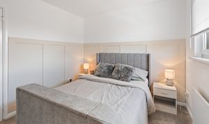 A well-presented double bedroom featuring an elegant two-tone finish with stylish panelling detail to the lower walls, adding a touch of contemporary character. Soft neutral carpet and crisp white upper walls create a calm, restful atmosphere, while a front-facing window allows for good natural light. Comfortably proportioned with fitted wardrobe storage, this is a truly inviting principal bedroom.