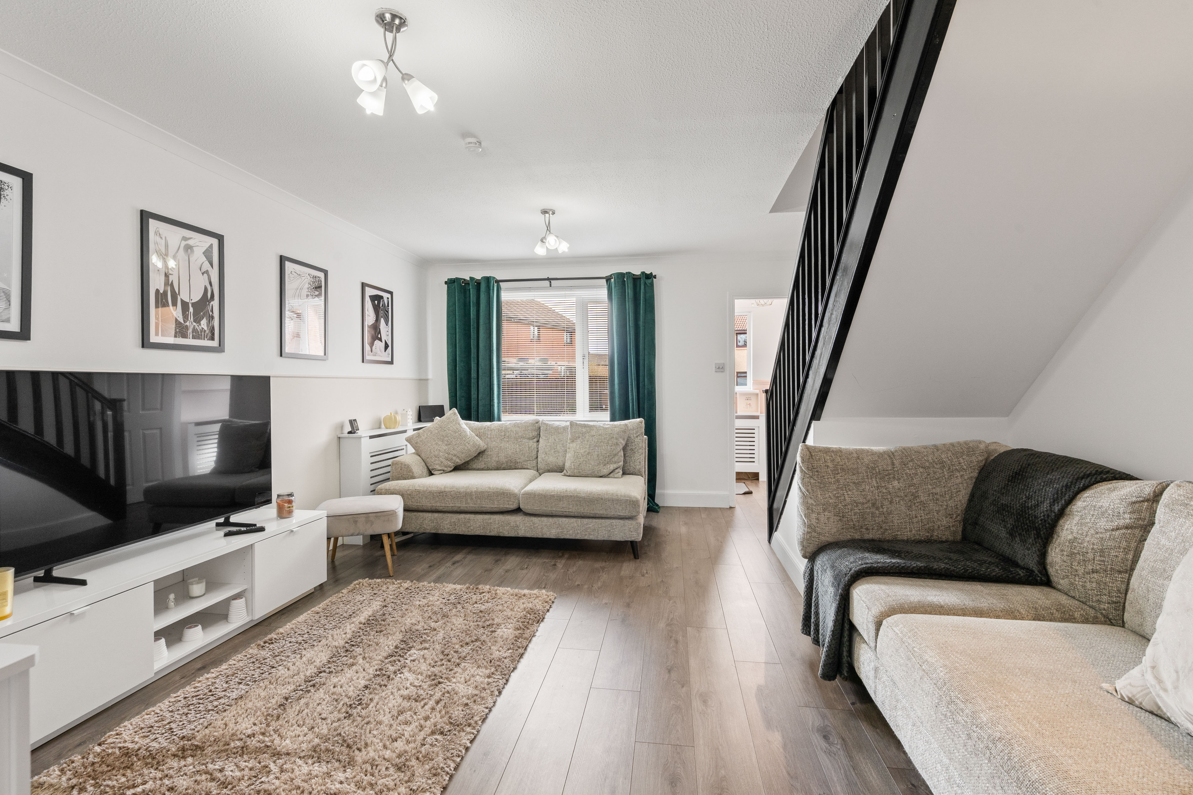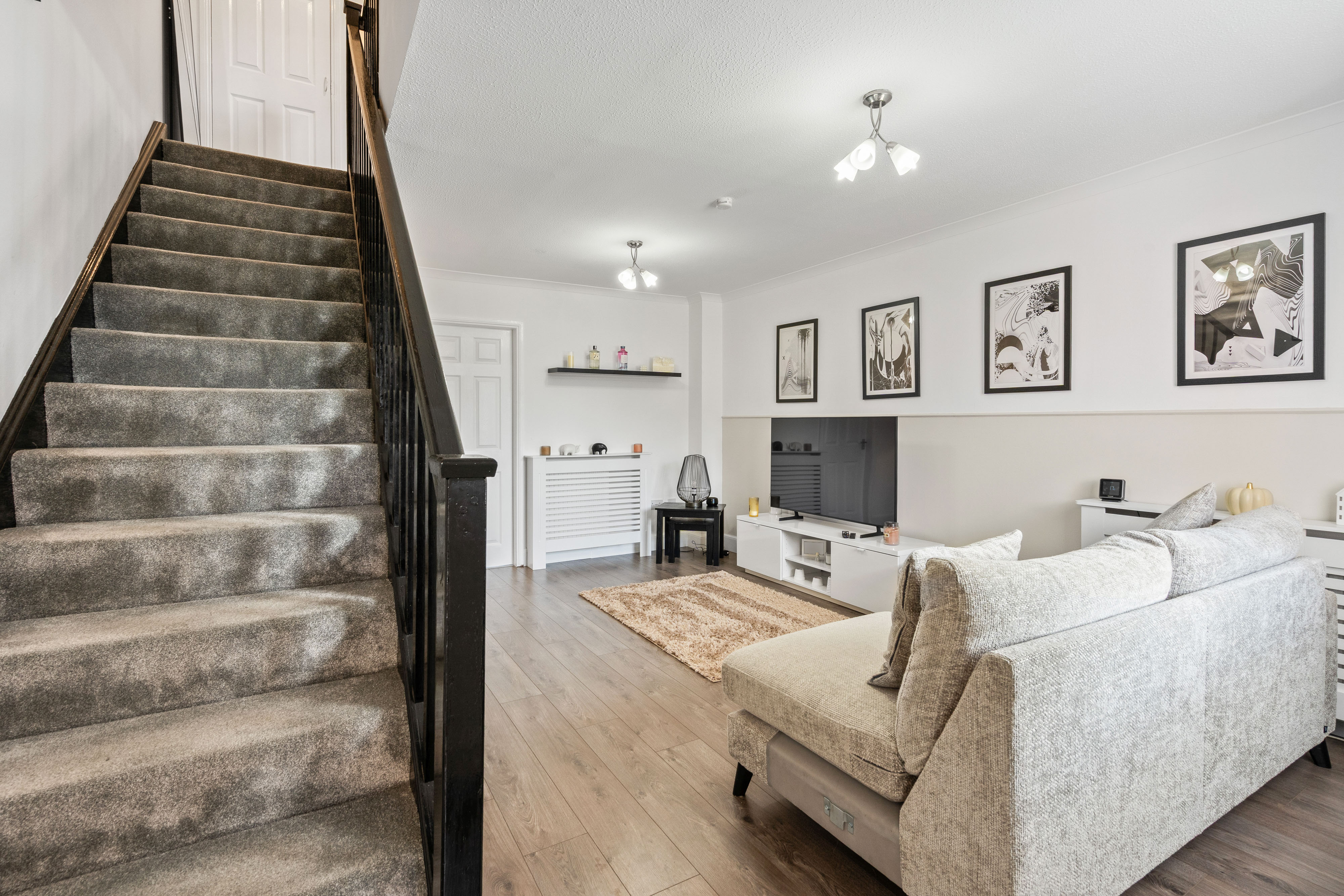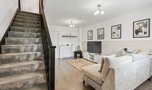 - Bright and spacious lounge with wood-effect flooring and feature staircase