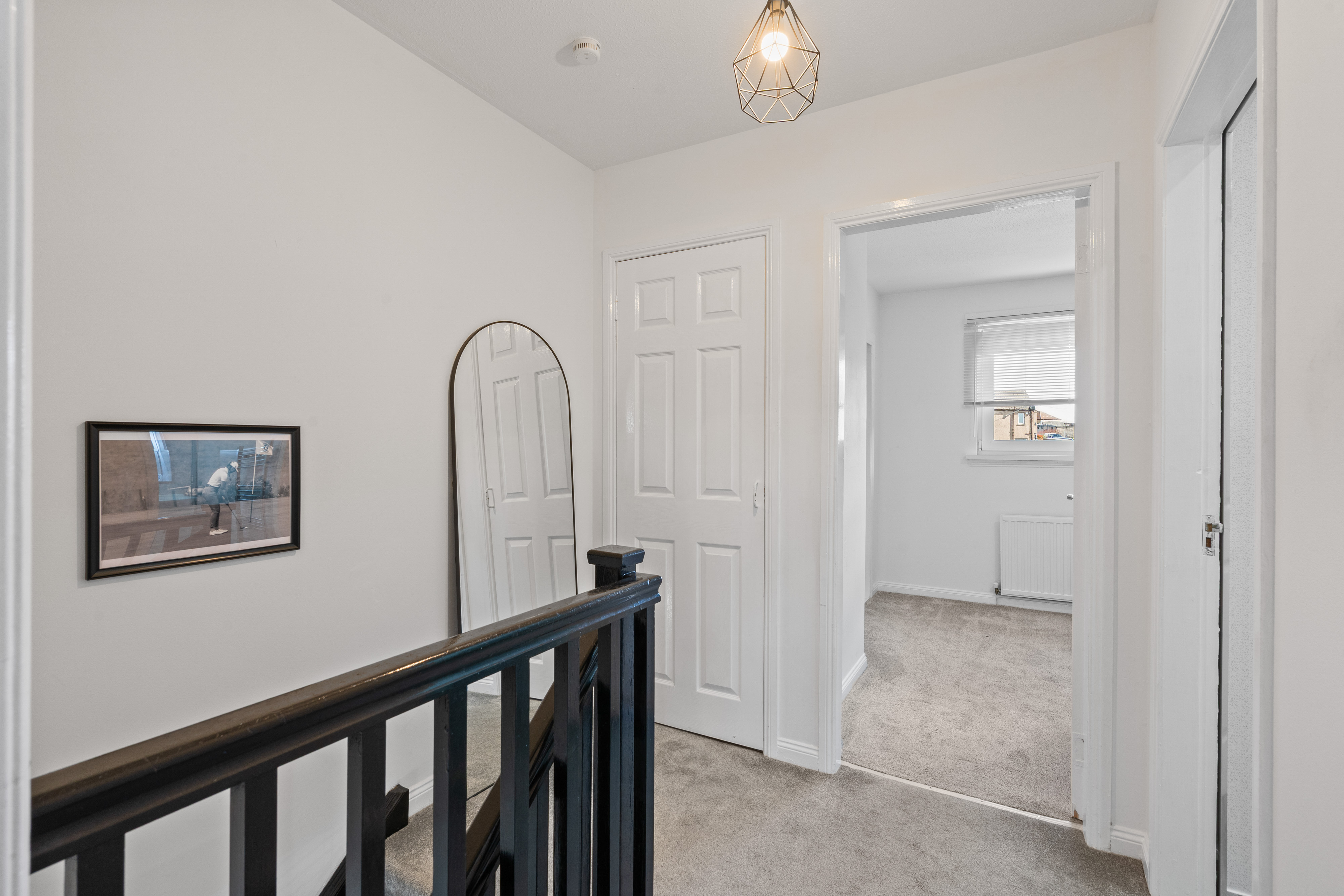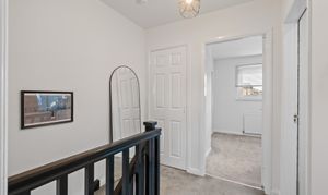 A bright and airy upper landing finished in crisp white throughout, with soft neutral carpet underfoot. The bold black balustrade carries through a consistent design theme from the lounge below. Giving access to all upper floor rooms, and loft space.