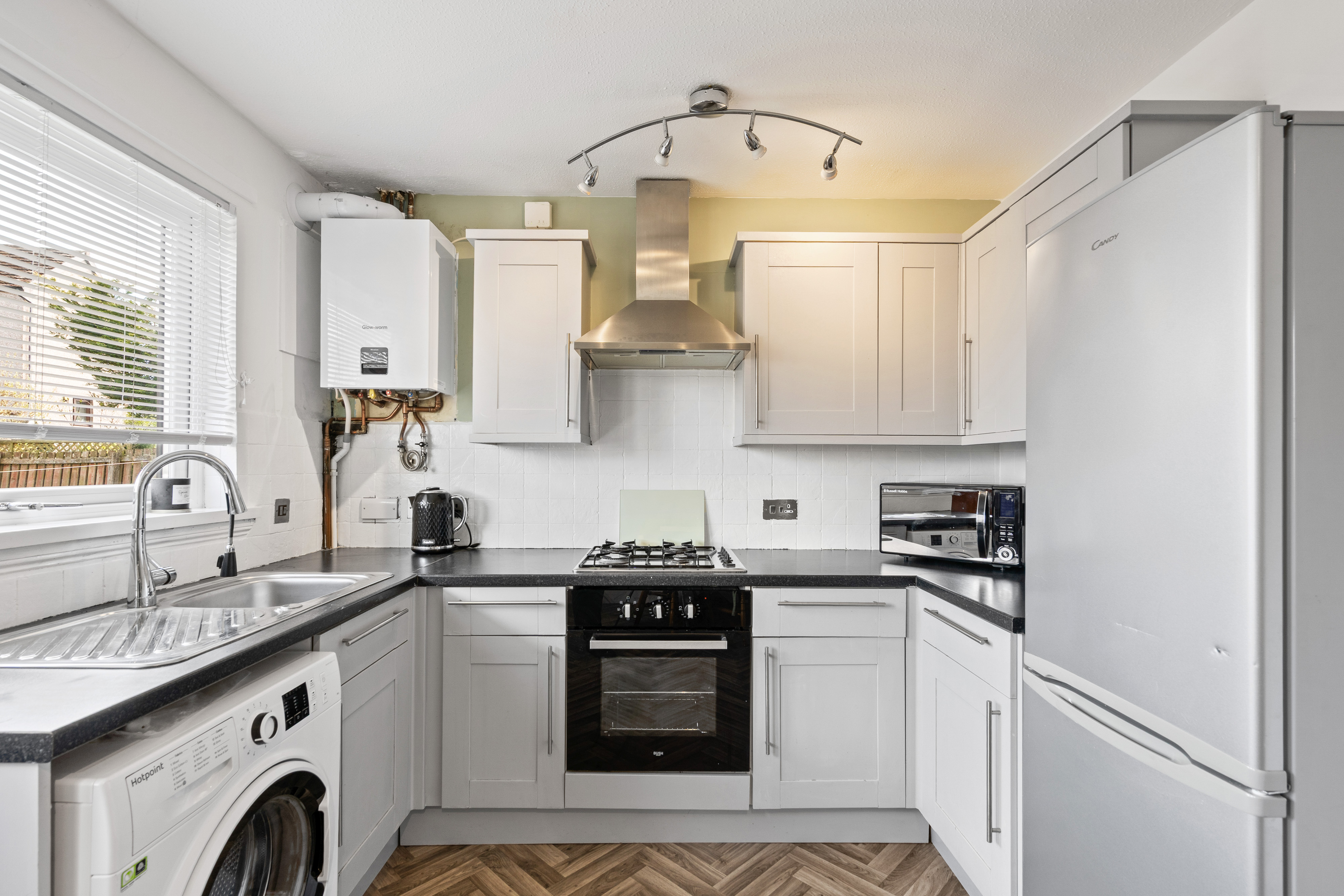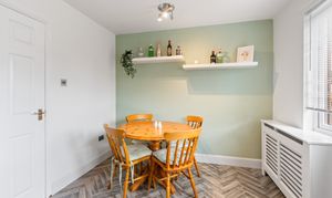 A well-appointed kitchen/diner fitted with grey shaker-style wall and base units, complemented by dark worktops and a classic white tiled splashback. Integrated appliances include a gas hob, oven, and extractor, with space and plumbing for a washing machine. The attractive herringbone-effect flooring adds a stylish touch, while a side window ensures the space feels bright and airy. A dedicated dining area provides a practical and sociable setting for everyday family meals. Access to the rear garden is from here.