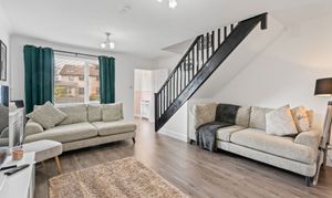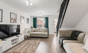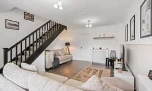 A generously proportioned living room bathed in natural light from a large front-facing window. The open layout is enhanced by a striking staircase with bold black balustrade, while wood-effect flooring and crisp white walls create a fresh, contemporary backdrop. Well-presented throughout and offering a comfortable, versatile space ideal for both relaxing and entertaining.