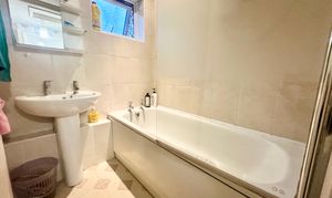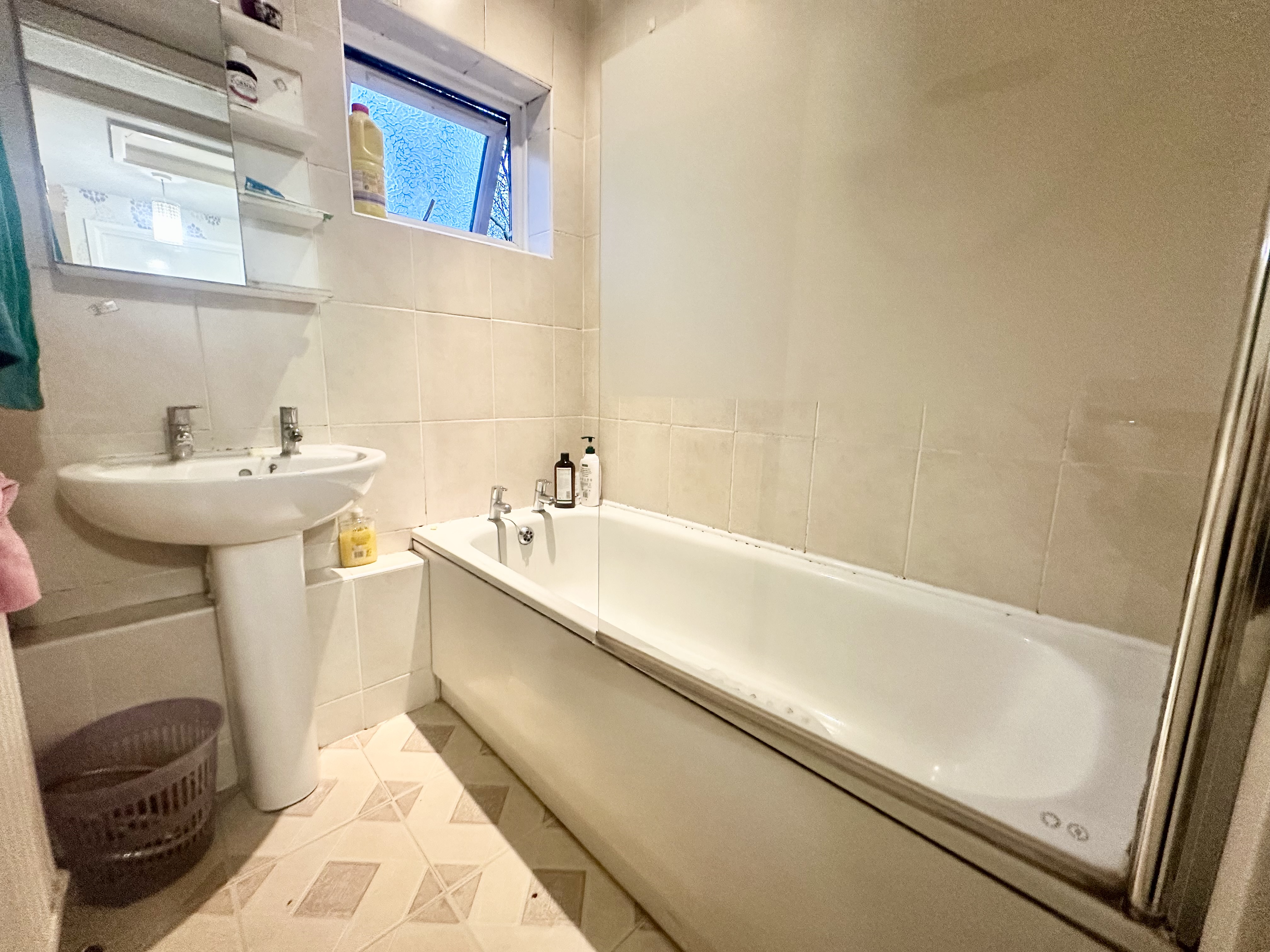 Vinyl flooring, sink basin, bathtub with overhead shower and a upvc double glazed obscured glass window.