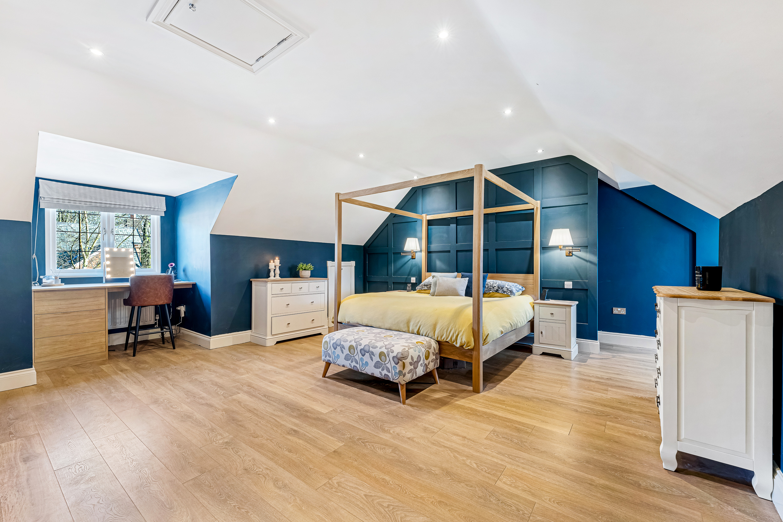 Here, dramatic blue tones pair with a panelled feature wall, which provides a backdrop for a king-sized bed illuminated by elegant wall-mounted reading lamps. There’s also a point for a wall-mounted television opposite for those lazy days. Dual-aspect dormer windows fitted with Roman blinds capture the light, with one equipped with a dressing table.