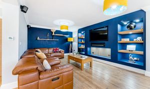 In the lounge area, the coving and roses combine with an ultra-modern media wall painted a bold blue, which features chunky alcove shelving, slat panels, and a multitude of sockets for a traditional meets stylish vibe, while wall speakers elevate movie nights.