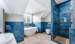 Head behind the panelled wall to discover a cleverly concealed walk-in wardrobe before exploring an en suite lined with stunning sea-blue metro tiles. A fabulous freestanding bathtub fills the final dormer window, while a tiled wall and glass screen frame a stunning, open walk-in rainfall shower with a separate handheld attachment, herringbone floor, and integrated seat next to the heated towel rail. Brushed copper tapware and fittings also finish a wall-hung toilet and a high-spec vanity unit with a countertop basin and backlit mirror.