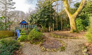 Stone walls and steps guide you down to the enchanting ‘secret garden’ – a sprawling, gravelled woodland area designed for adventure. Here, a tree swing sways beneath the canopy, and there’s ample room for a playhouse, slide, hide-and-seek games, den building, and tree climbing. Whether hosting lively gatherings or unwinding in total tranquillity, this remarkable outdoor space offers something for everyone.