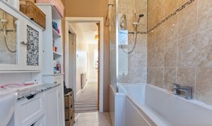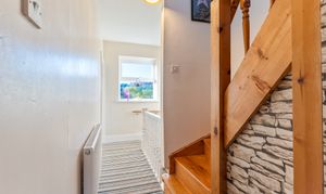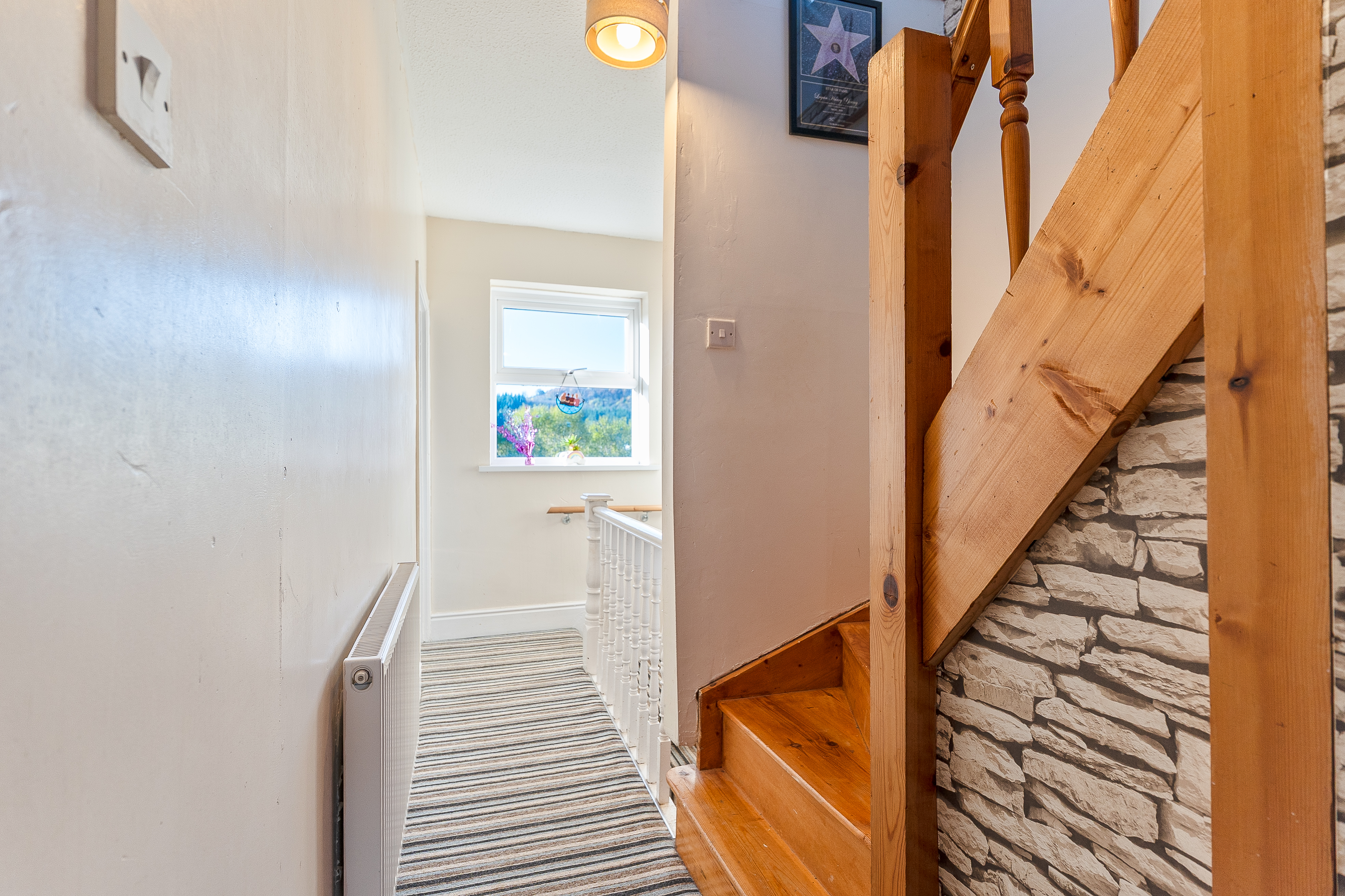 On the first floor are two well-proportioned double bedrooms, each offering comfortable accommodation and elevated views. The family bathroom serves this level, fitted with a three-piece suite. From the landing, stairs lead up to the loft room, which is carpeted and plastered with two Velux windows. Currently used as a bedroom, this versatile space offers excellent potential as a guest room, home office, or hobby room.