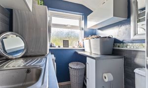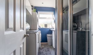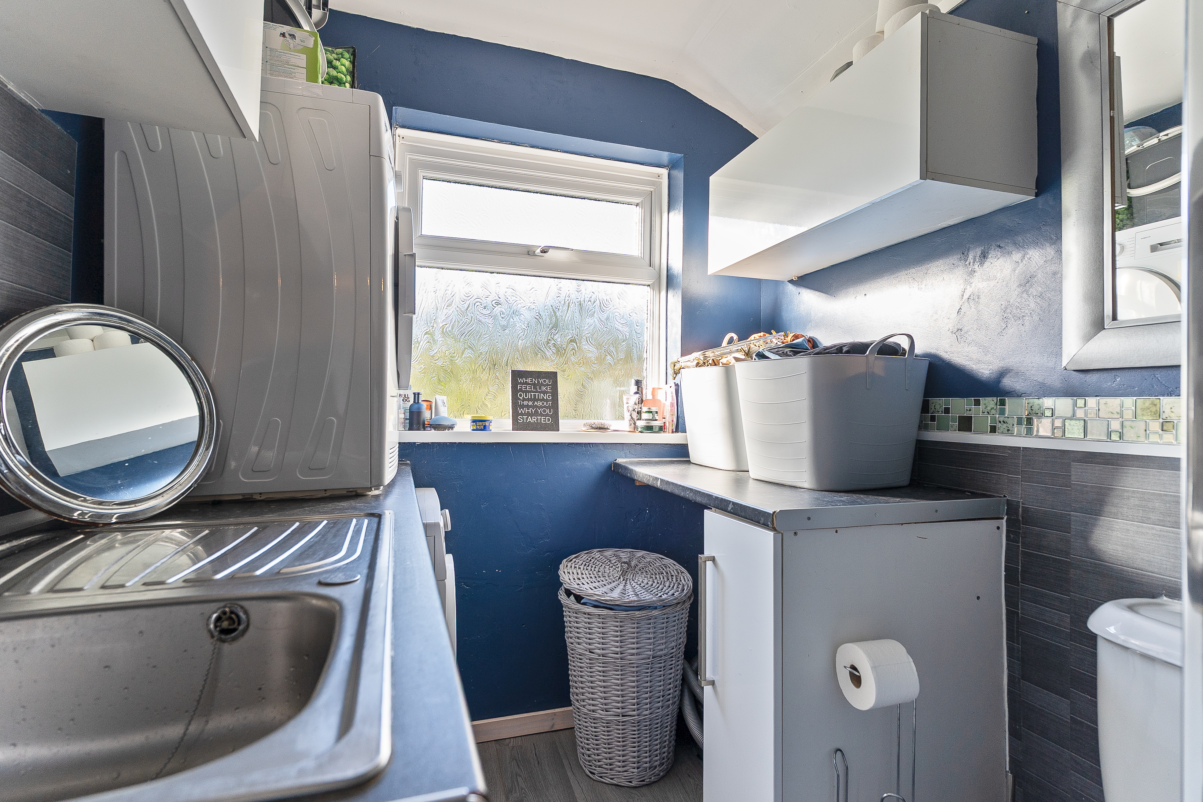 You enter through a welcoming hallway with stairs ahead and access into the main living area on the left. The spacious open-plan lounge/diner enjoys tall ceilings and generous natural light, offering plenty of space for comfortable seating and dining, complemented by a charming log burner that adds warmth and character to the room. Patio doors at the rear open directly onto the garden, creating a seamless link between indoor and outdoor living. From the dining area, you have access into the modern galley-style kitchen, well fitted with practical worktop and storage space. To the rear of the kitchen sits a useful utility/shower room, adding further convenience to the ground floor layout.