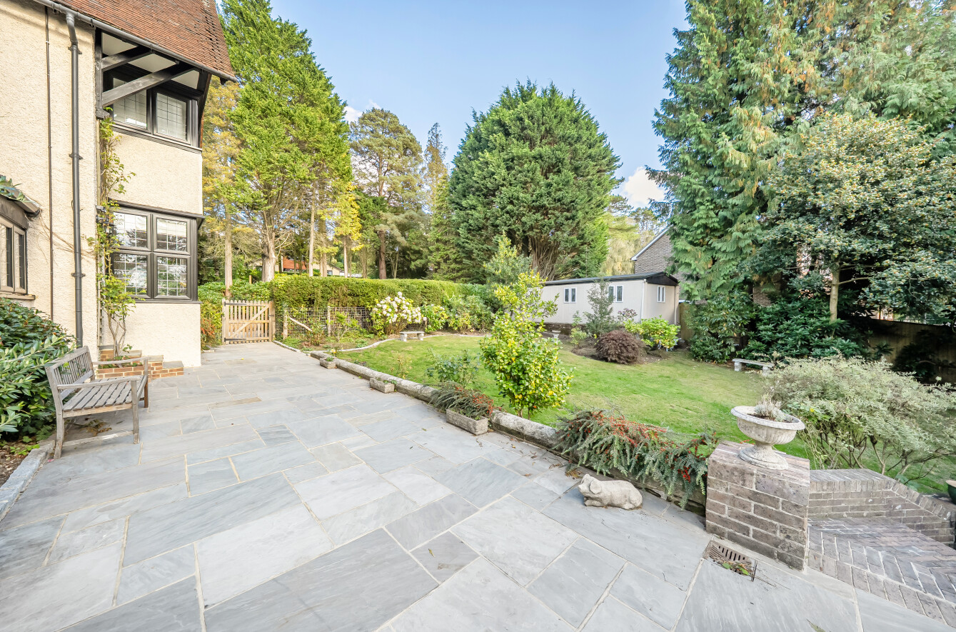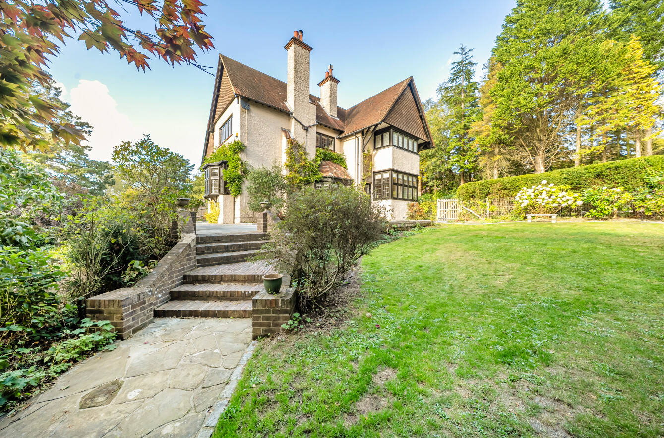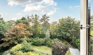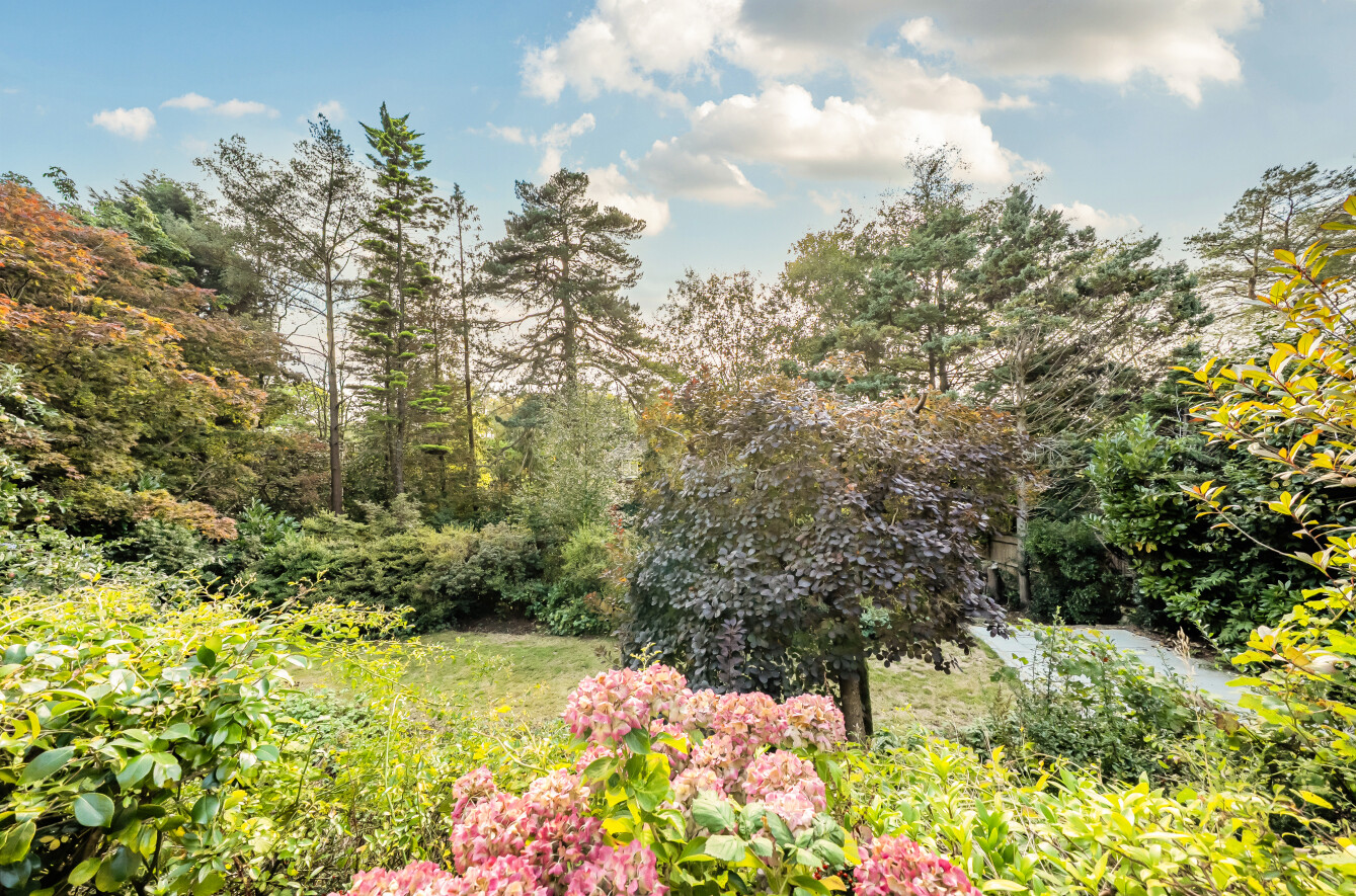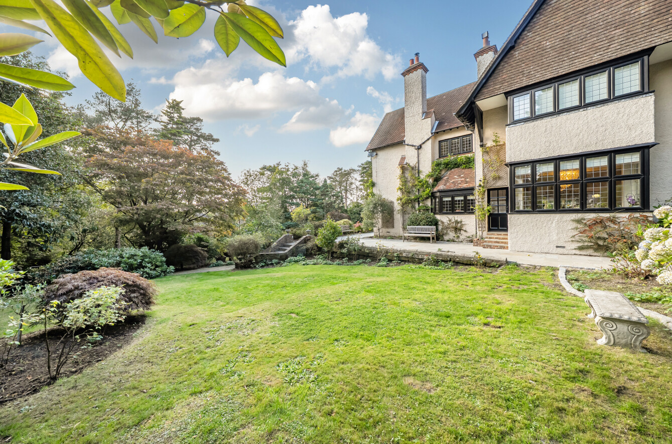 Outside, the driveway winds through a bank of mature rhododendrons and provides parking for at least five cars and a tandem garage for two more with an electric door. The rear gardens are thoughtfully landscaped, wrapping around the side and rear of the house and featuring a large patio leading on to a lawned garden and several terraces which are well-stocked with a variety of established shrubs, perennials and trees such as azaleas, camellias and of course rhododendrons. At the far end of the garden, is a summer house, tucked away in a private spot.