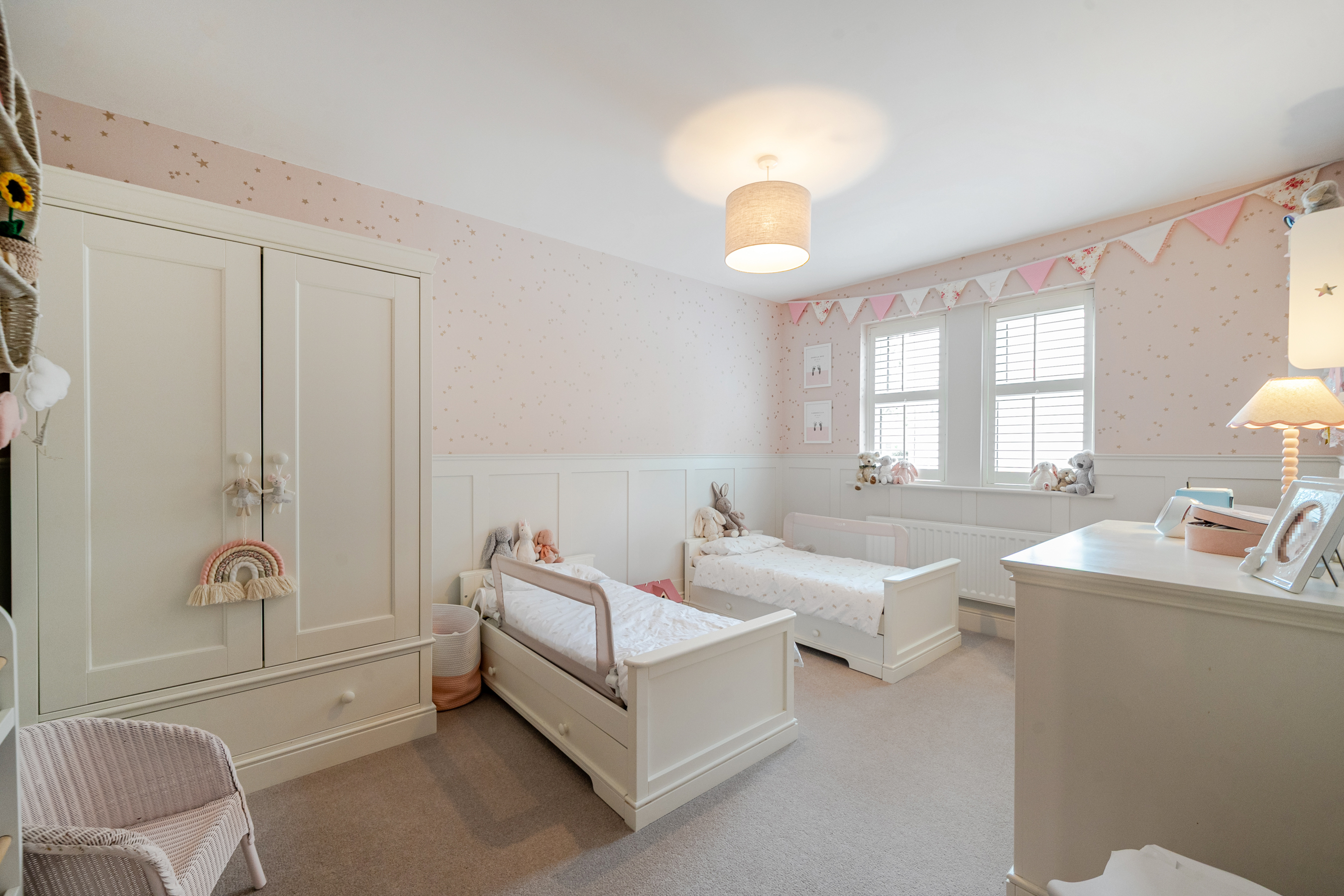 Third bedroom with window shutters served by a modern house bathroom with heated towel rail. The landing provides linen storage and boiler cupboard and access to the loft with useful storage can be found here.
