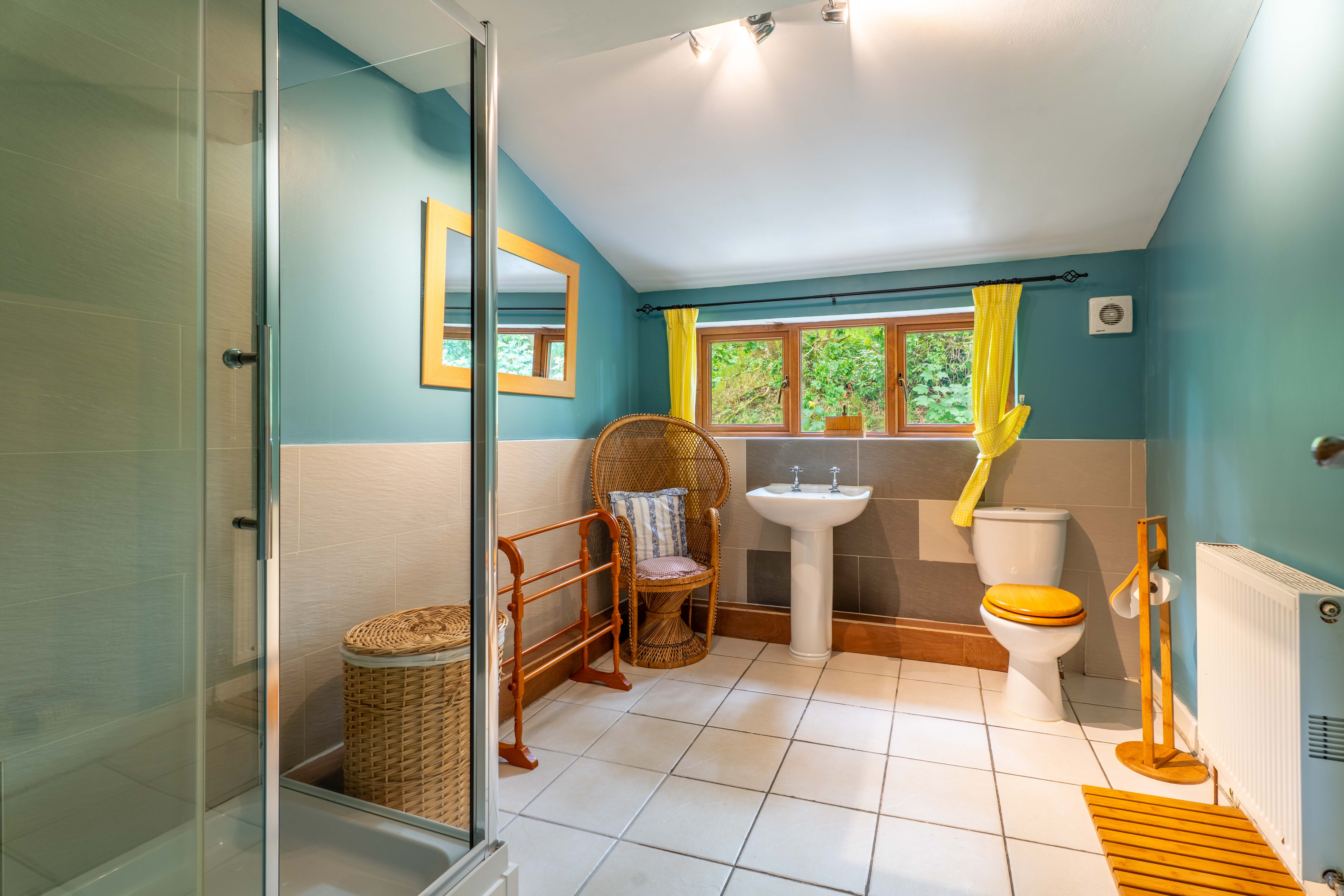 A fabulous white suite with separate walk in shower cubicle, pedestal wash hand basin and low level wc. Tiling to walls and flooring. Windows inviting the ‘outside in’.