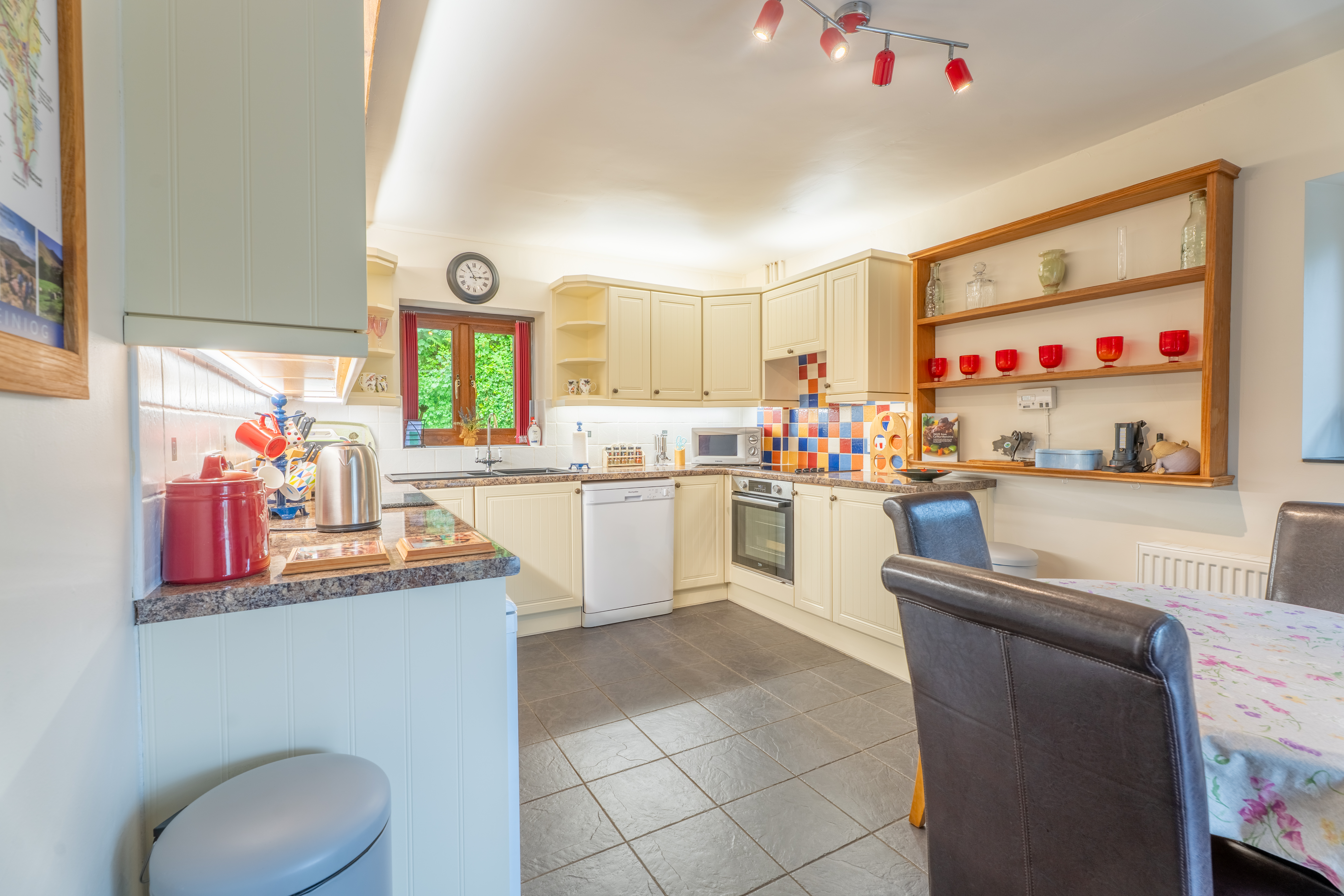 With triple aspect windows, tiling to floors and splash backs, with a range cabinetry and base cupboards with work surfacing over, sink with mixer tap, electric oven with ceramic hob, space for appliances and ample space for dining table and chairs.