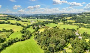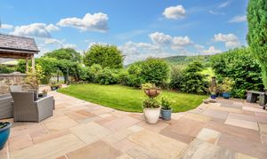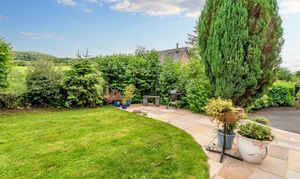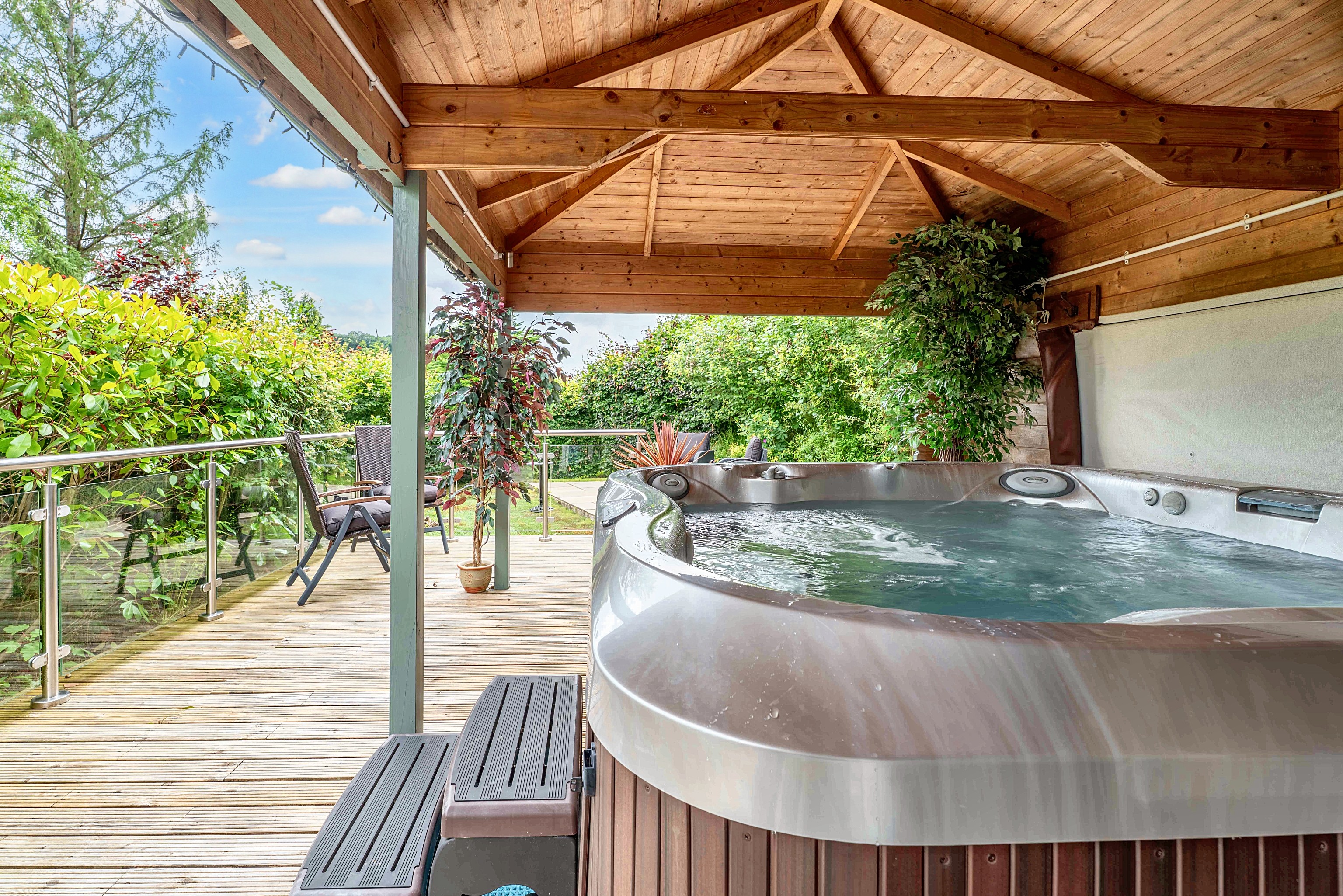- 'Secret garden' with hot tub and summerhouse.Terraces with views: One with stone and slate firepit with ample seating and the other decked terrace with views over the lower lawn, fields and river.