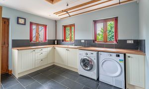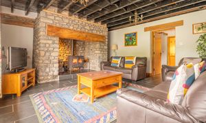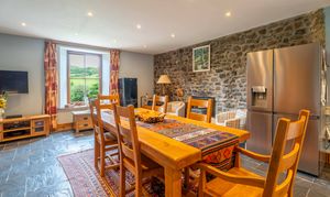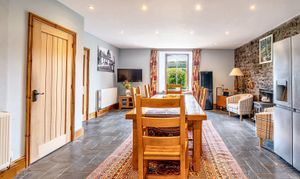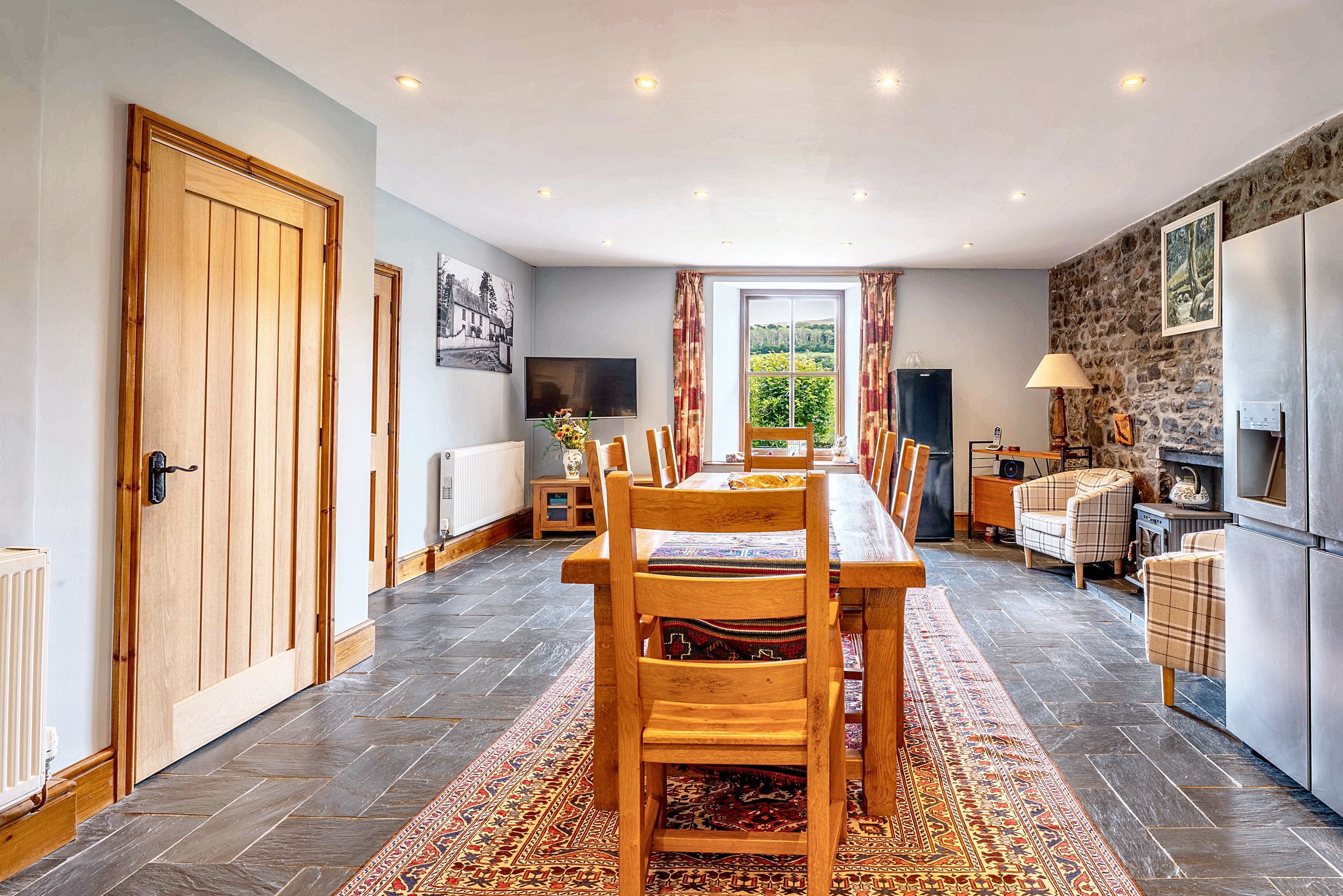 The dining kitchen, complete with wonderful oil fired Stanley oven has a lovely farmhouse kitchen vibe, with ample space for a large dining table, a range of cabinetry, work surfacing over, oven and electric hob and extractor, Butlers sink, mixer tap, display cabinetry and dual aspect windows. Log burner, inset spotlighting, tiling to splash backs, exposed stone wall, Welsh slate flooring. An excellent option for entertaining and socialising and is very much the heart of this family home.