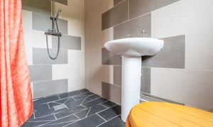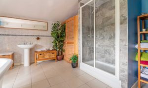 Ample proportions allowing for a space to relax. A white suite with walk-in shower cubicle housing shower, pedestal wash hand basin. Towel radiator and low level WC.