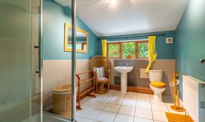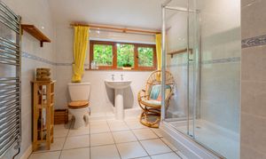 Velux window enabling natural light to cascade through. White suite to comprise: Walk in shower, hand wash basin and low level wc. Exposed beams and tiling to floor.
